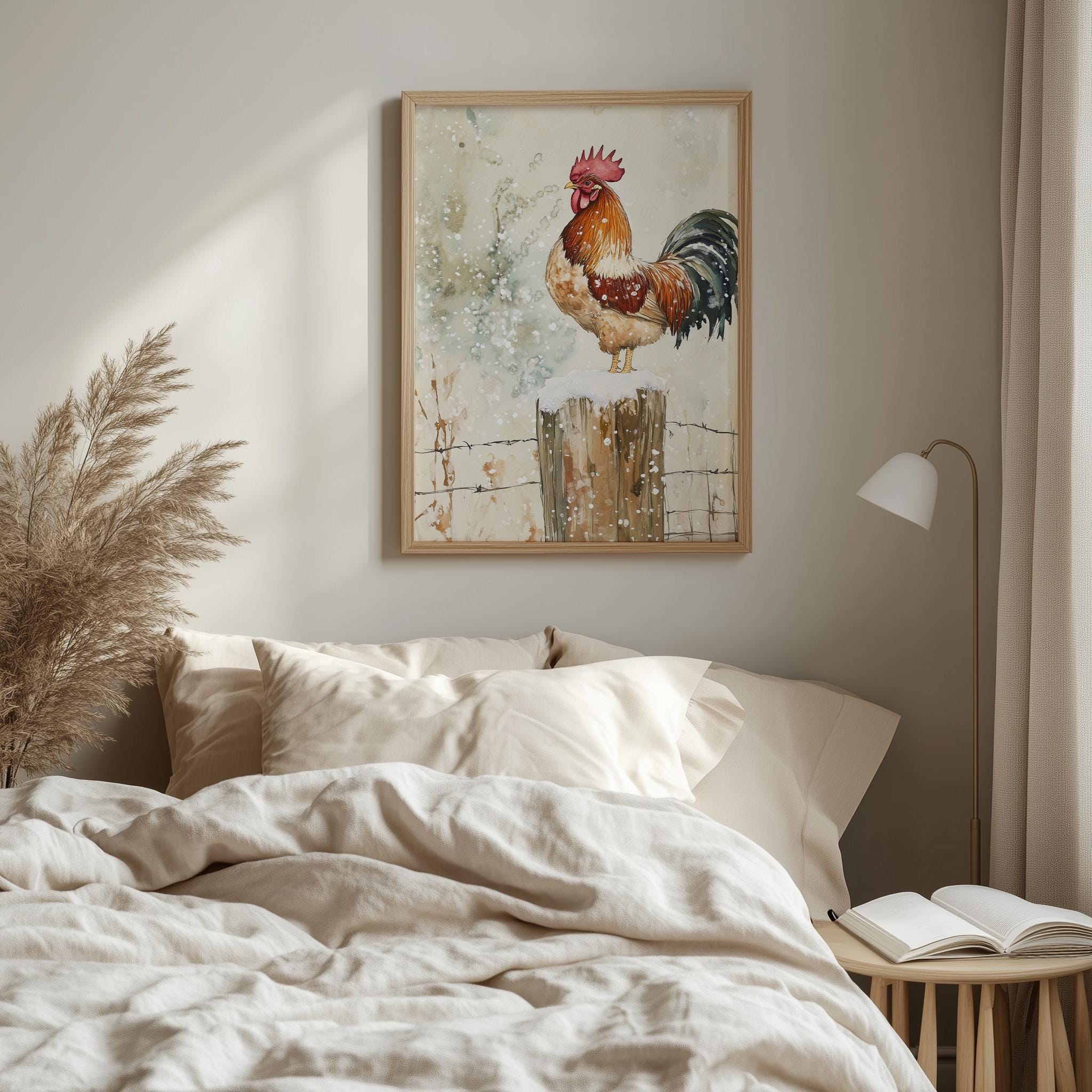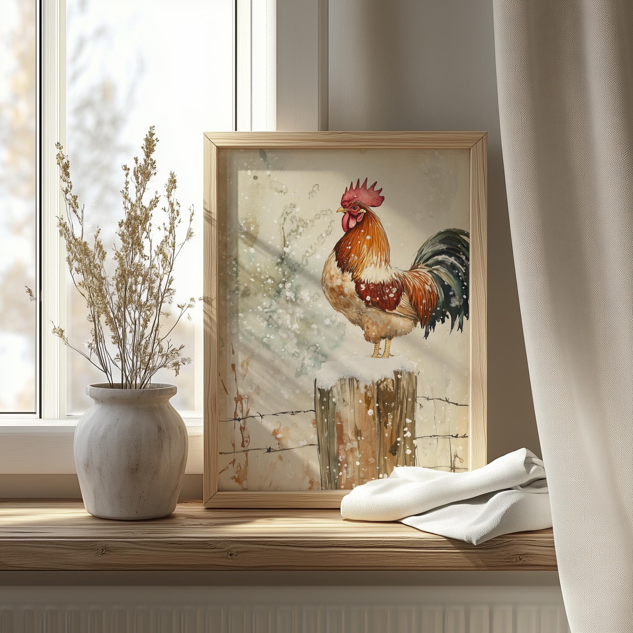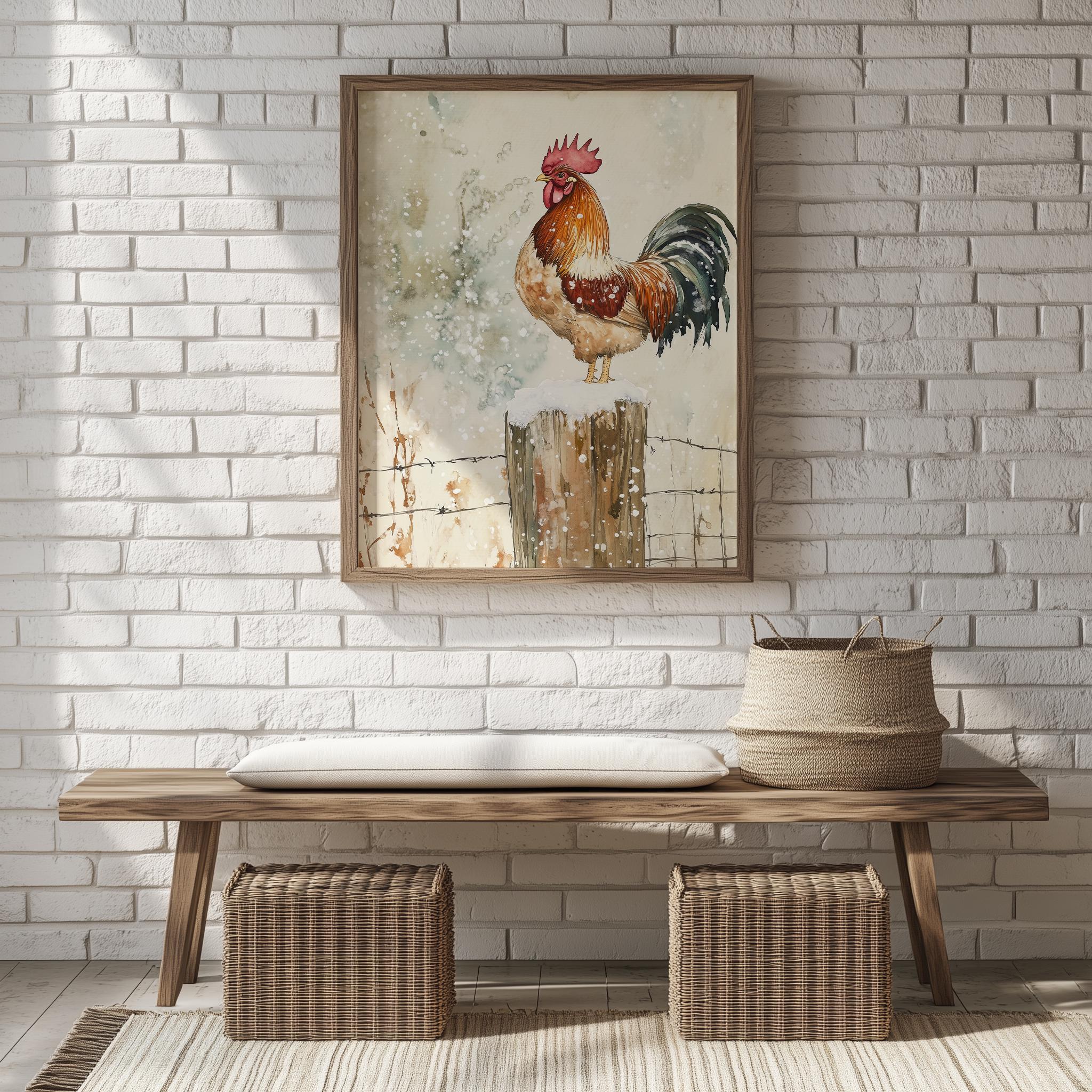 Immerse yourself in the charm with this rustic painting of a proud rooster perched on a snow-covered fence post, surrounded by a serene winter landscape.