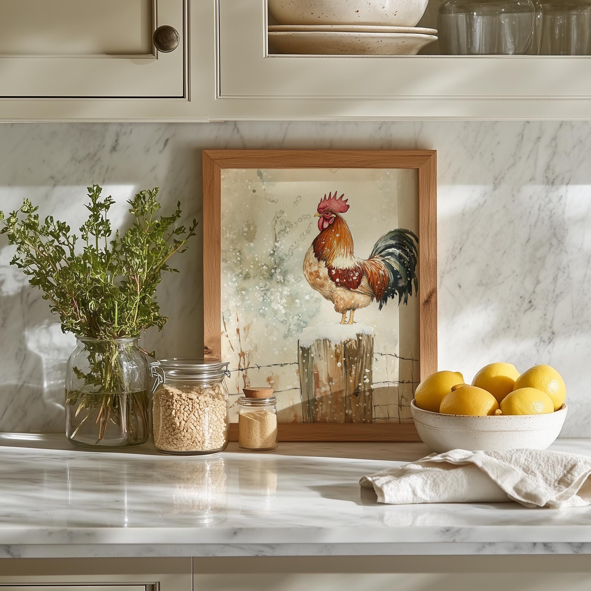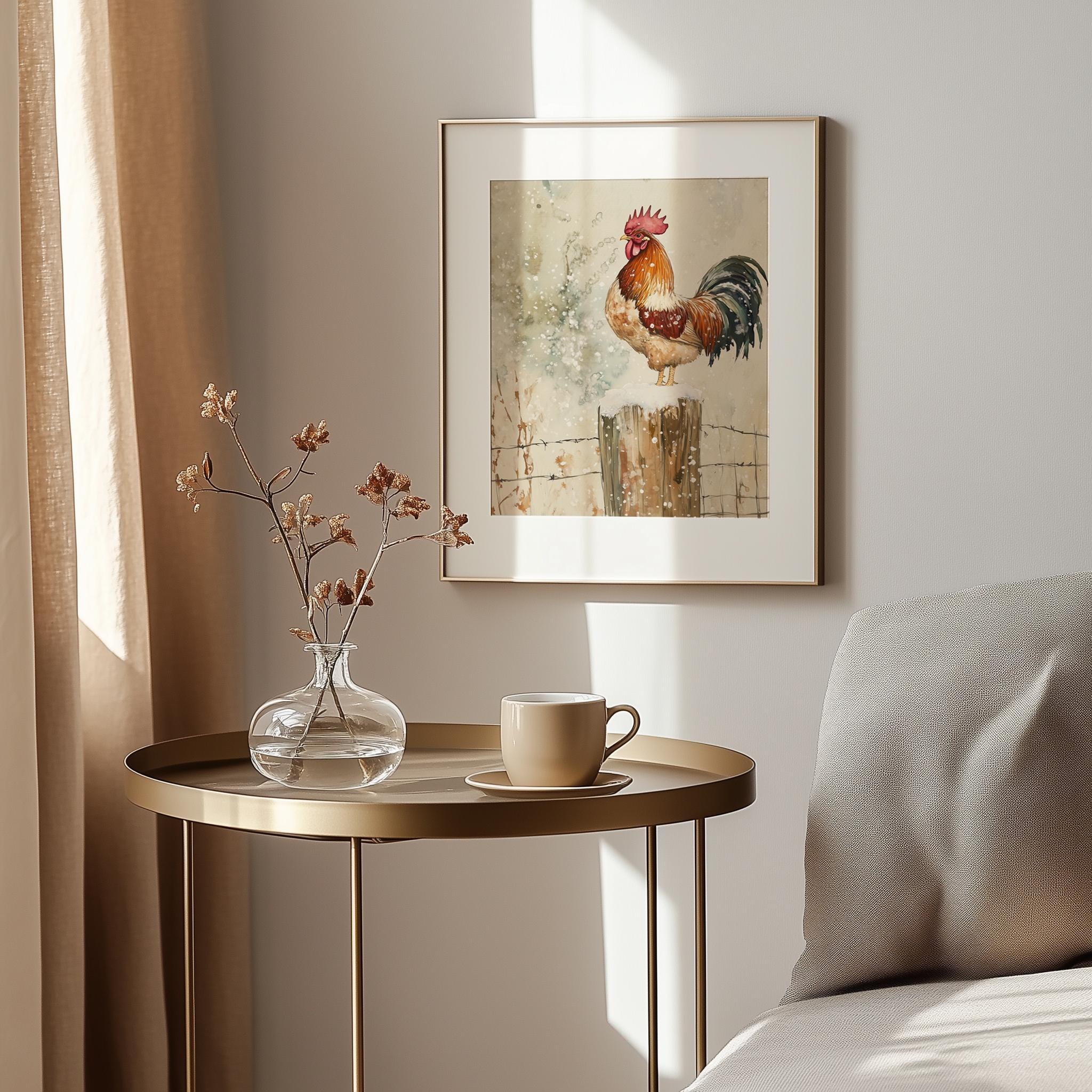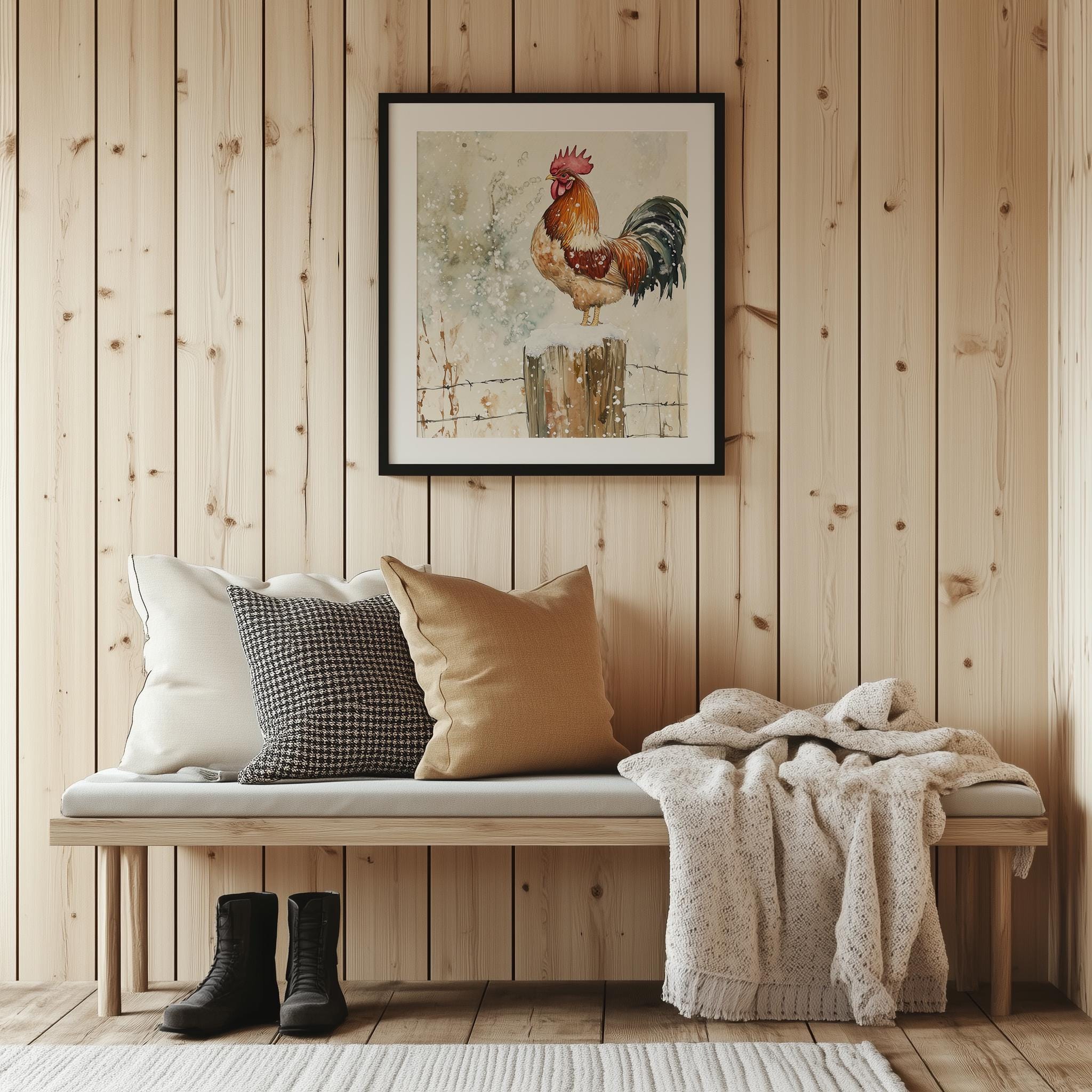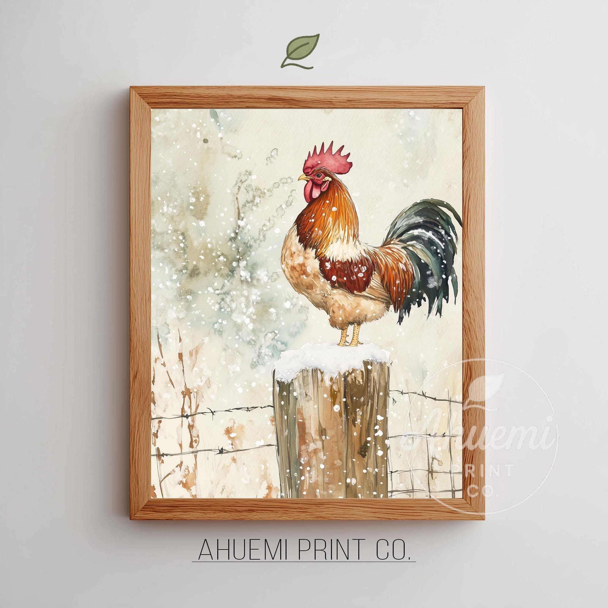 Immerse yourself in the charm with this rustic painting of a proud rooster perched on a snow-covered fence post, surrounded by a serene winter landscape.