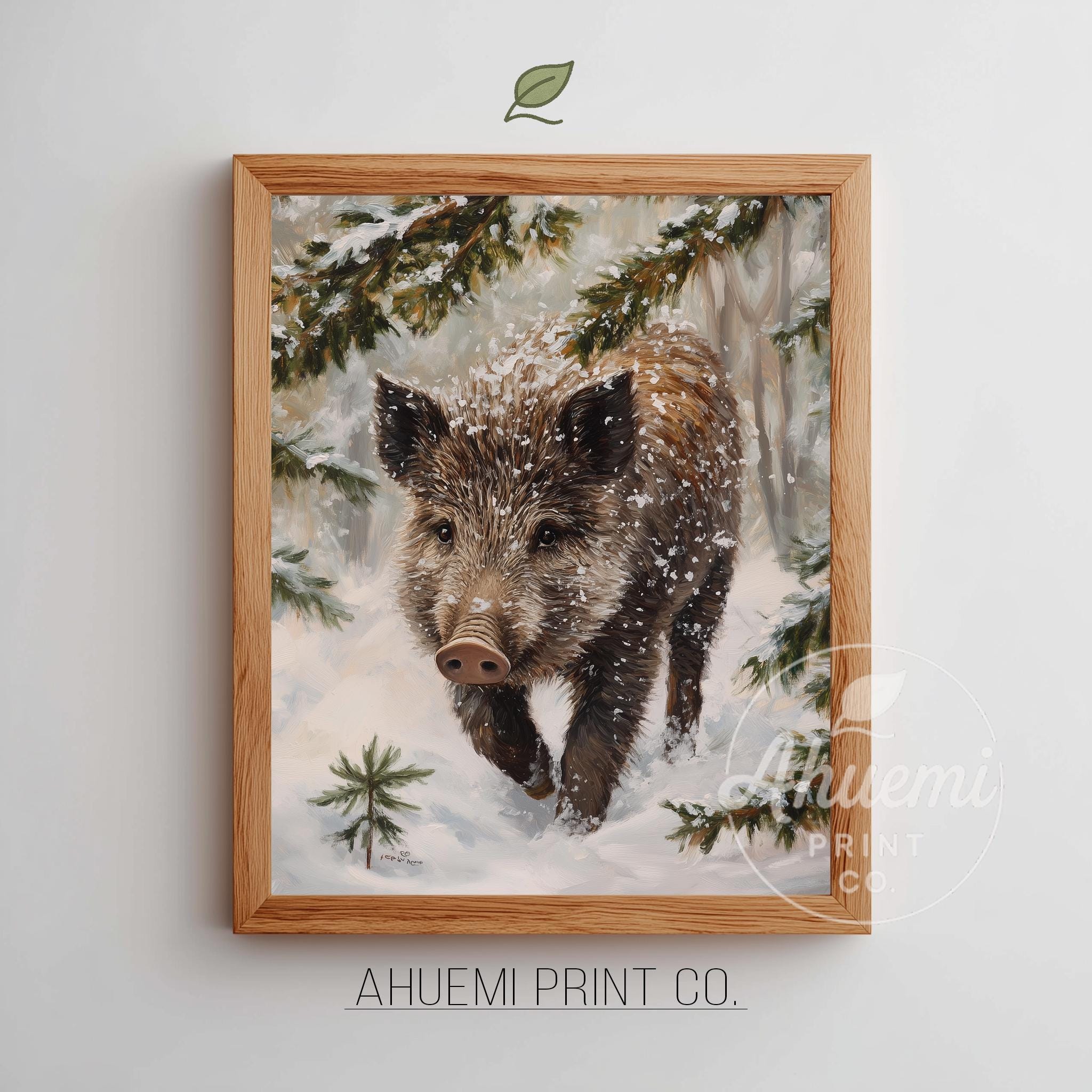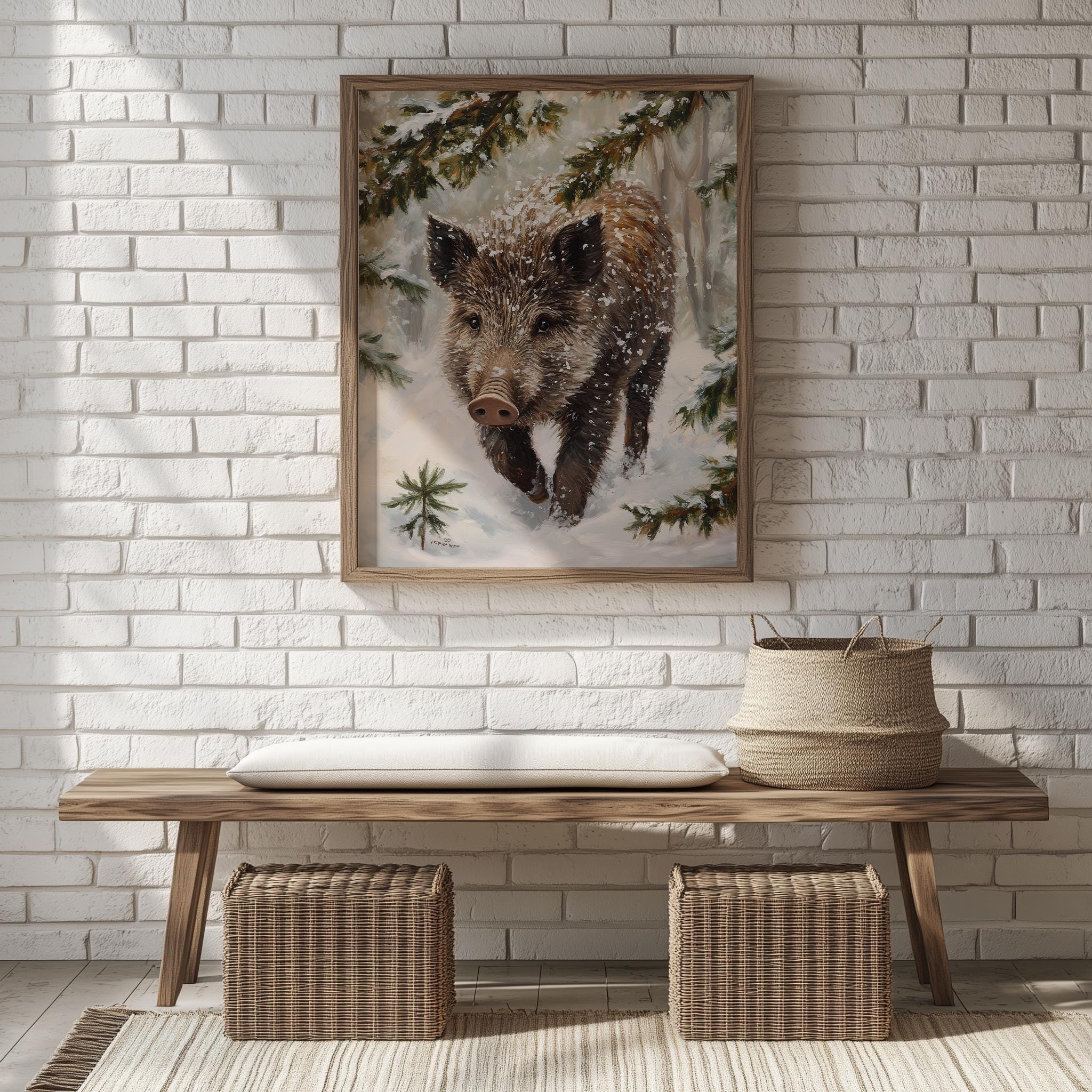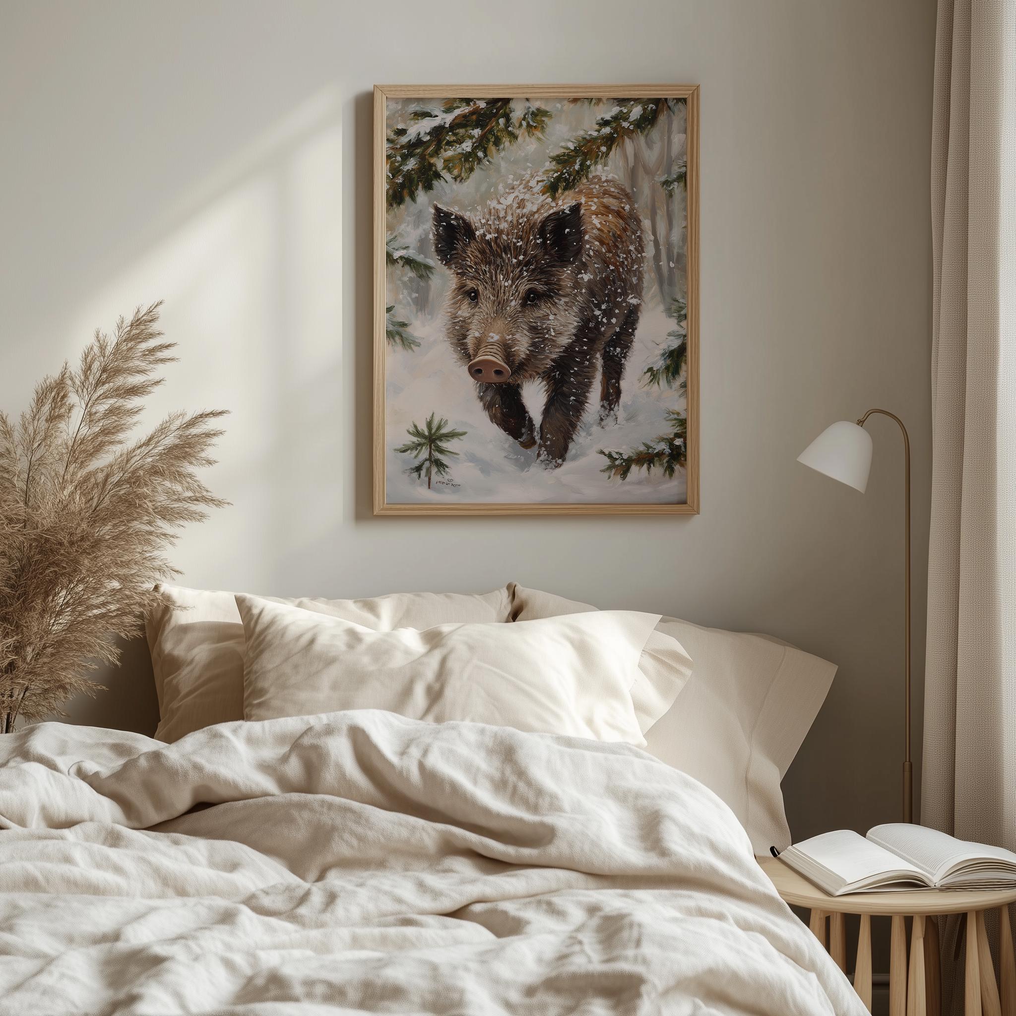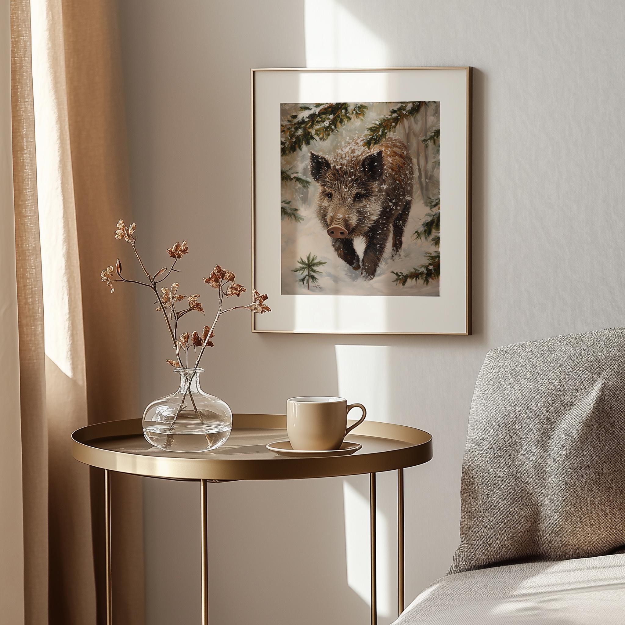 Immerse yourself in the charm with this rustic painting of a wild boar piglet gracefully rooting through a blanket of soft, glistening snow.