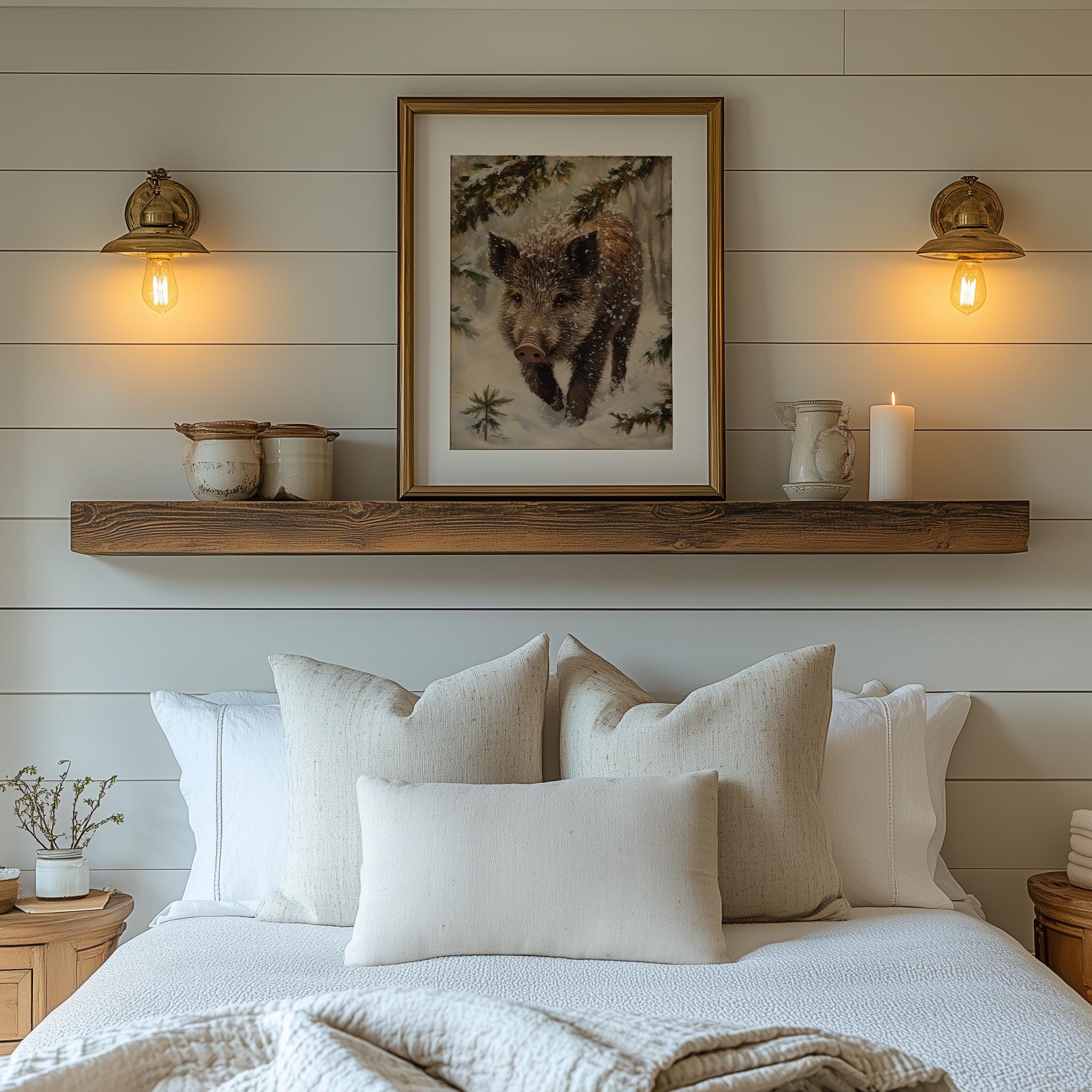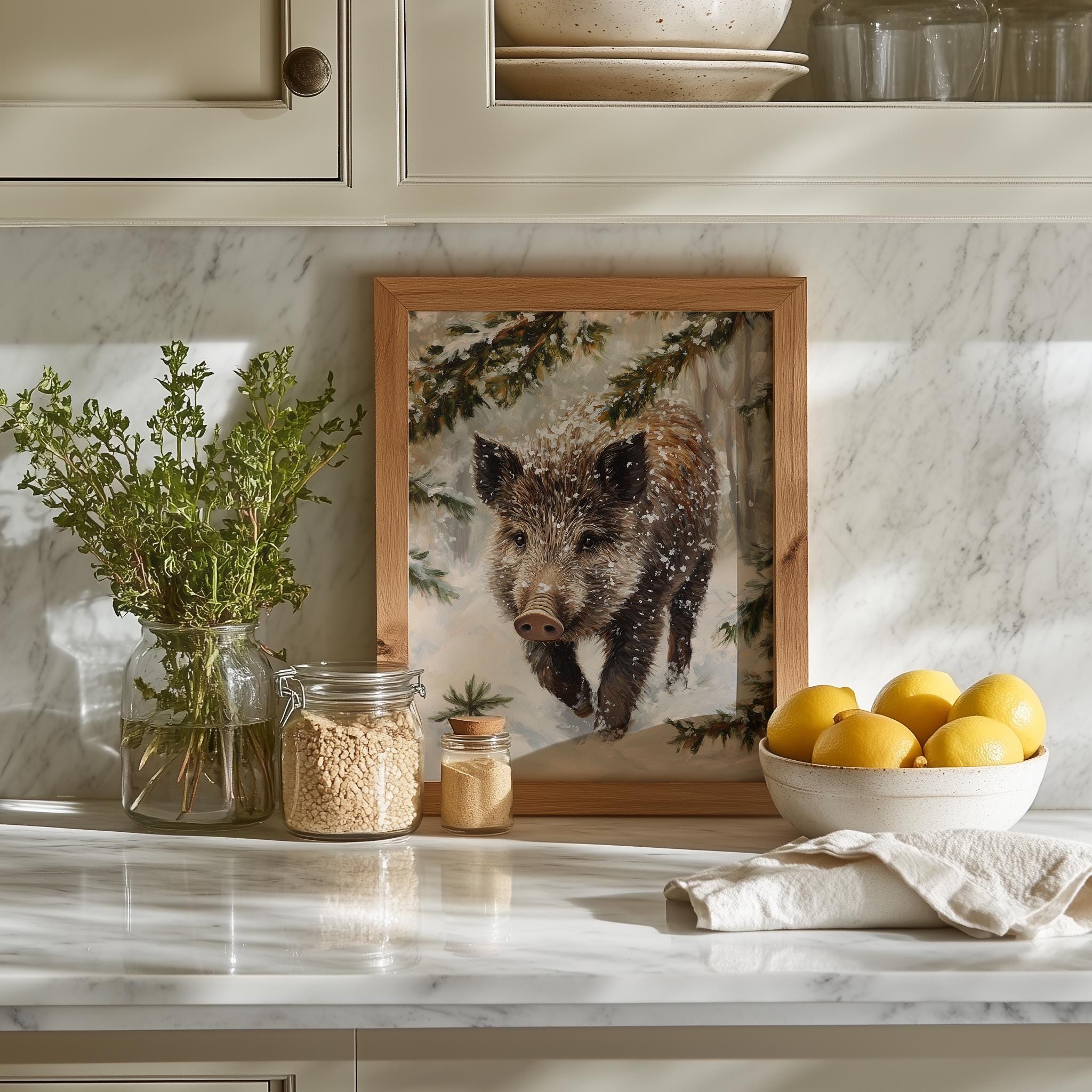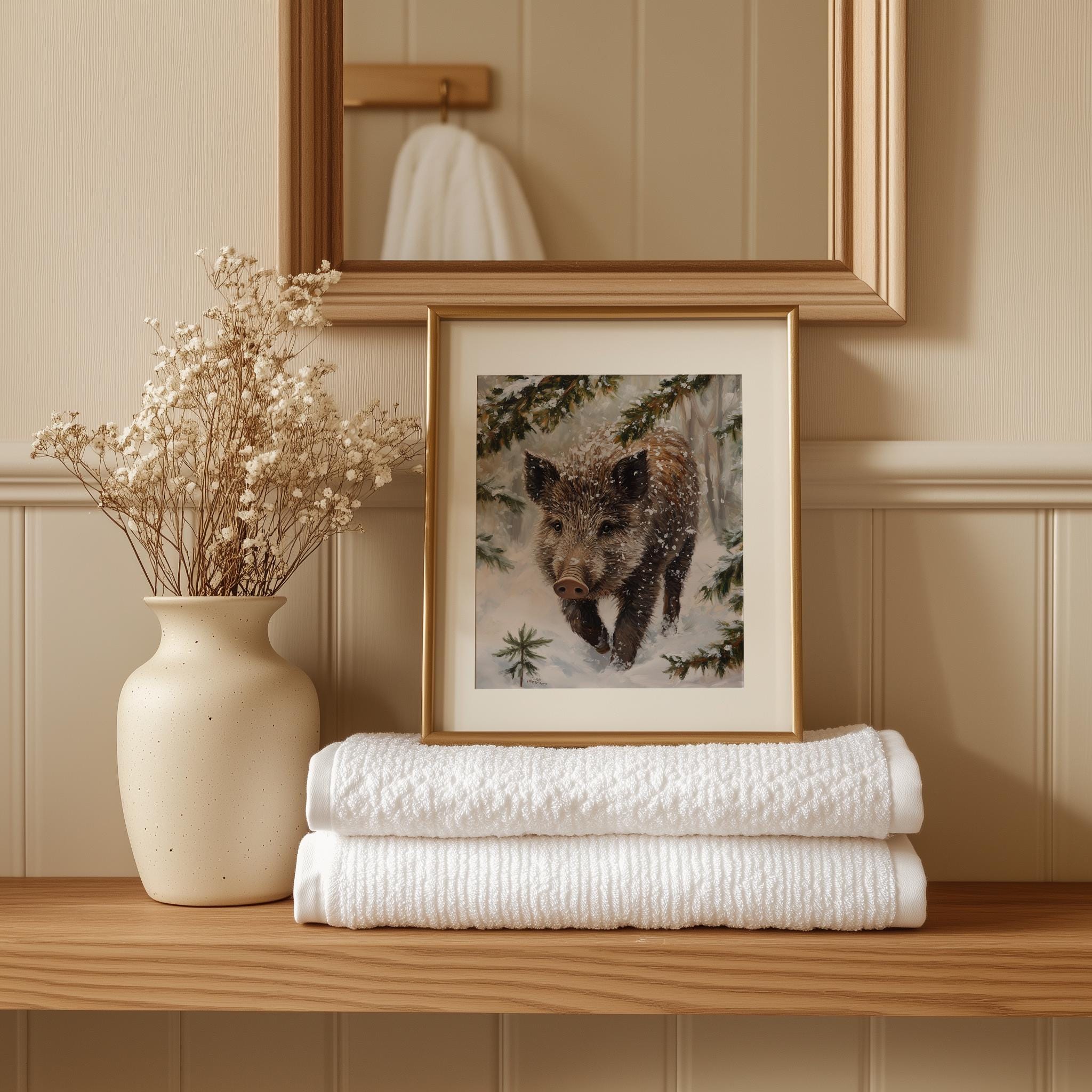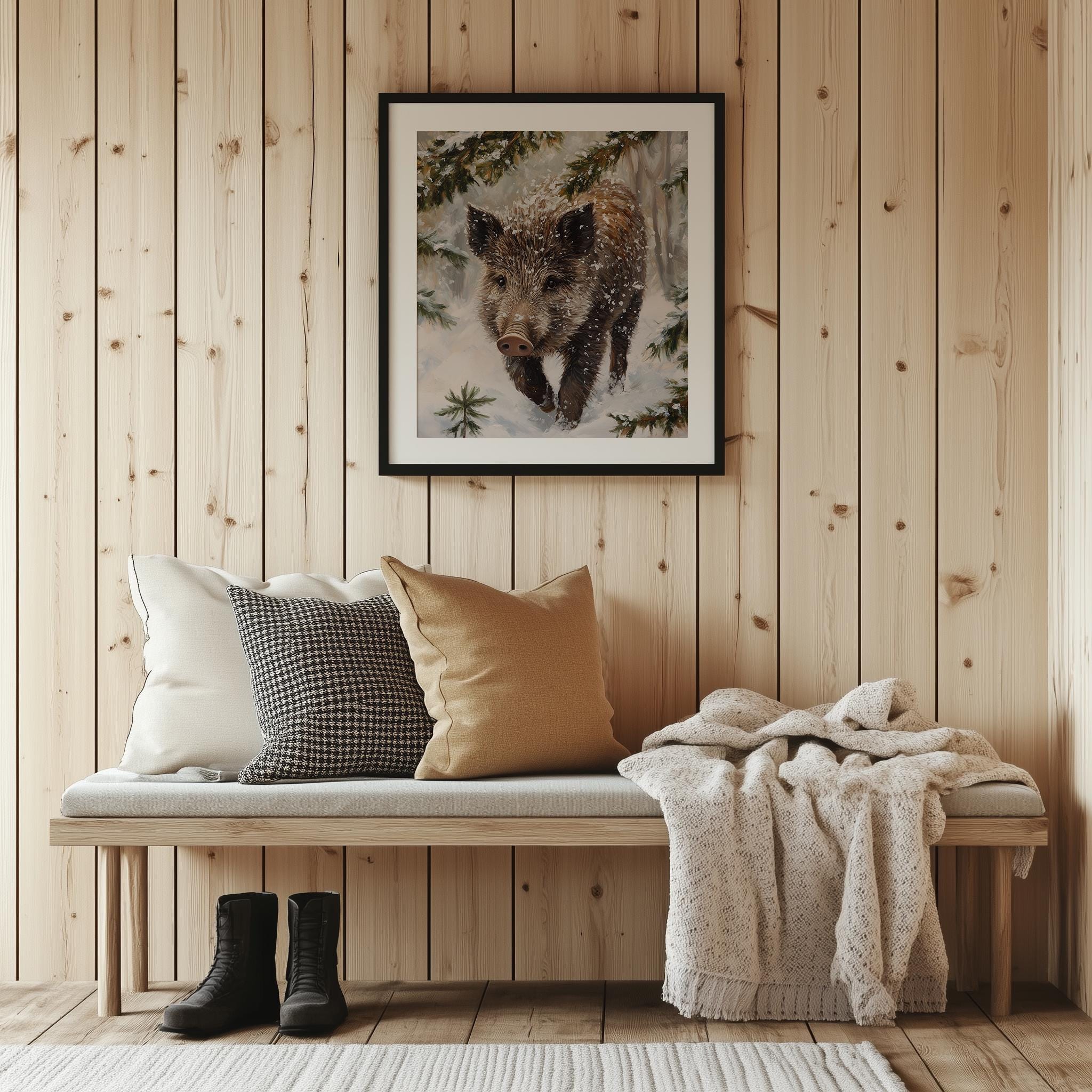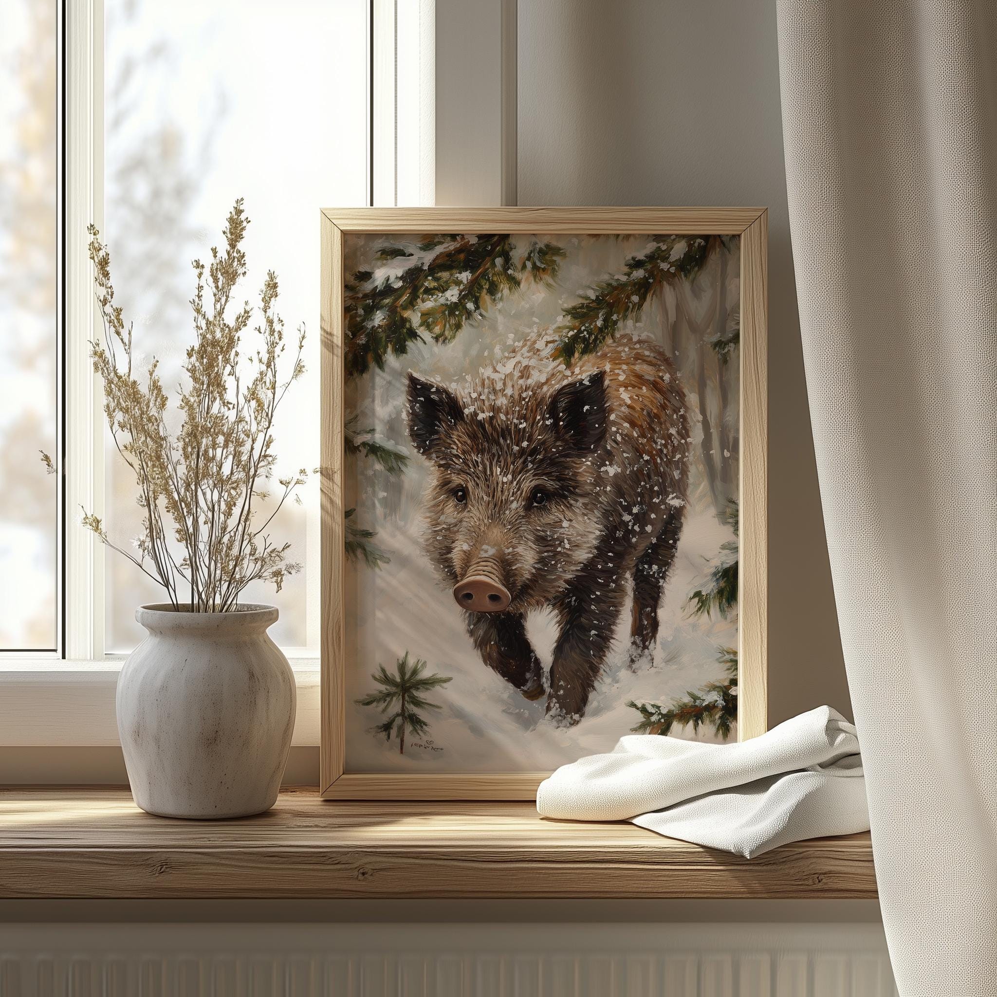 Immerse yourself in the charm with this rustic painting of a wild boar piglet gracefully rooting through a blanket of soft, glistening snow.