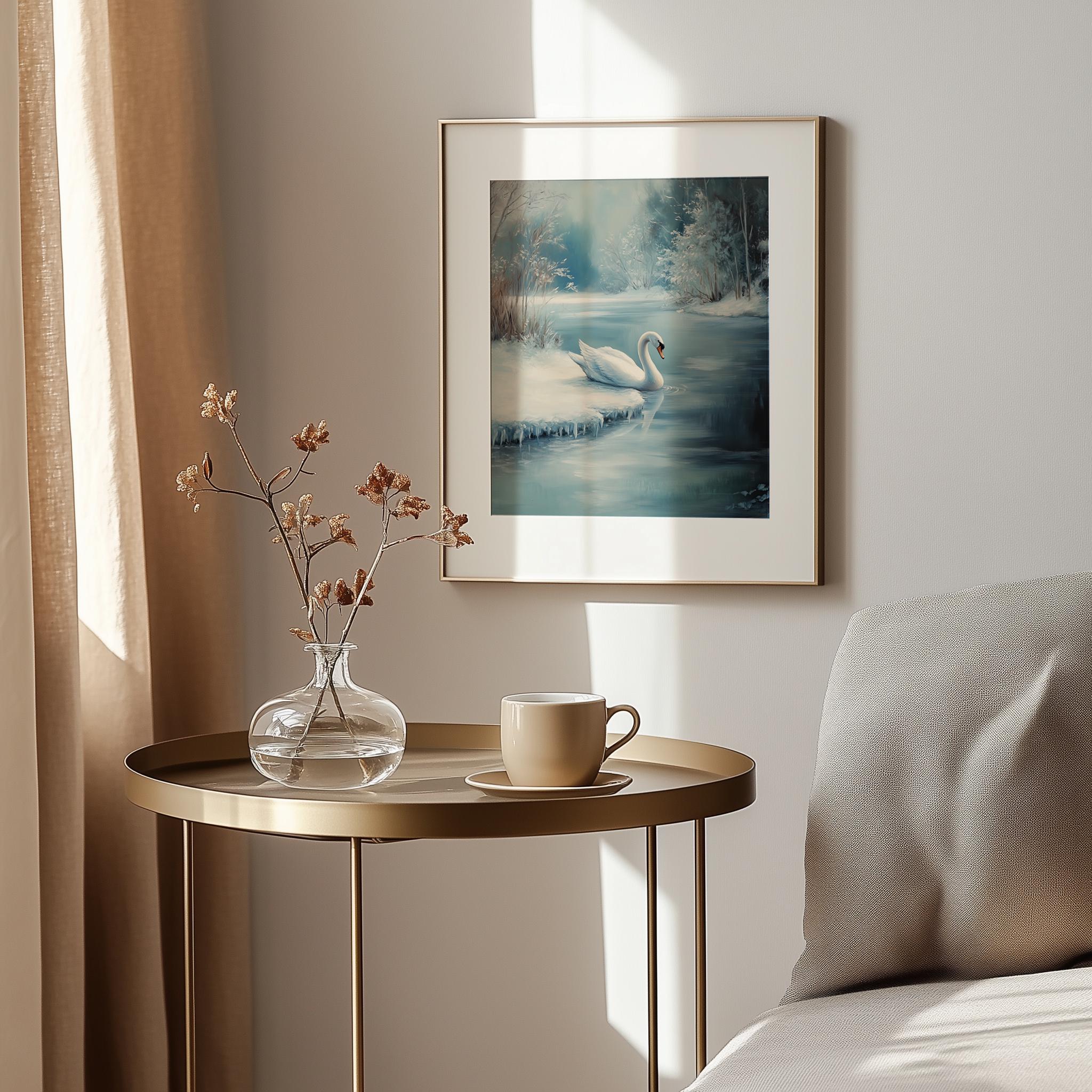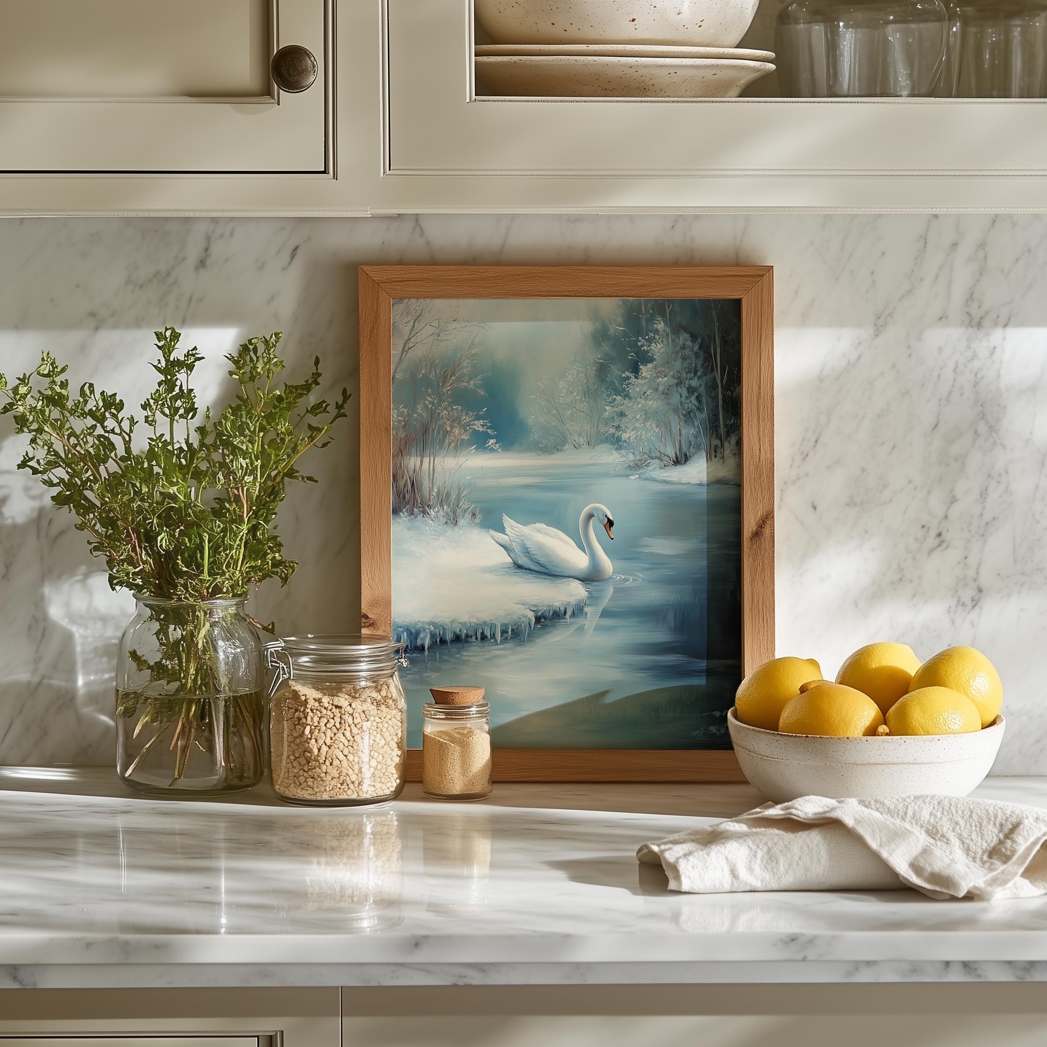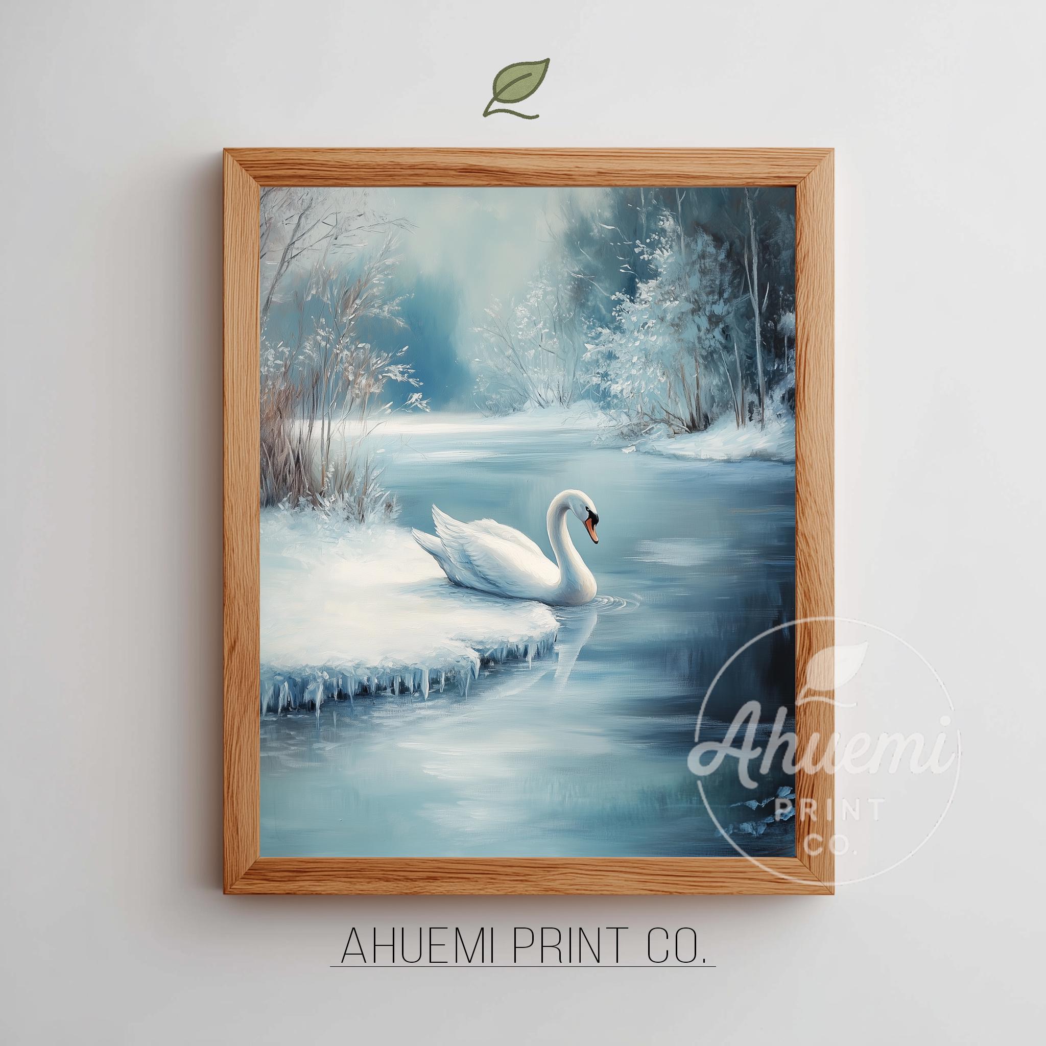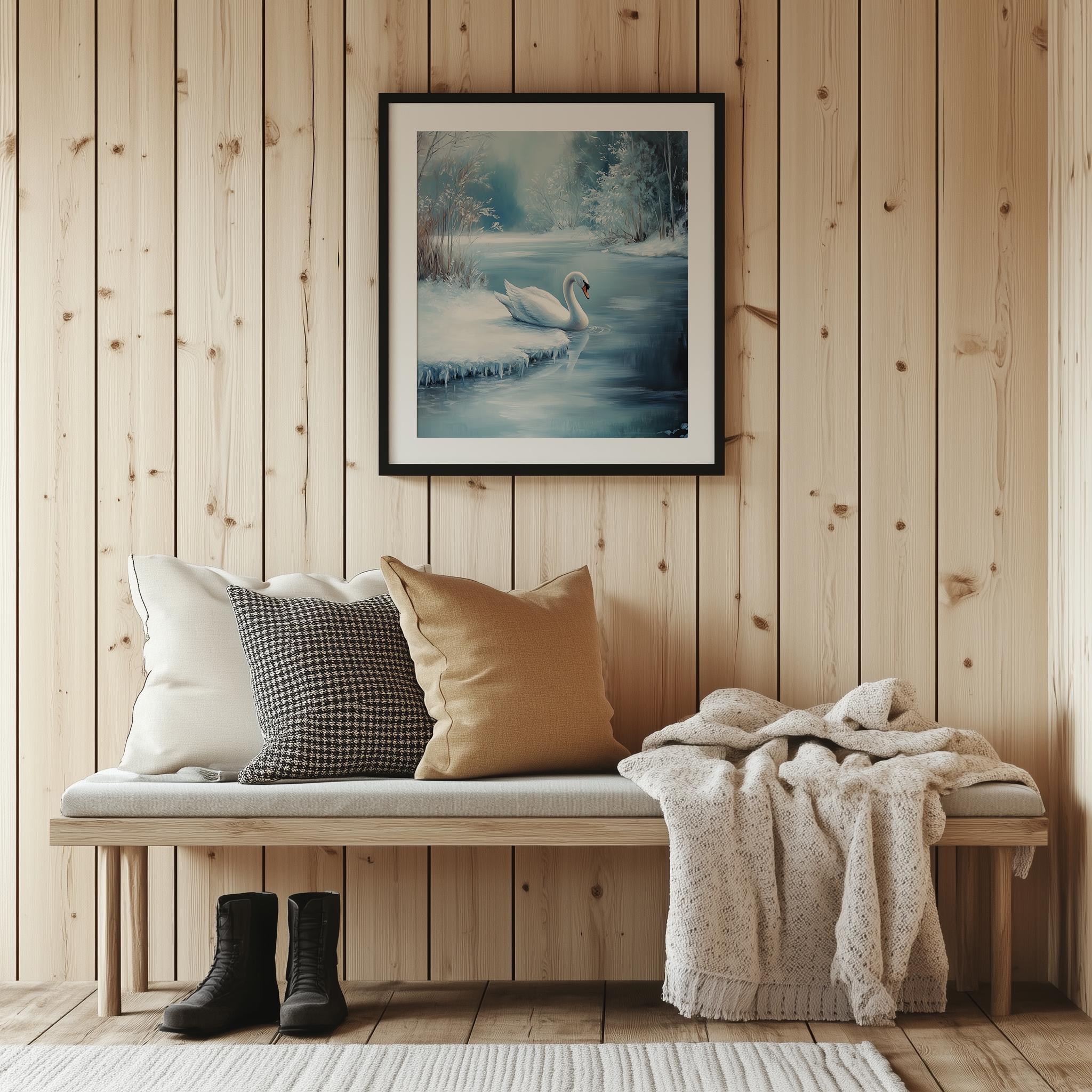 Immerse yourself in the charm with this rustic painting of a serene white swan gliding gracefully onto a frozen pond.