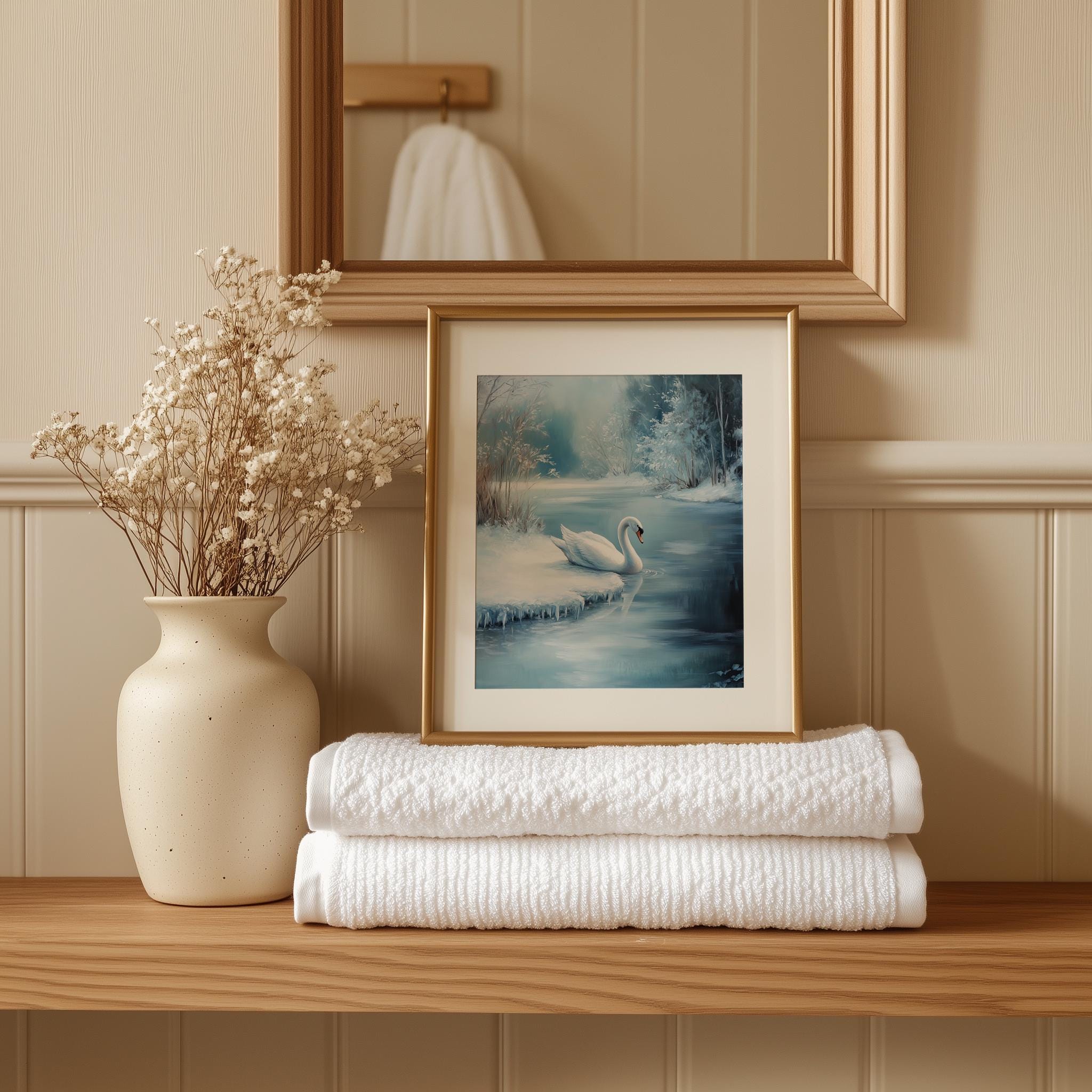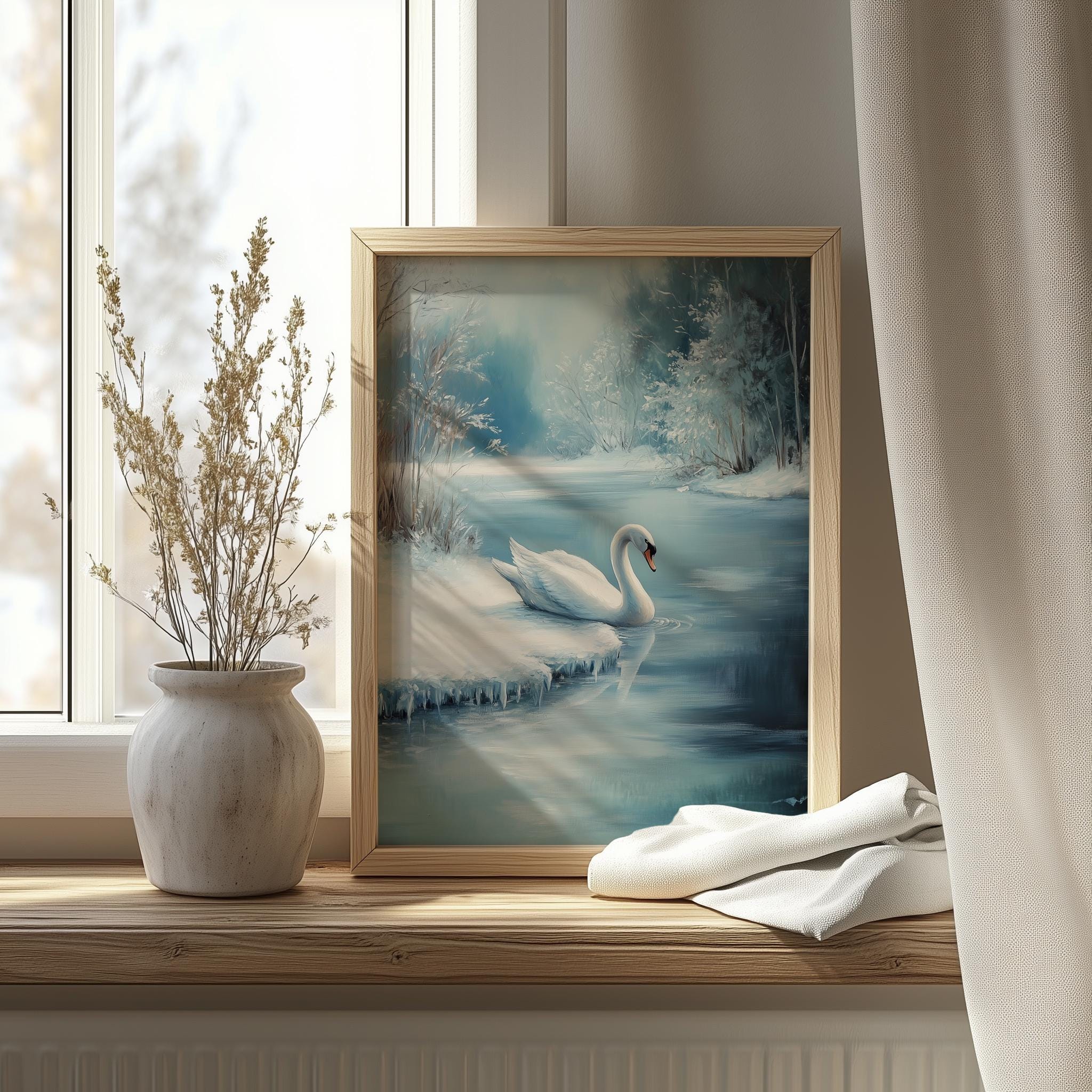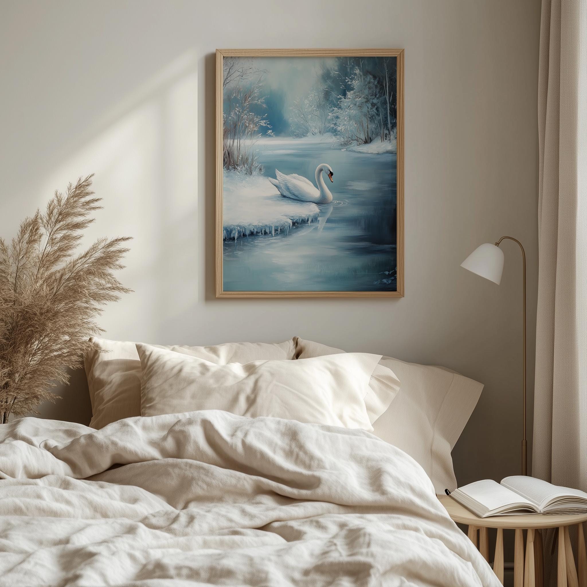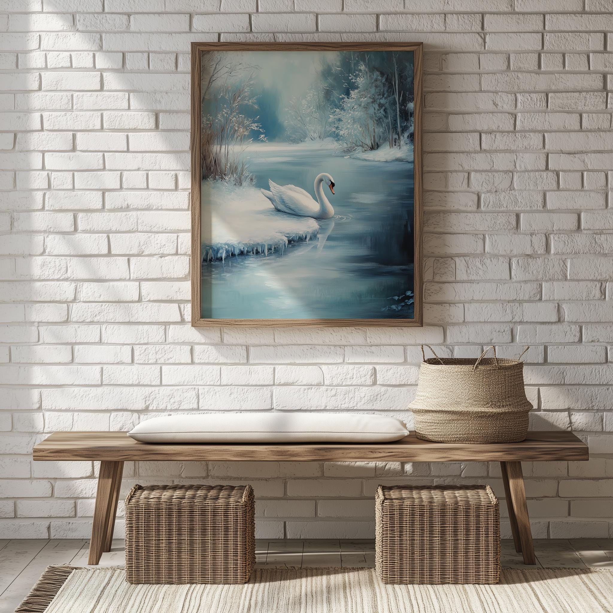 Immerse yourself in the charm with this rustic painting of a serene white swan gliding gracefully onto a frozen pond.