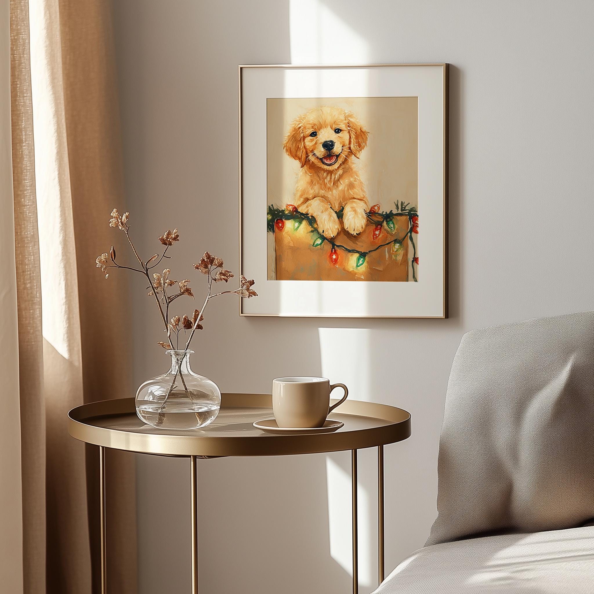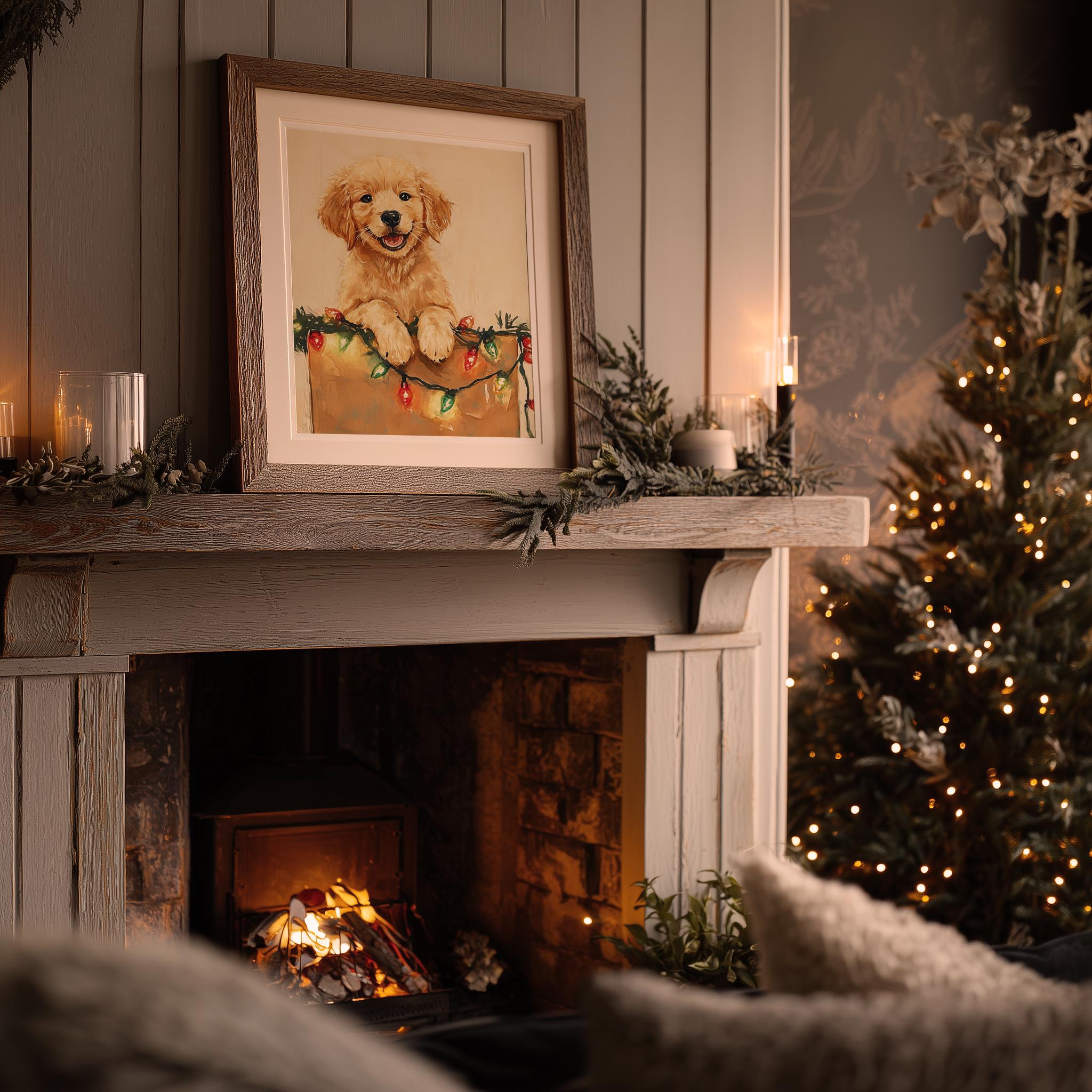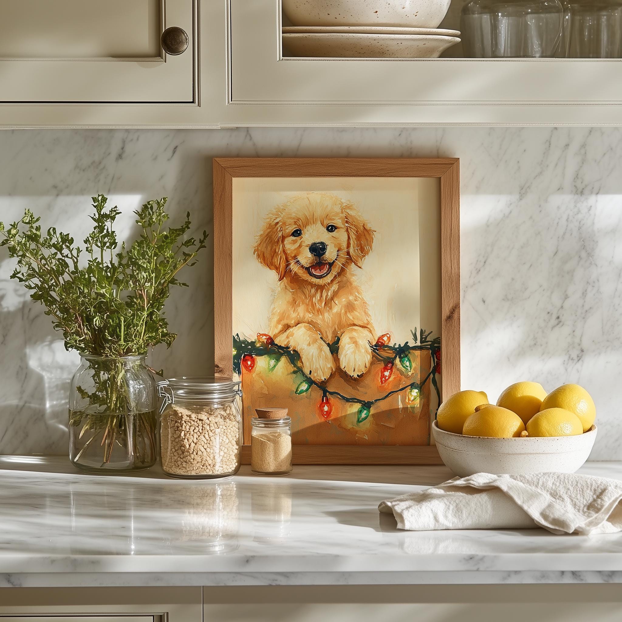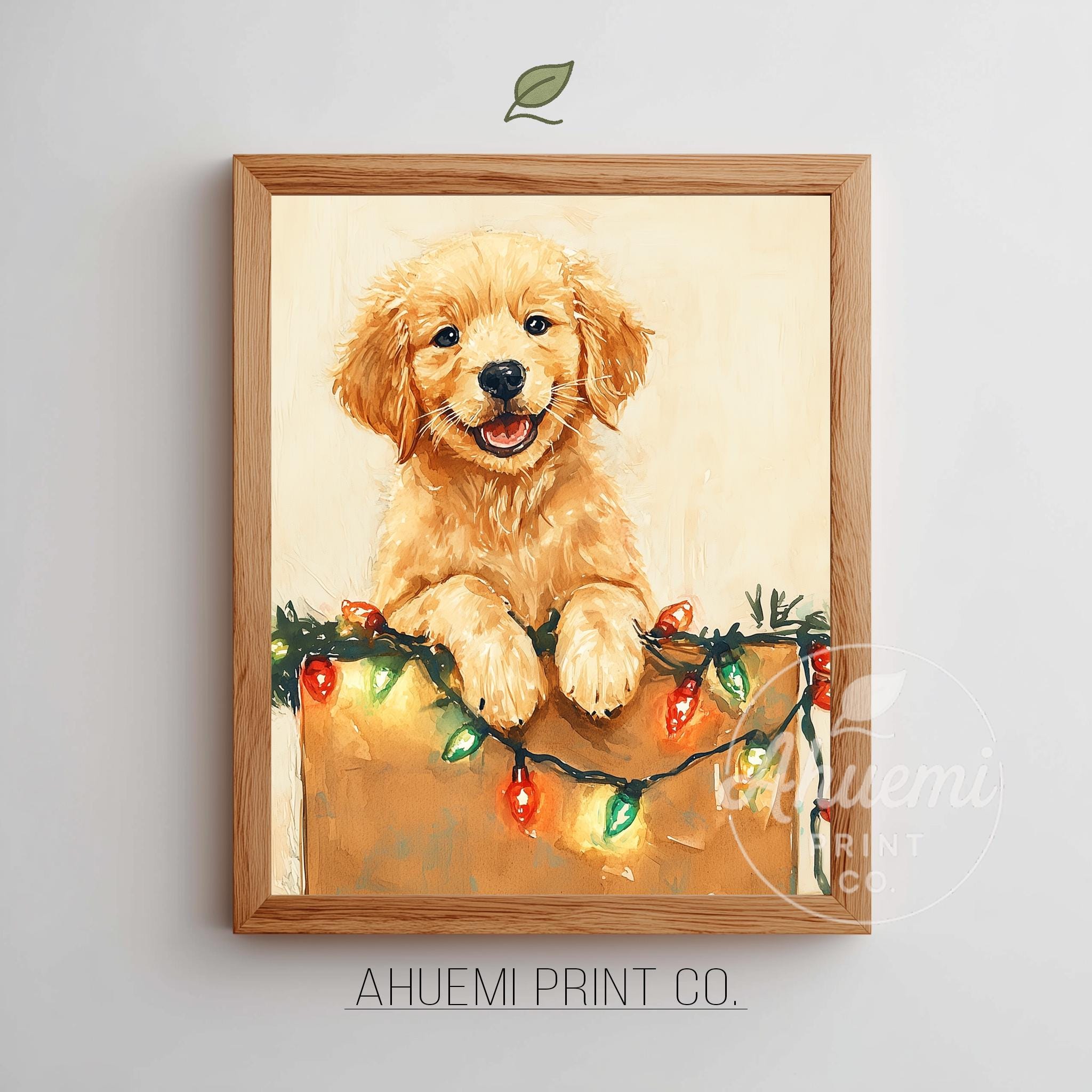 Immerse yourself in the charm with this rustic painting of a playful golden retriever puppy nestled in a cozy cardboard box, surrounded by festive lights. An instantly downloadable print, it's perfect for elevating your decor with budget-friendly charm. This gives you the flexibility to customize the size, frame, and material according to your personal taste and space, ensuring a perfect fit for your walls.