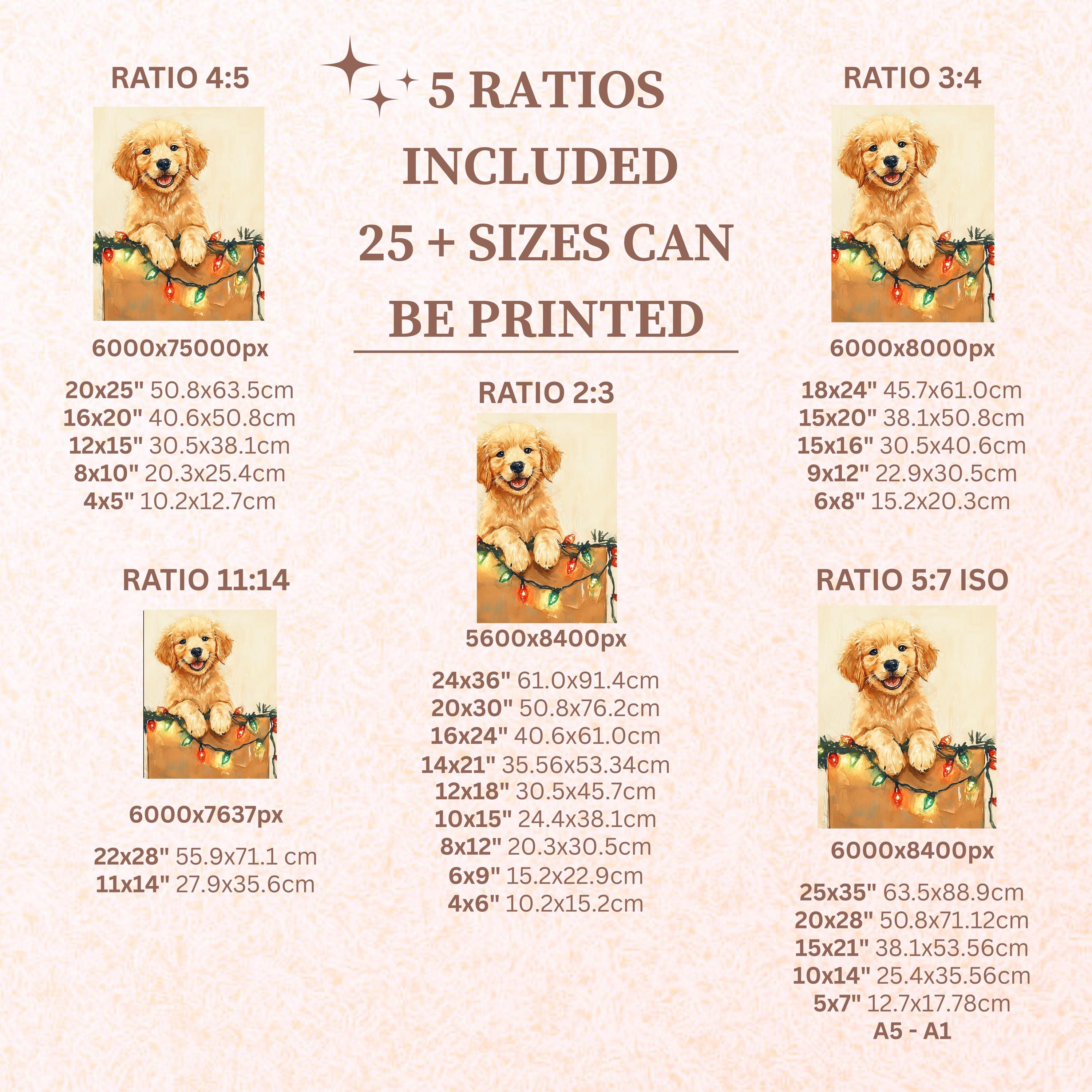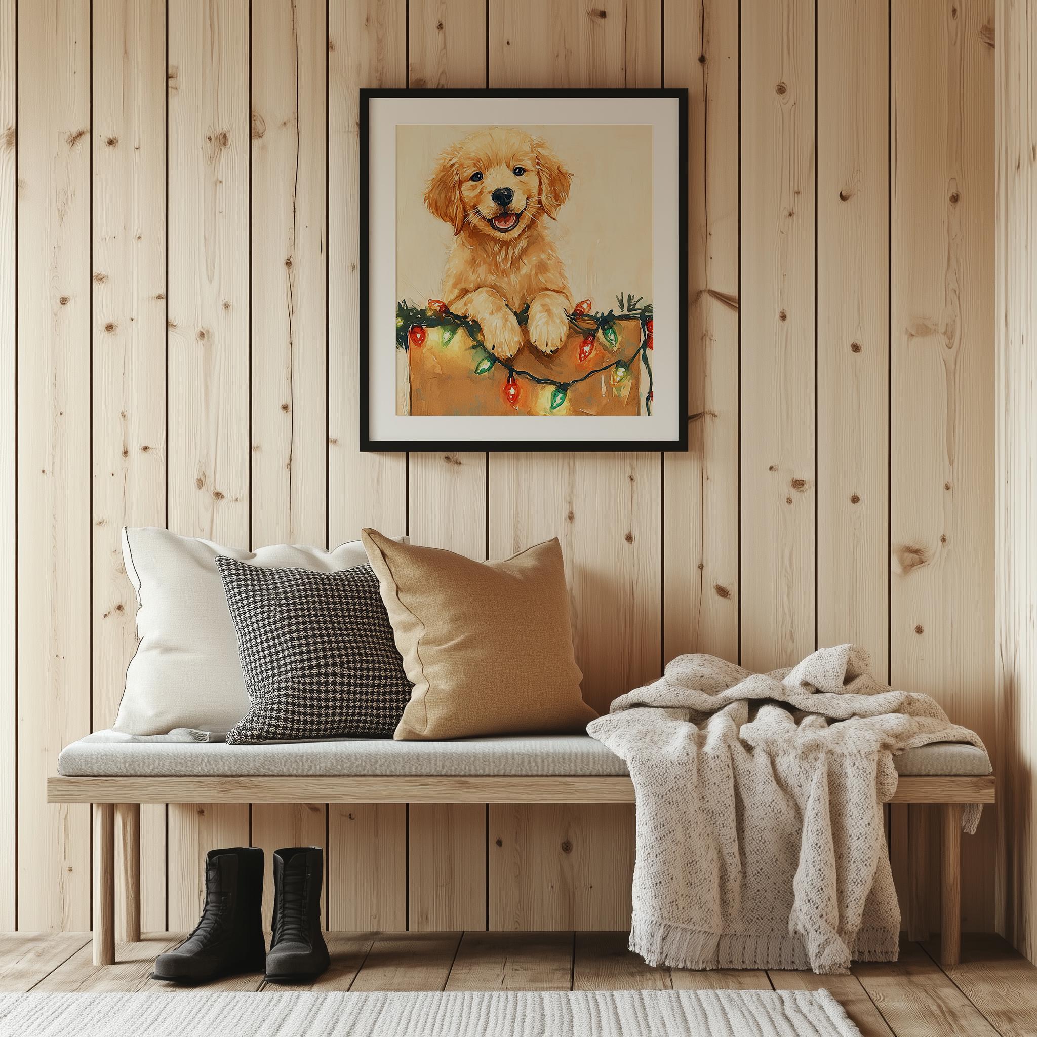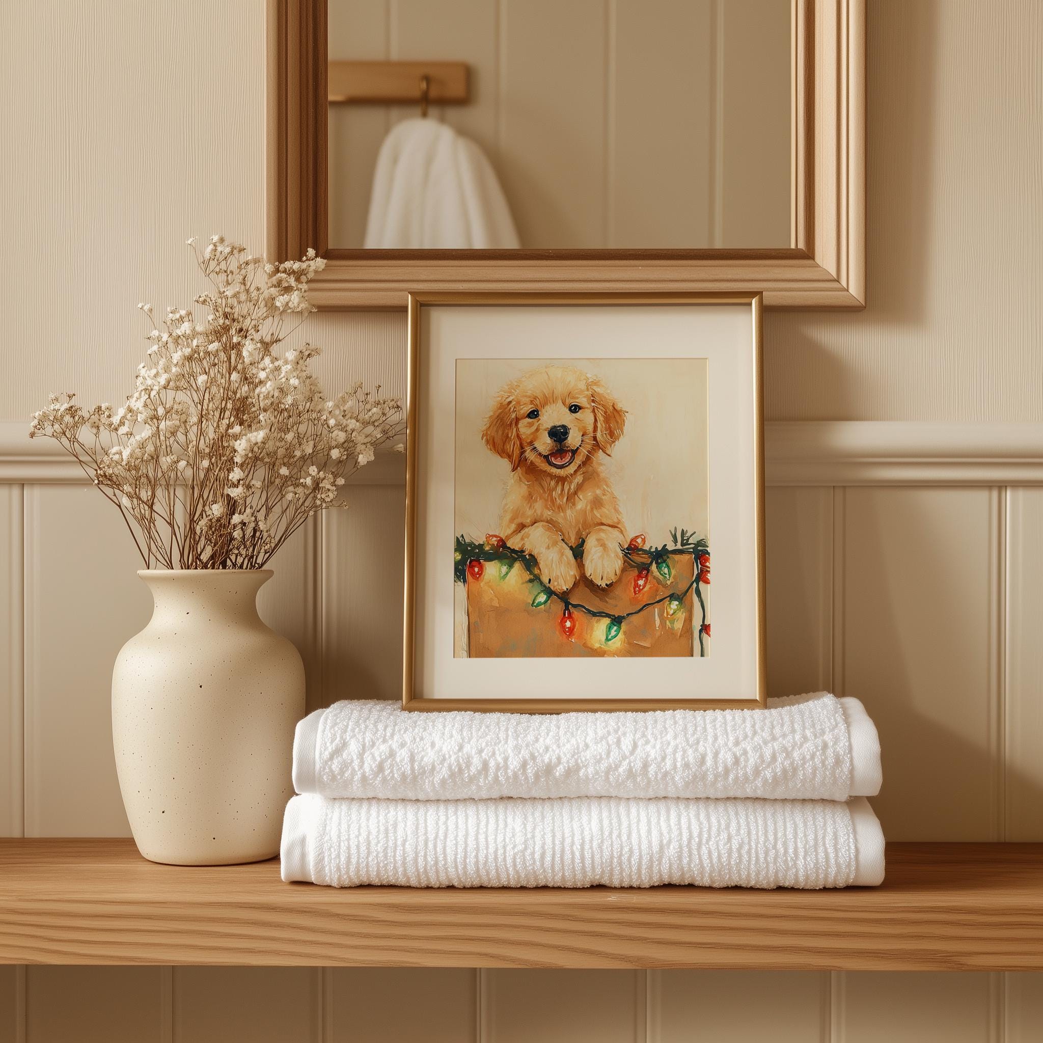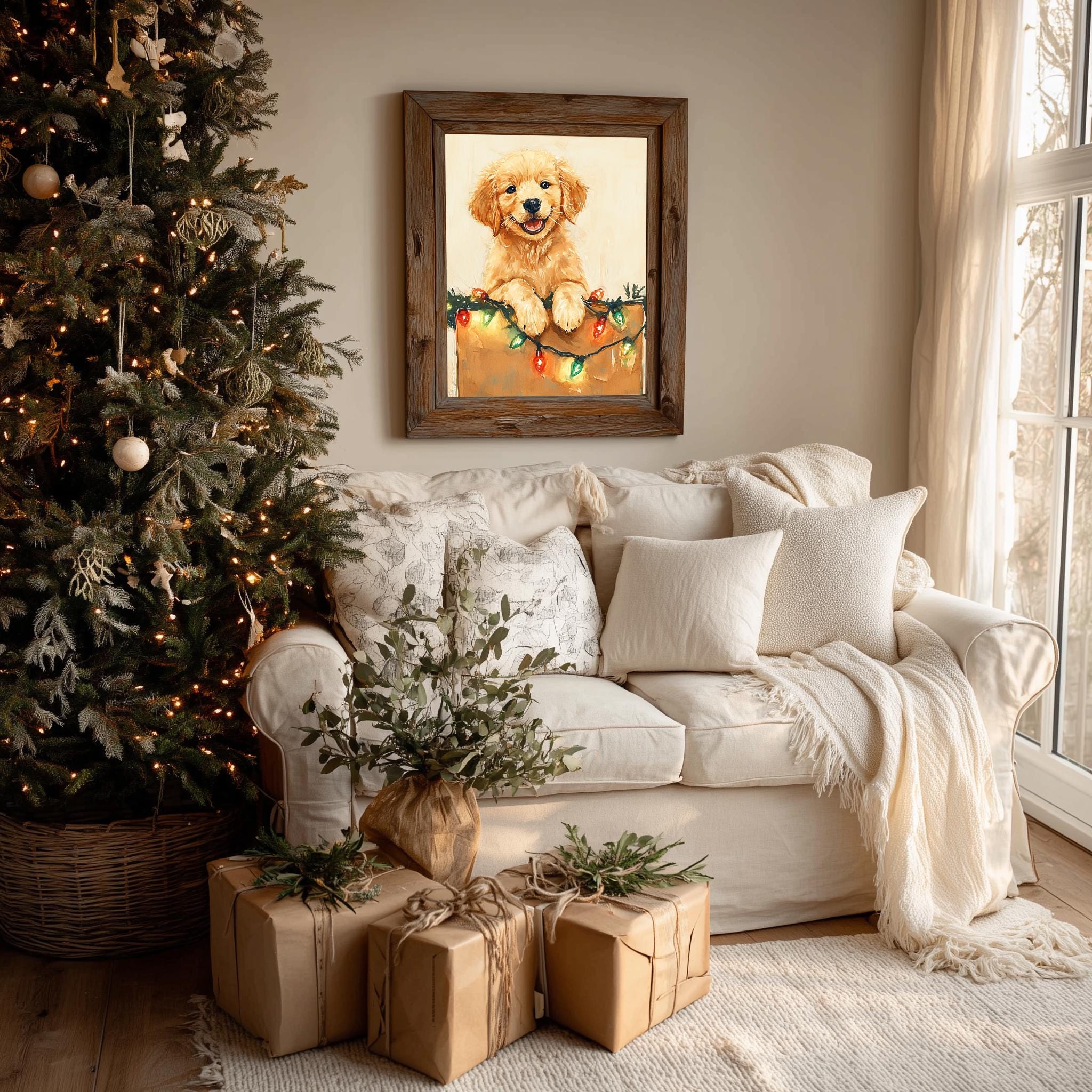 Immerse yourself in the charm with this rustic painting of a playful golden retriever puppy nestled in a cozy cardboard box, surrounded by festive lights. An instantly downloadable print, it's perfect for elevating your decor with budget-friendly charm. This gives you the flexibility to customize the size, frame, and material according to your personal taste and space, ensuring a perfect fit for your walls.