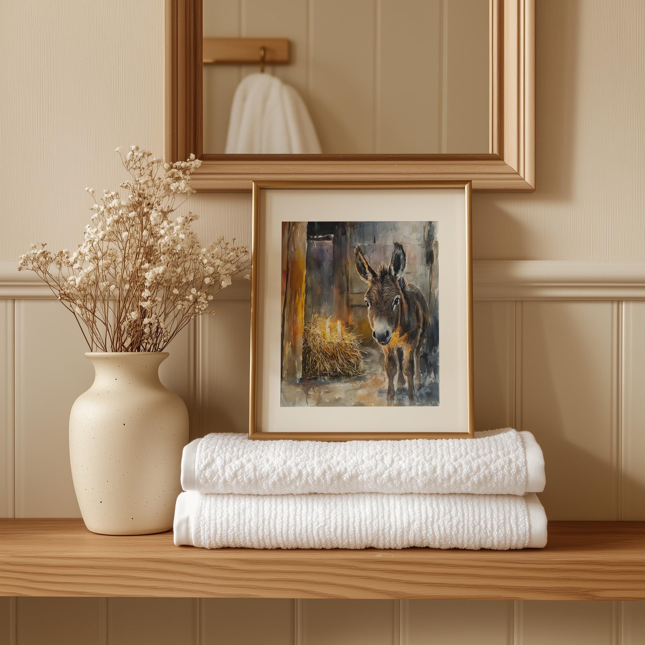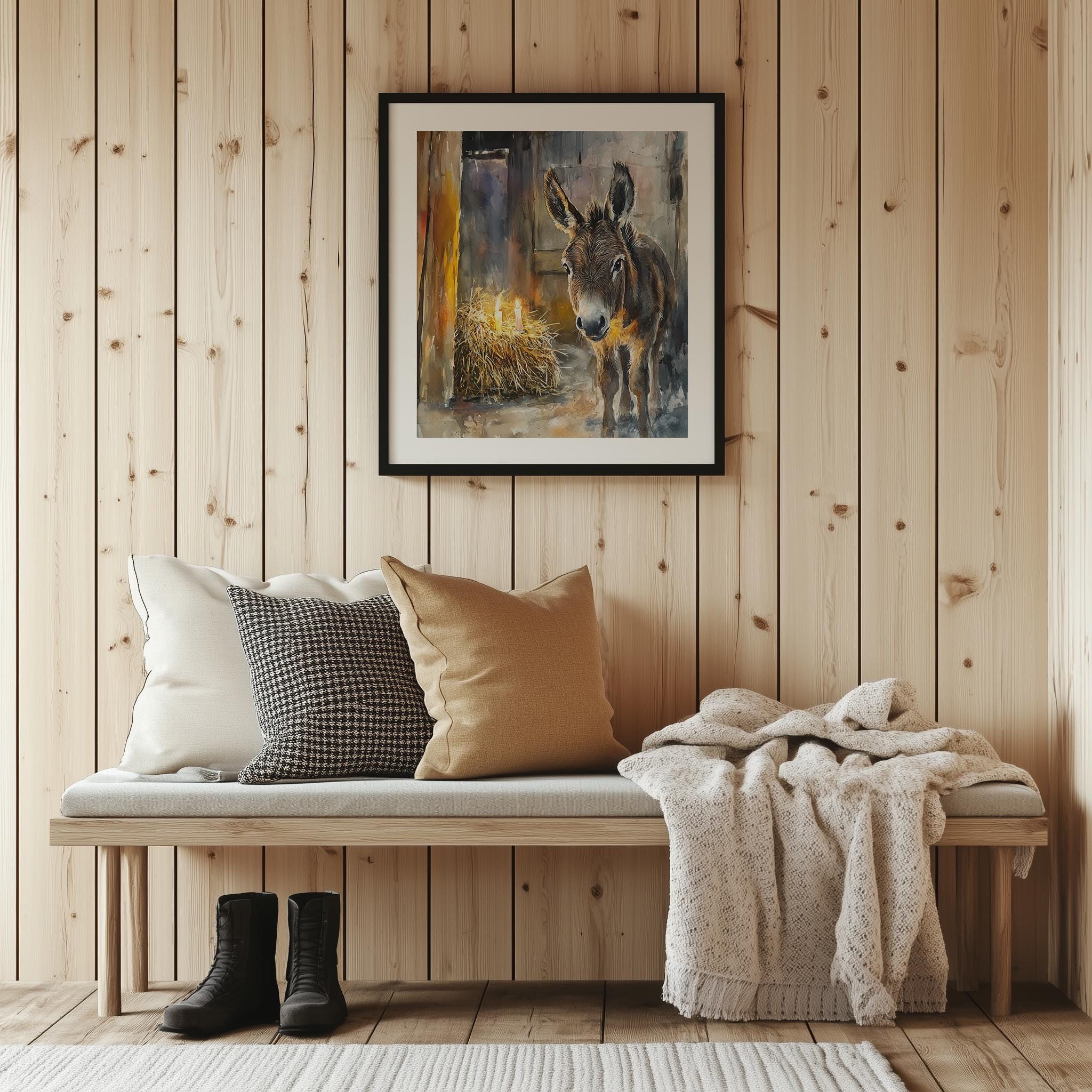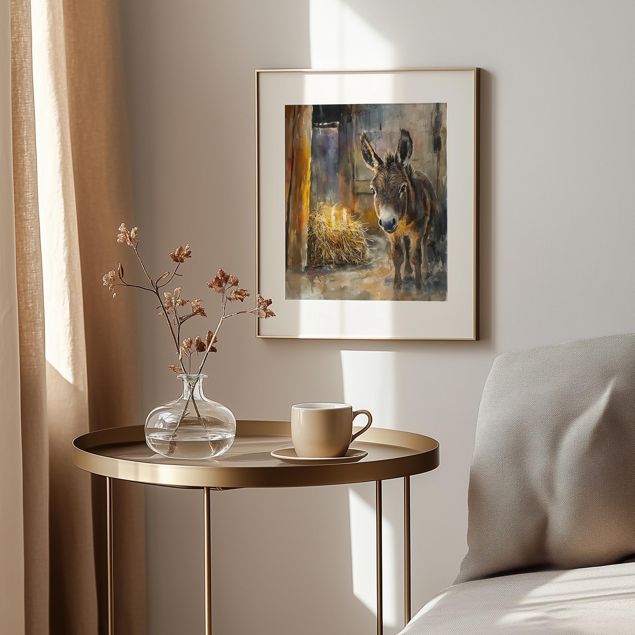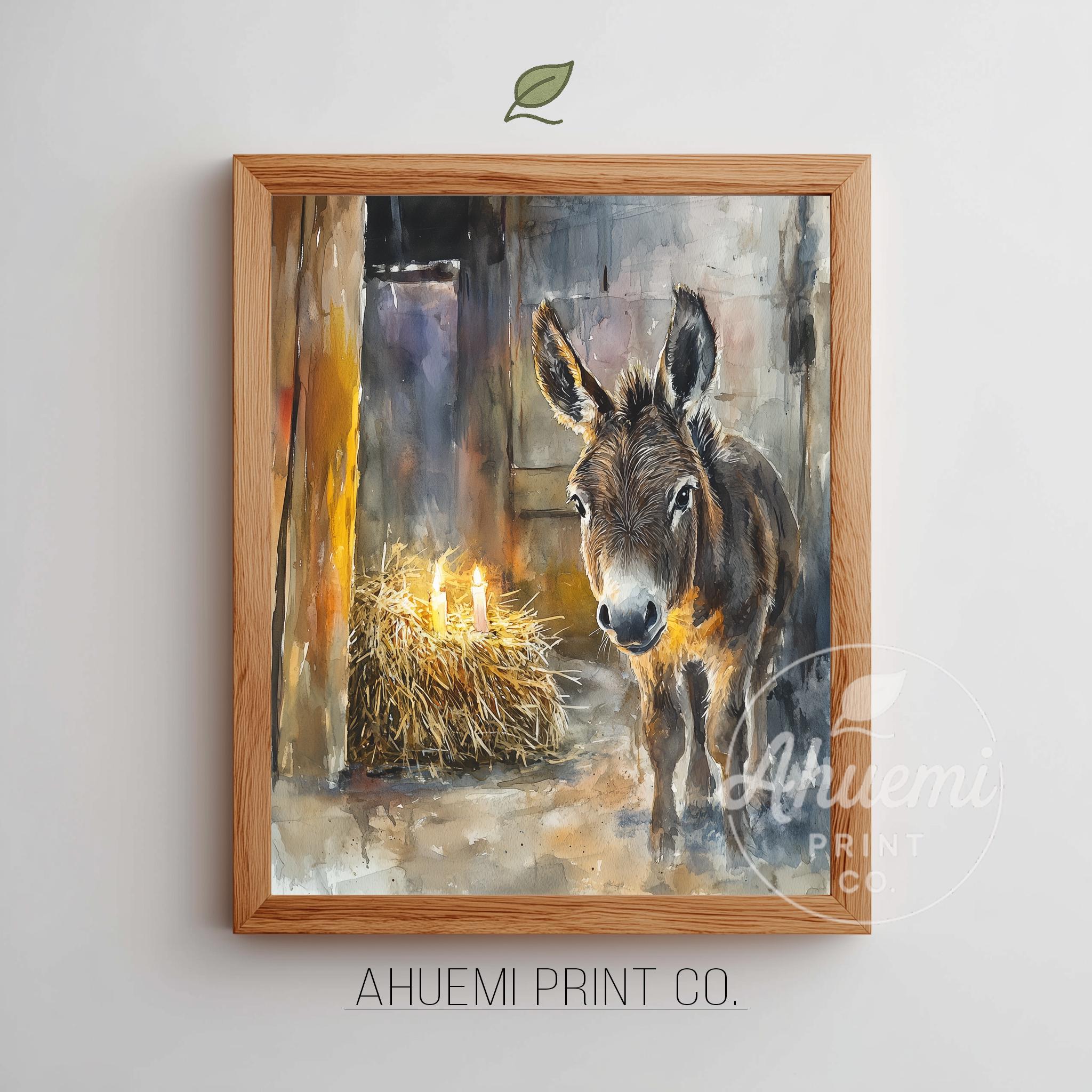 Immerse yourself in the charm with this rustic painting of a serene donkey nestled beside a manger, embodying the warmth of the holiday spirit. An instantly downloadable print, it's perfect for elevating your decor with budget-friendly charm. This gives you the flexibility to customize the size, frame, and material according to your personal taste and space, ensuring a perfect fit for your walls.