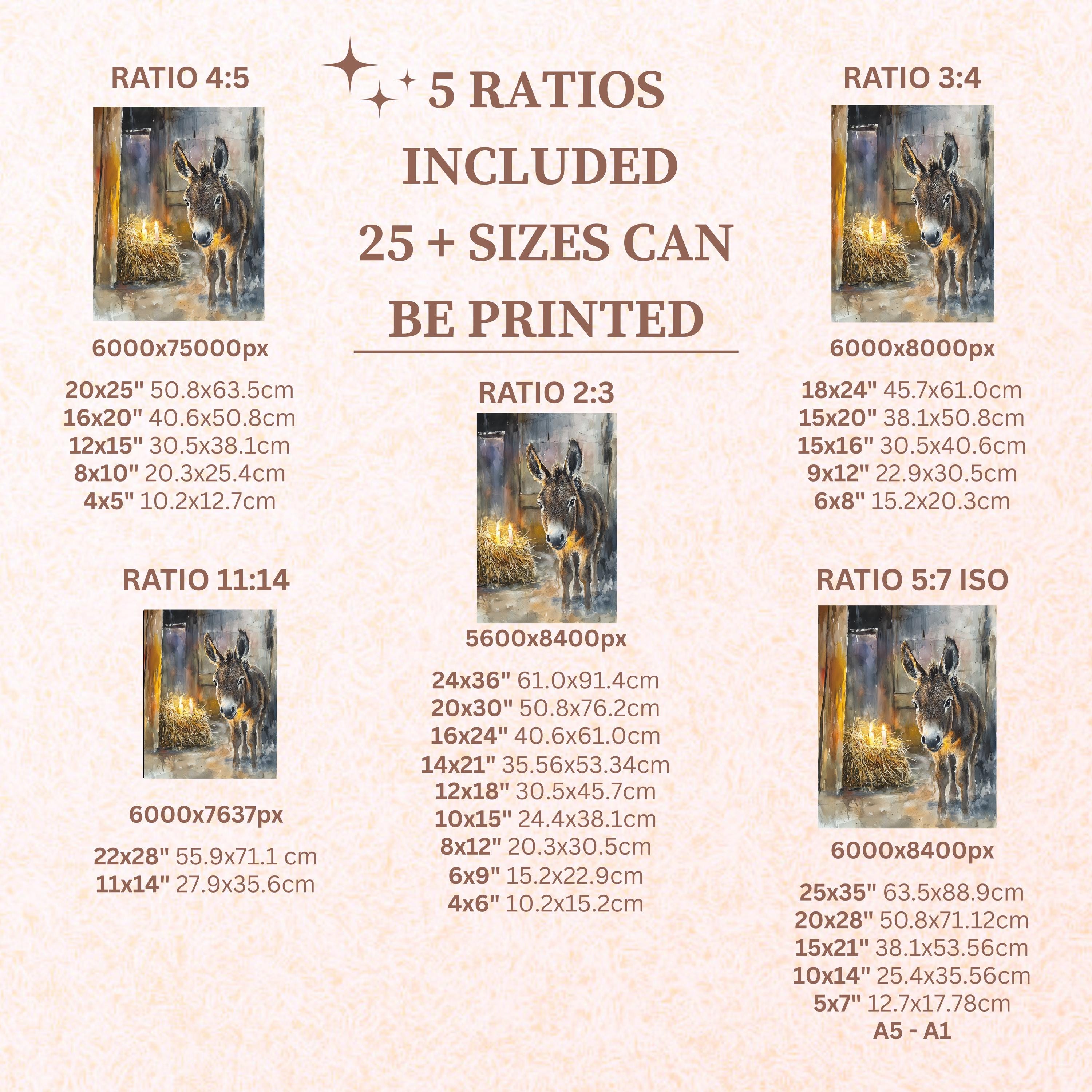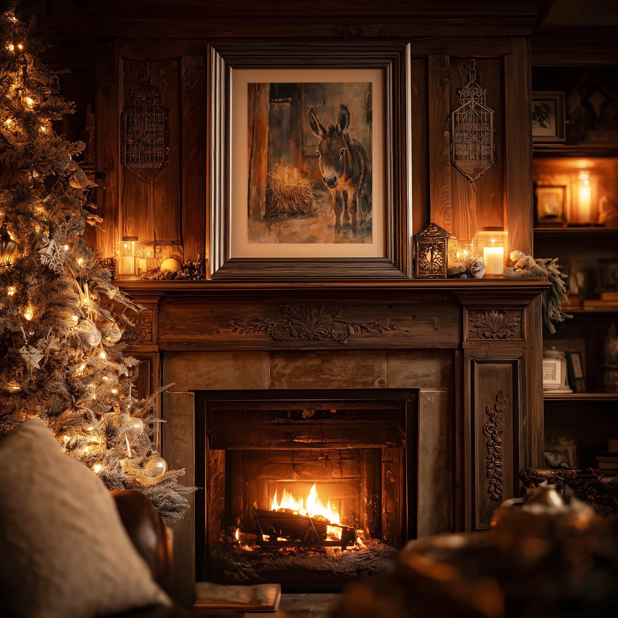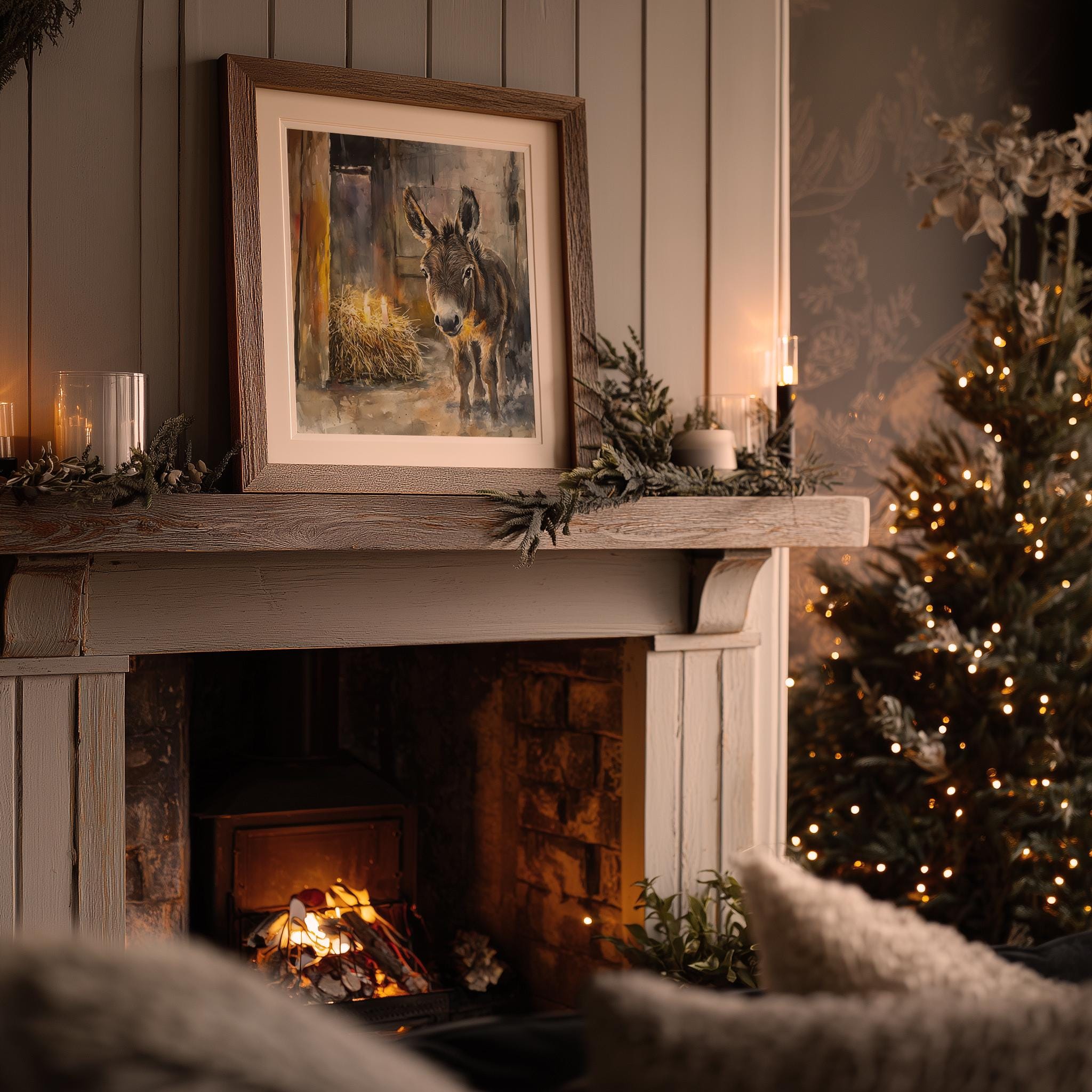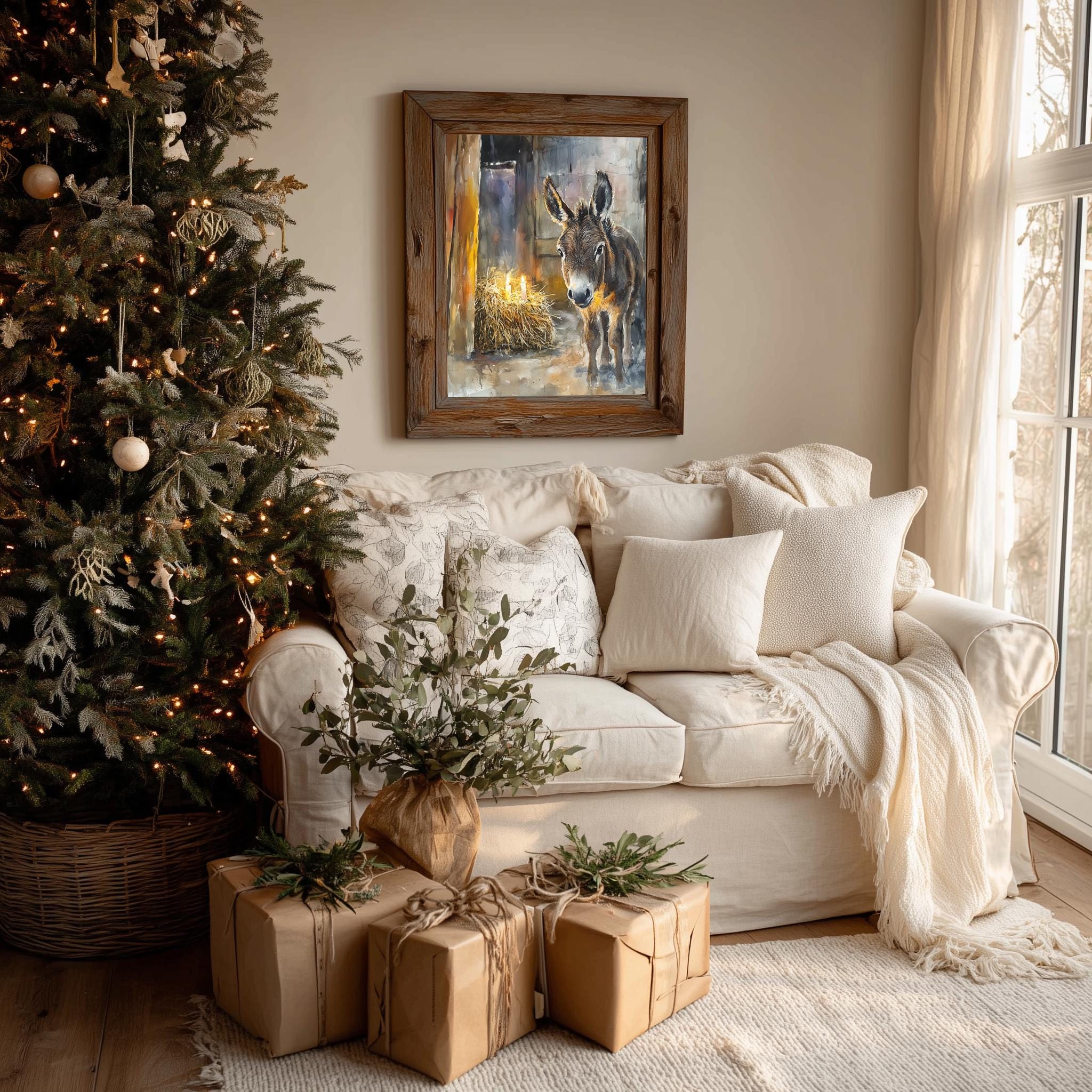 Immerse yourself in the charm with this rustic painting of a serene donkey nestled beside a manger, embodying the warmth of the holiday spirit. An instantly downloadable print, it's perfect for elevating your decor with budget-friendly charm. This gives you the flexibility to customize the size, frame, and material according to your personal taste and space, ensuring a perfect fit for your walls.