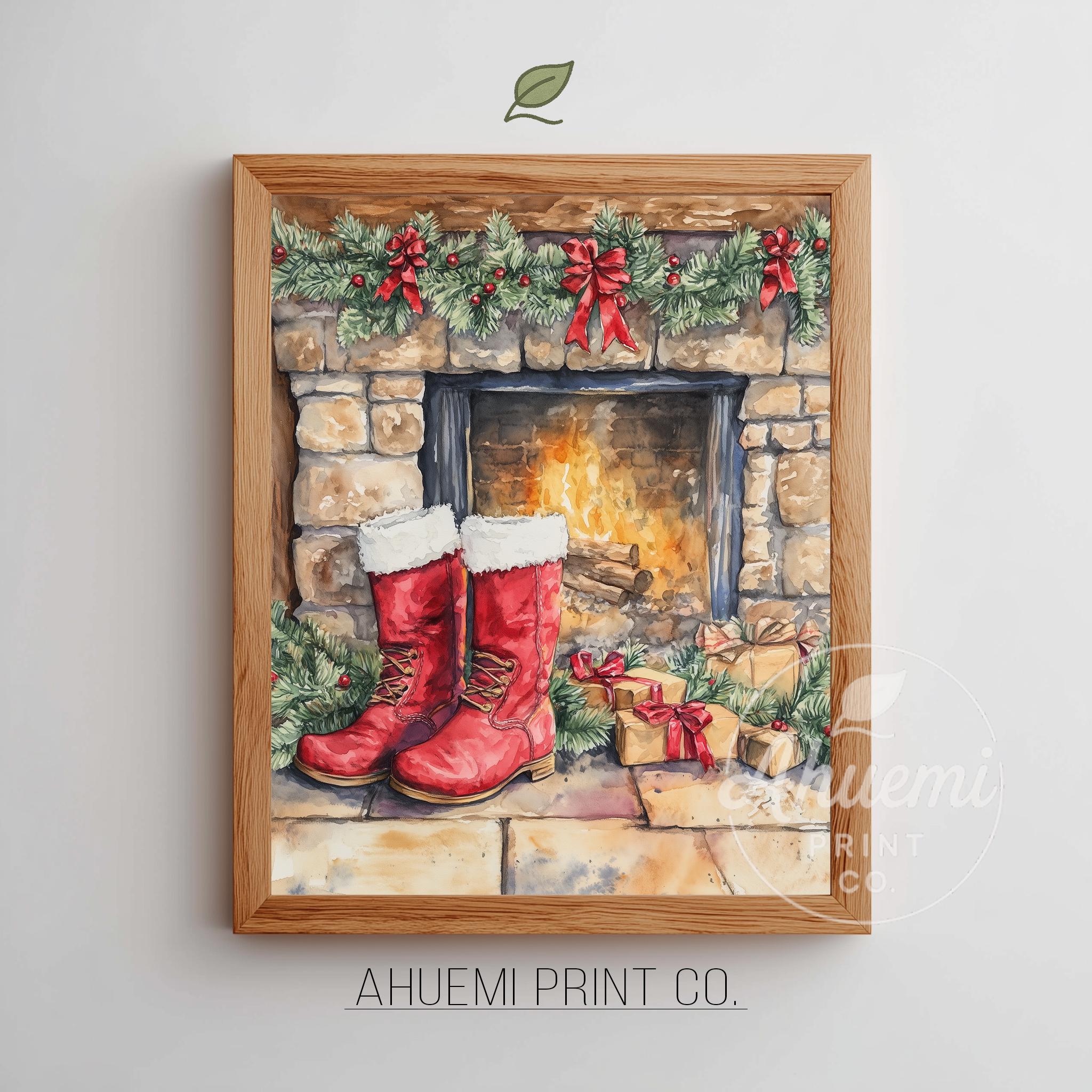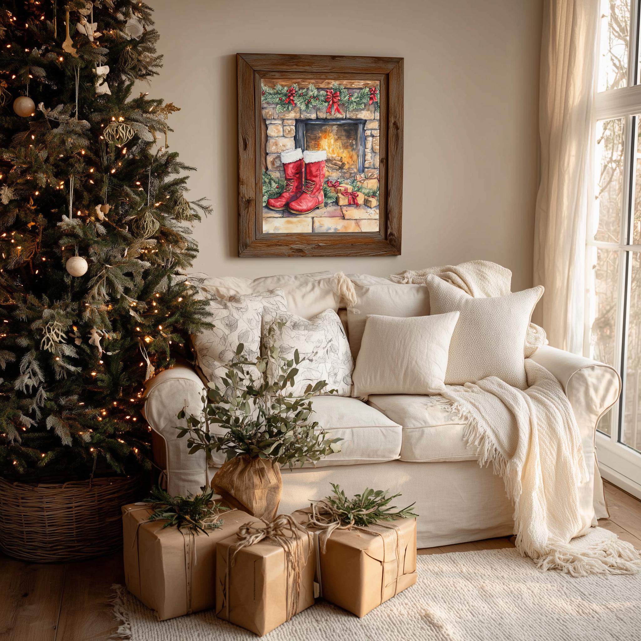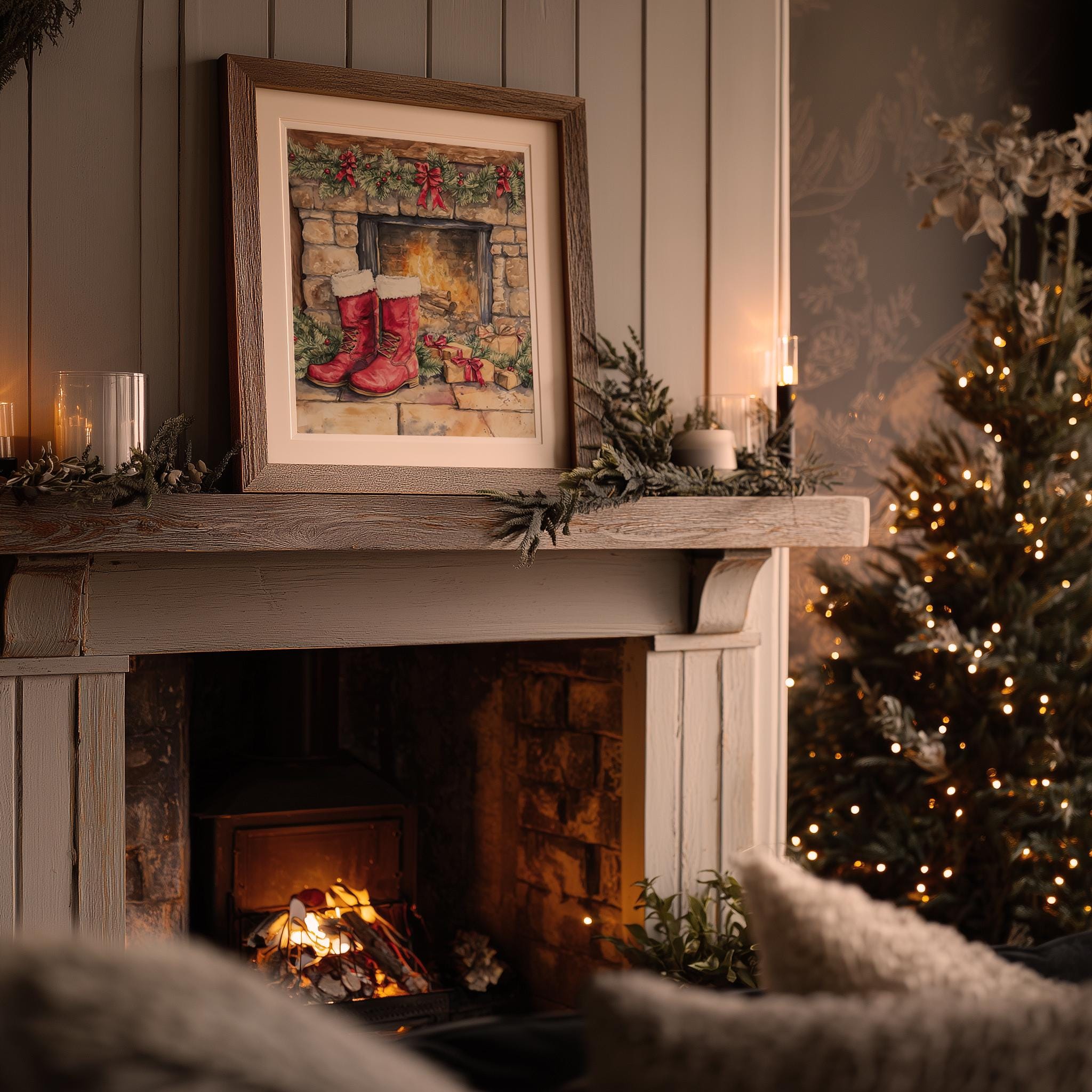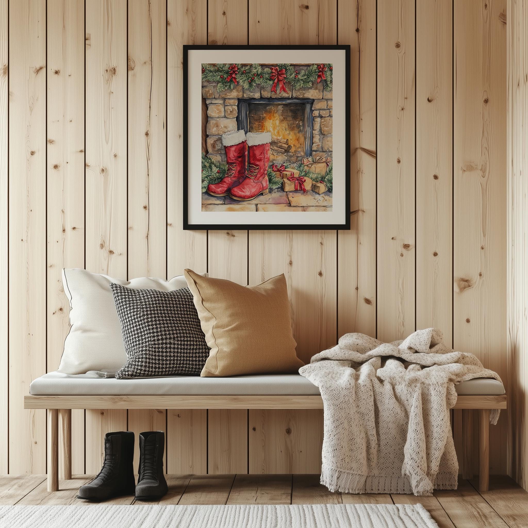 Immerse yourself in the charm with this rustic painting of a pair of vintage Santa boots resting by a warm, inviting fireplace. An instantly downloadable print, it's perfect for elevating your decor with budget-friendly charm. This gives you the flexibility to customize the size, frame, and material according to your personal taste and space, ensuring a perfect fit for your walls.