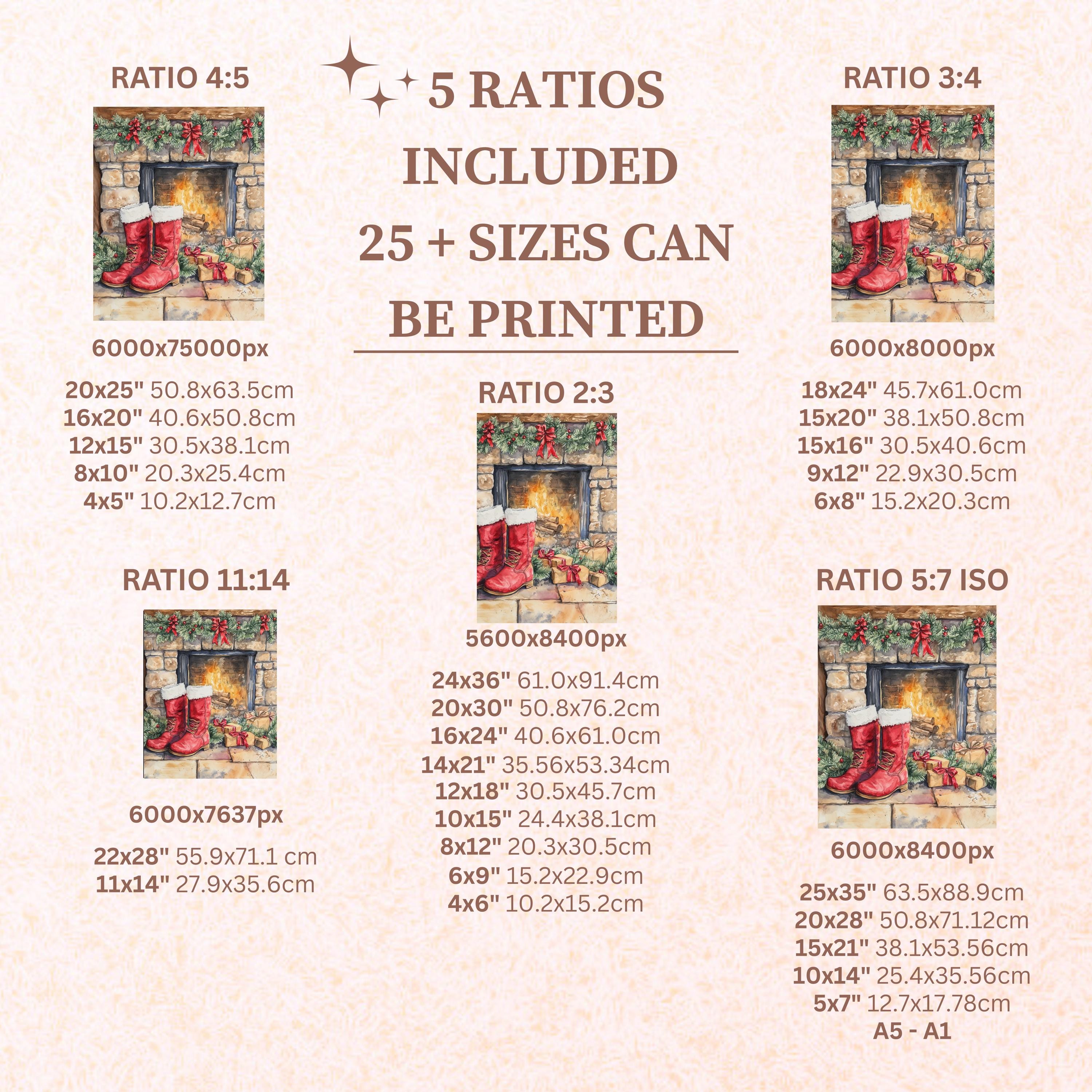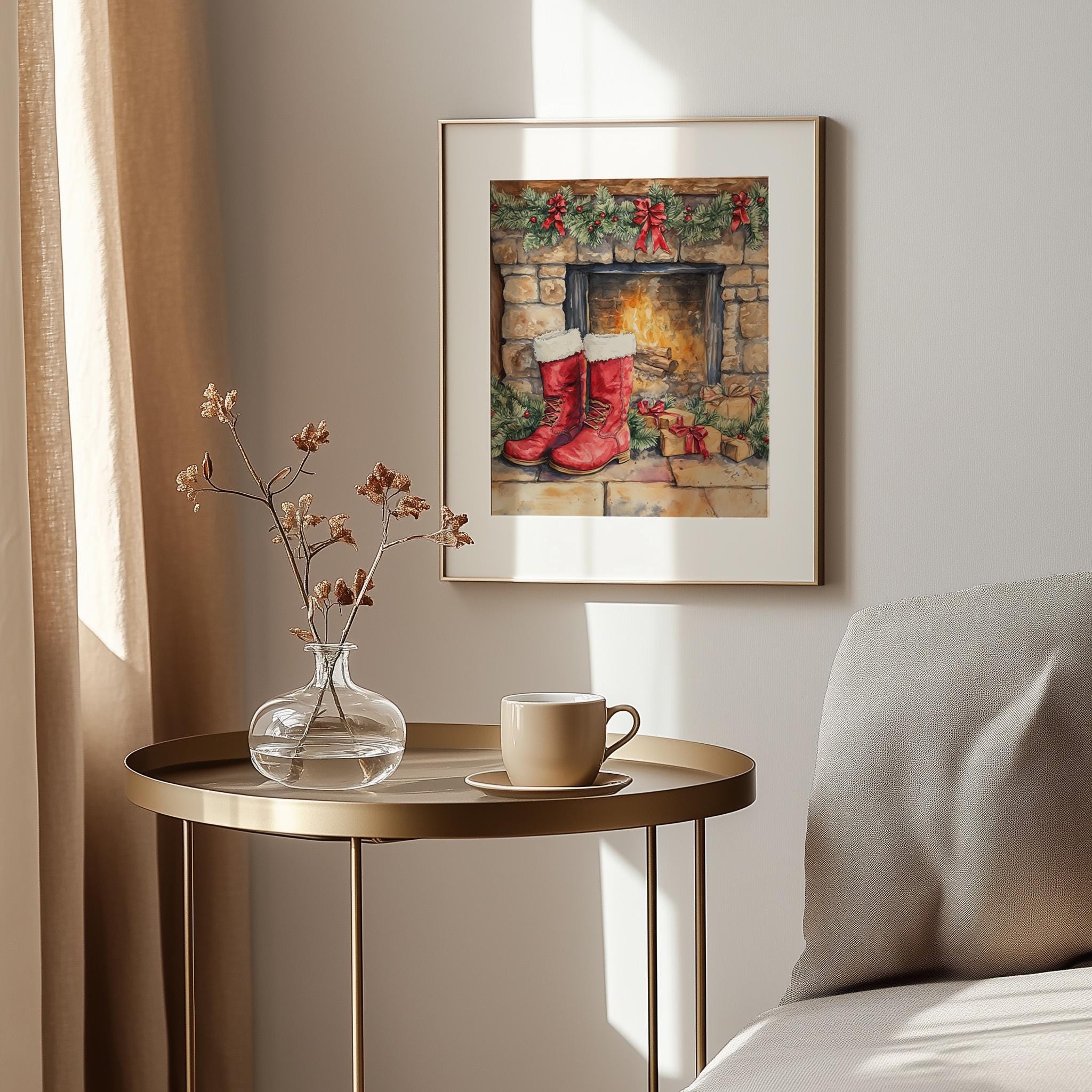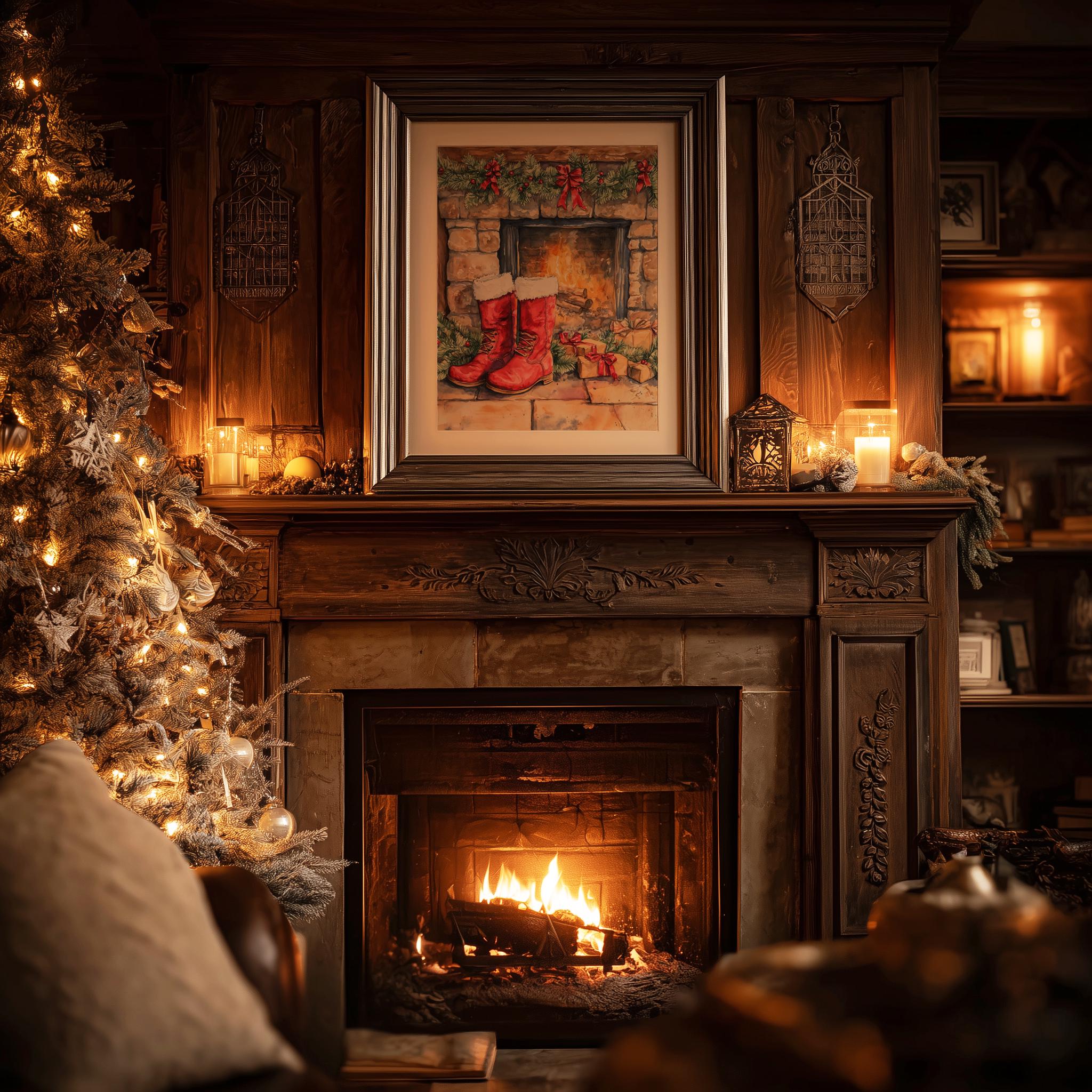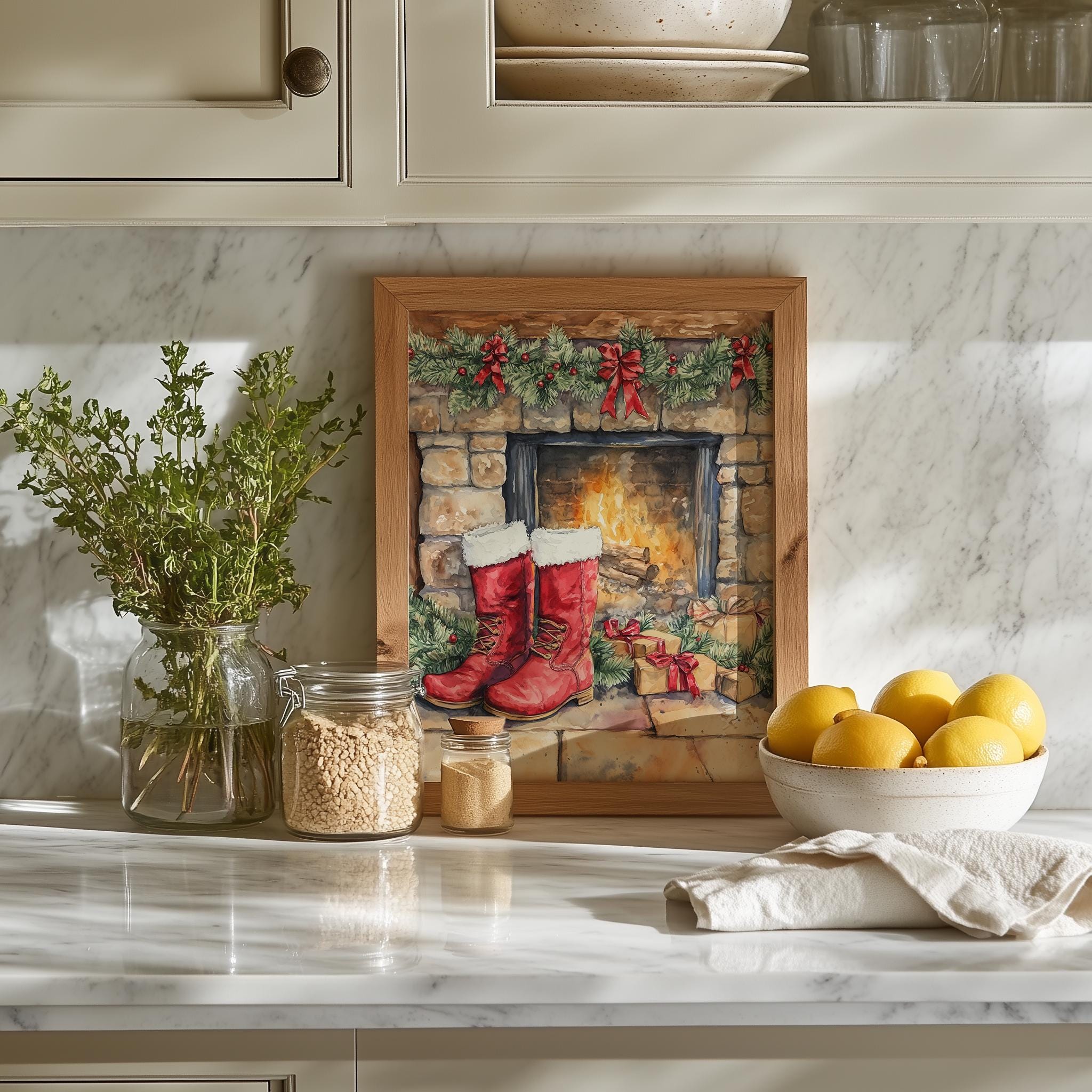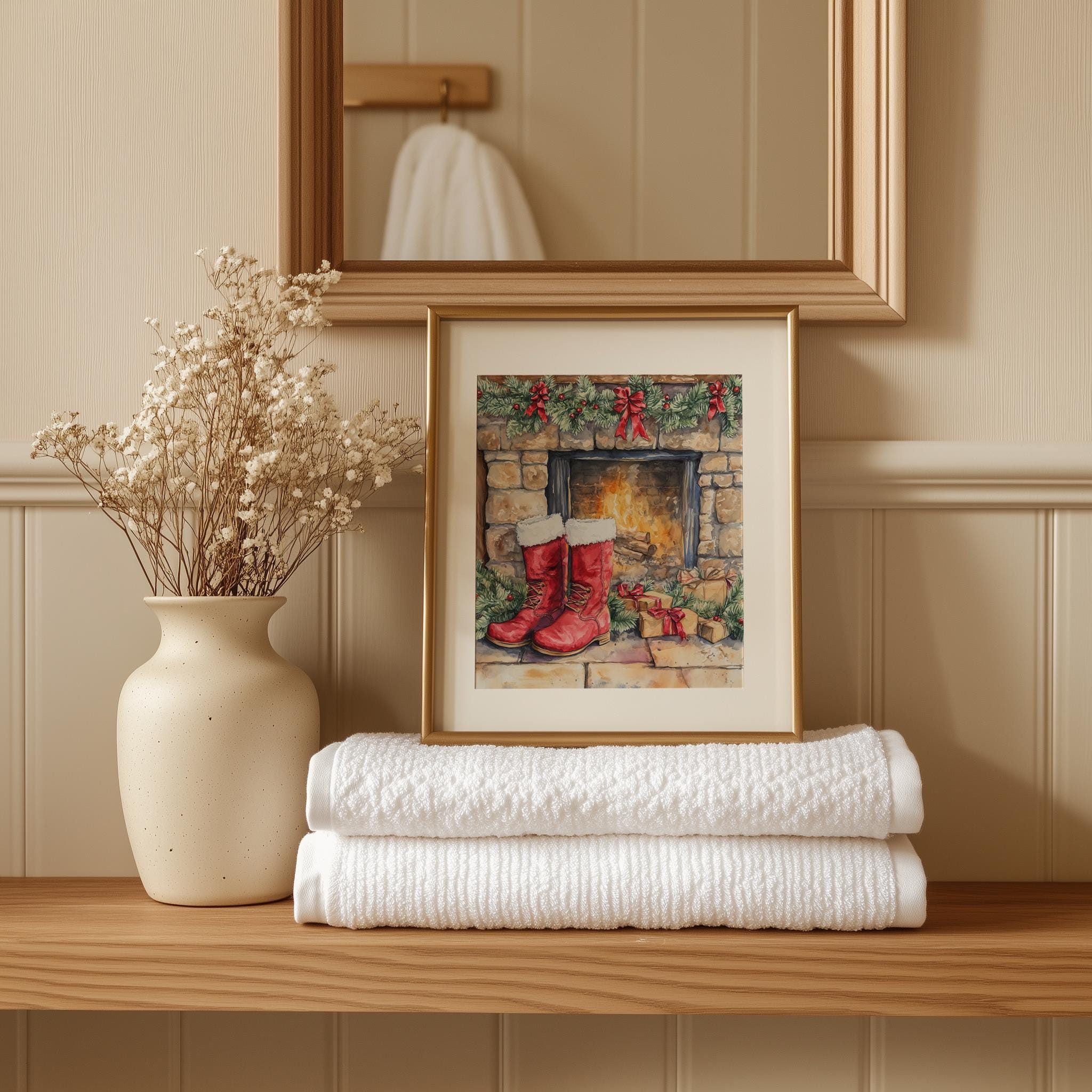 Immerse yourself in the charm with this rustic painting of a pair of vintage Santa boots resting by a warm, inviting fireplace. An instantly downloadable print, it's perfect for elevating your decor with budget-friendly charm. This gives you the flexibility to customize the size, frame, and material according to your personal taste and space, ensuring a perfect fit for your walls.