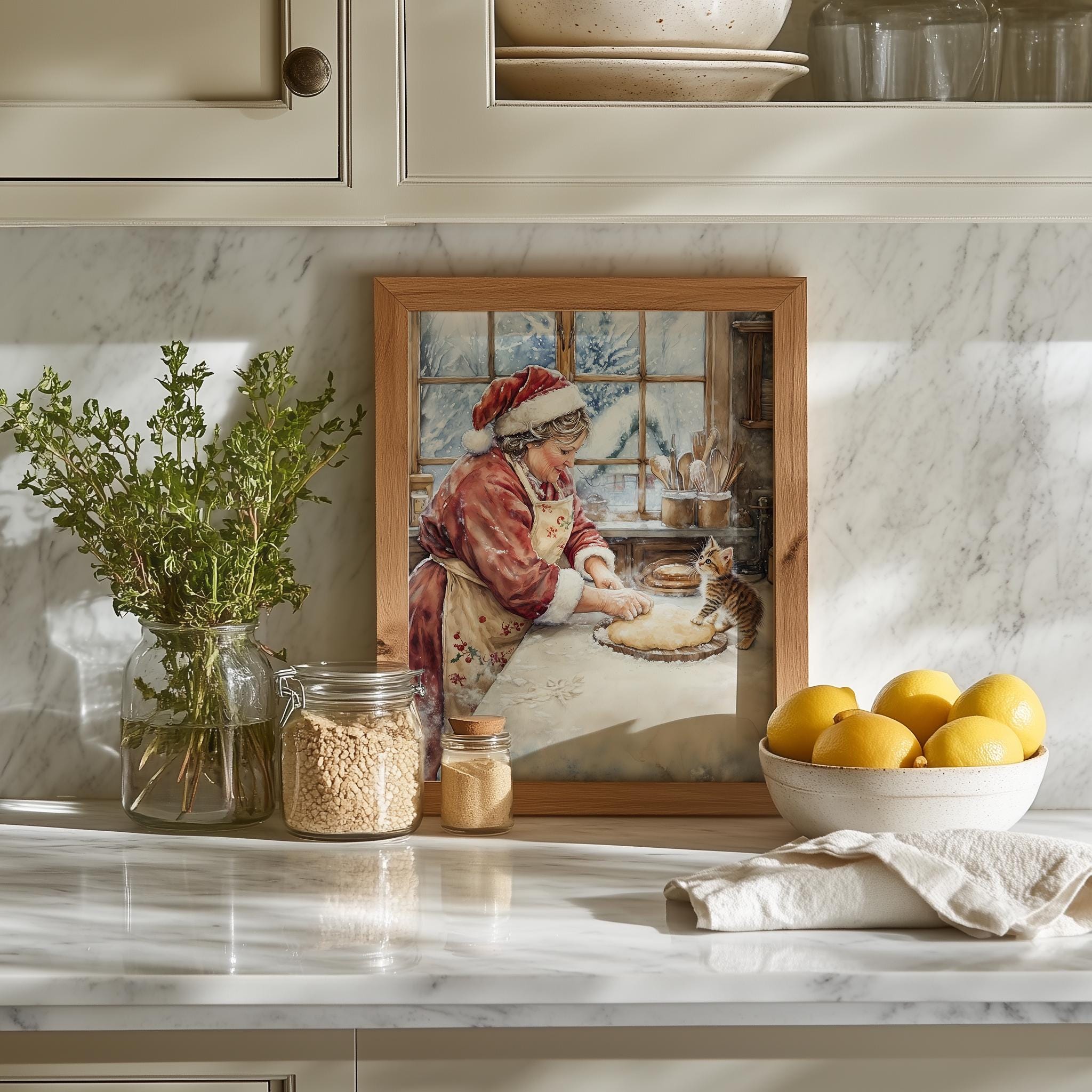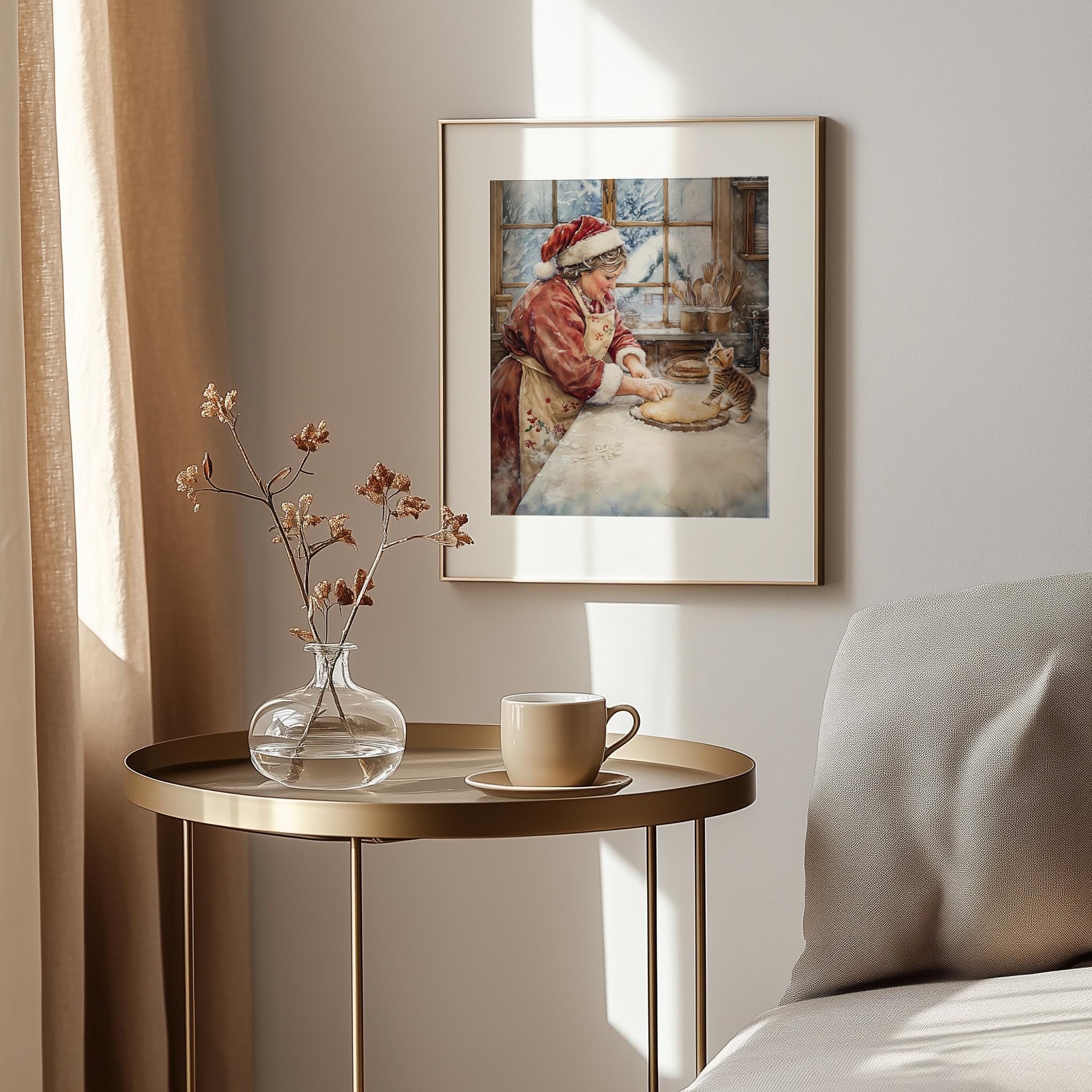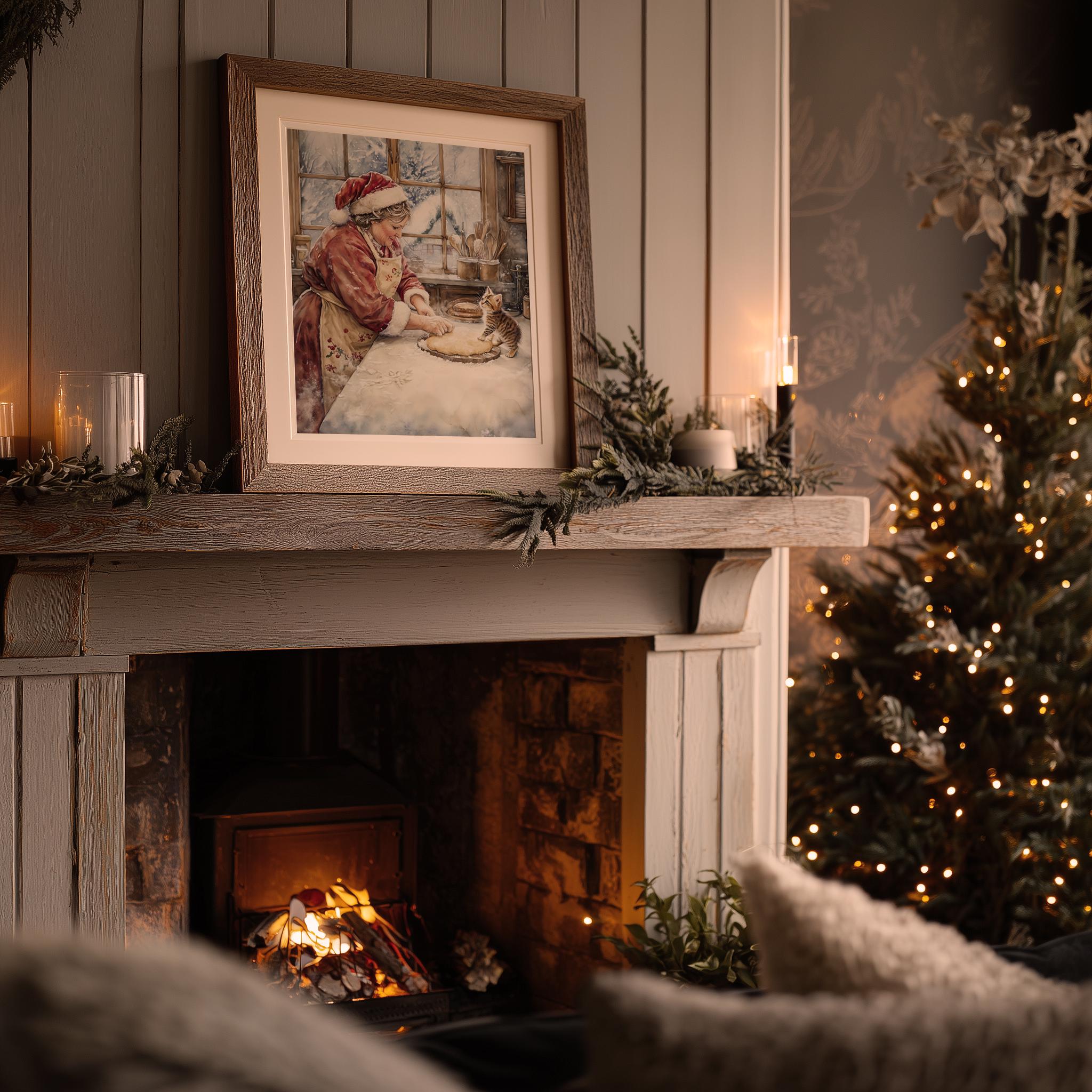 Immerse yourself in the charm with this rustic painting of Mrs. Claus joyfully rolling out dough in a warm kitchen, surrounded by festive holiday touches. An instantly downloadable print, it's perfect for elevating your decor with budget-friendly charm. This gives you the flexibility to customize the size, frame, and material according to your personal taste and space, ensuring a perfect fit for your walls.