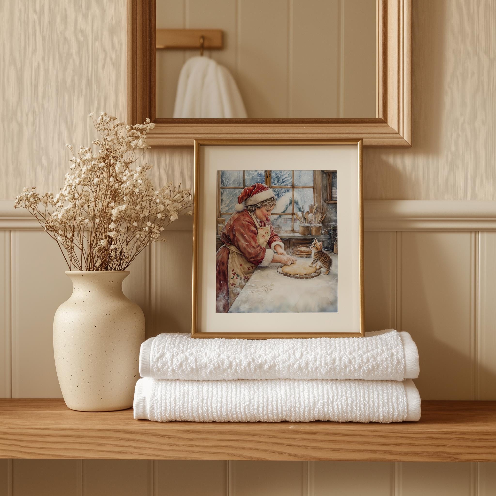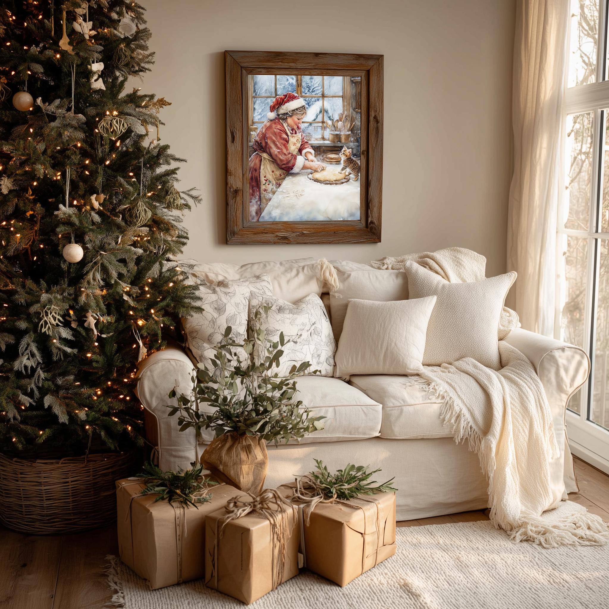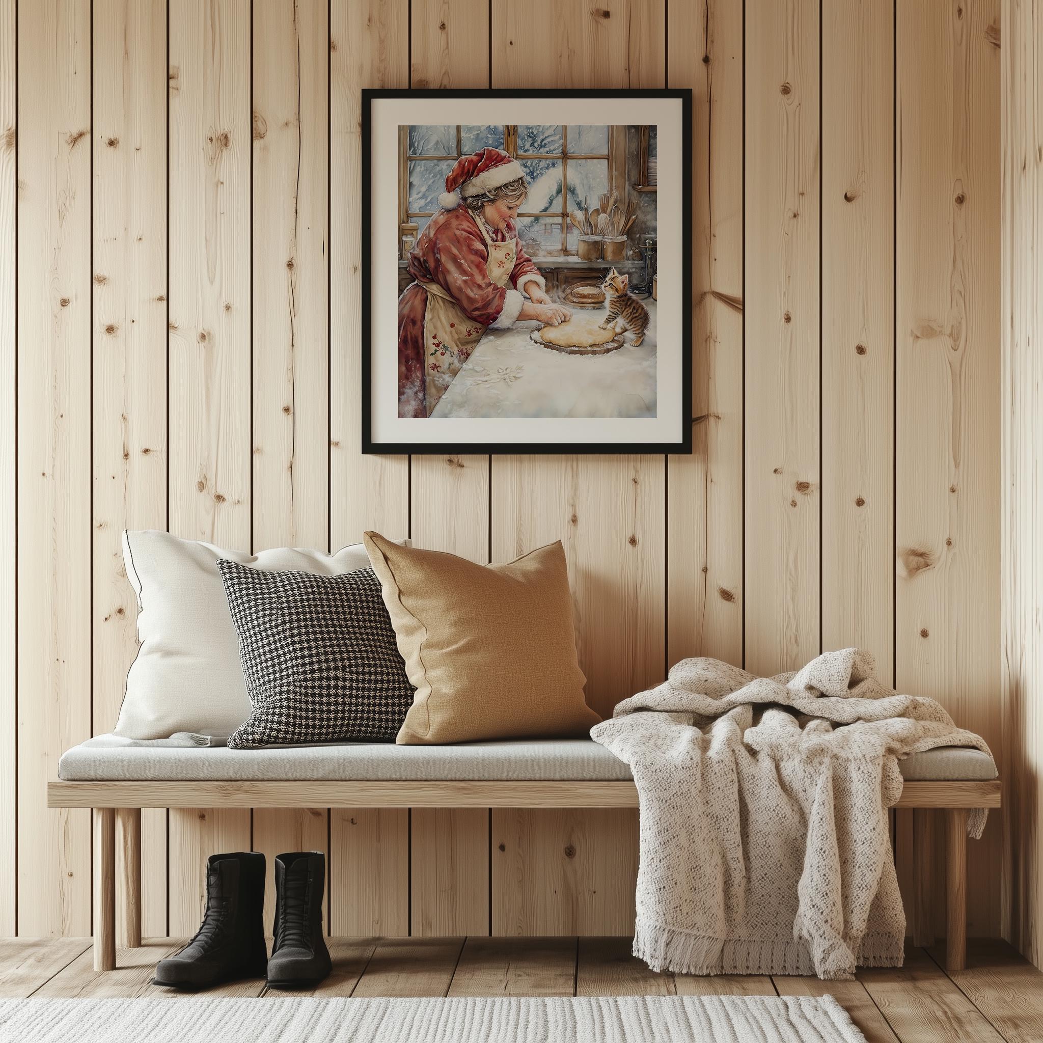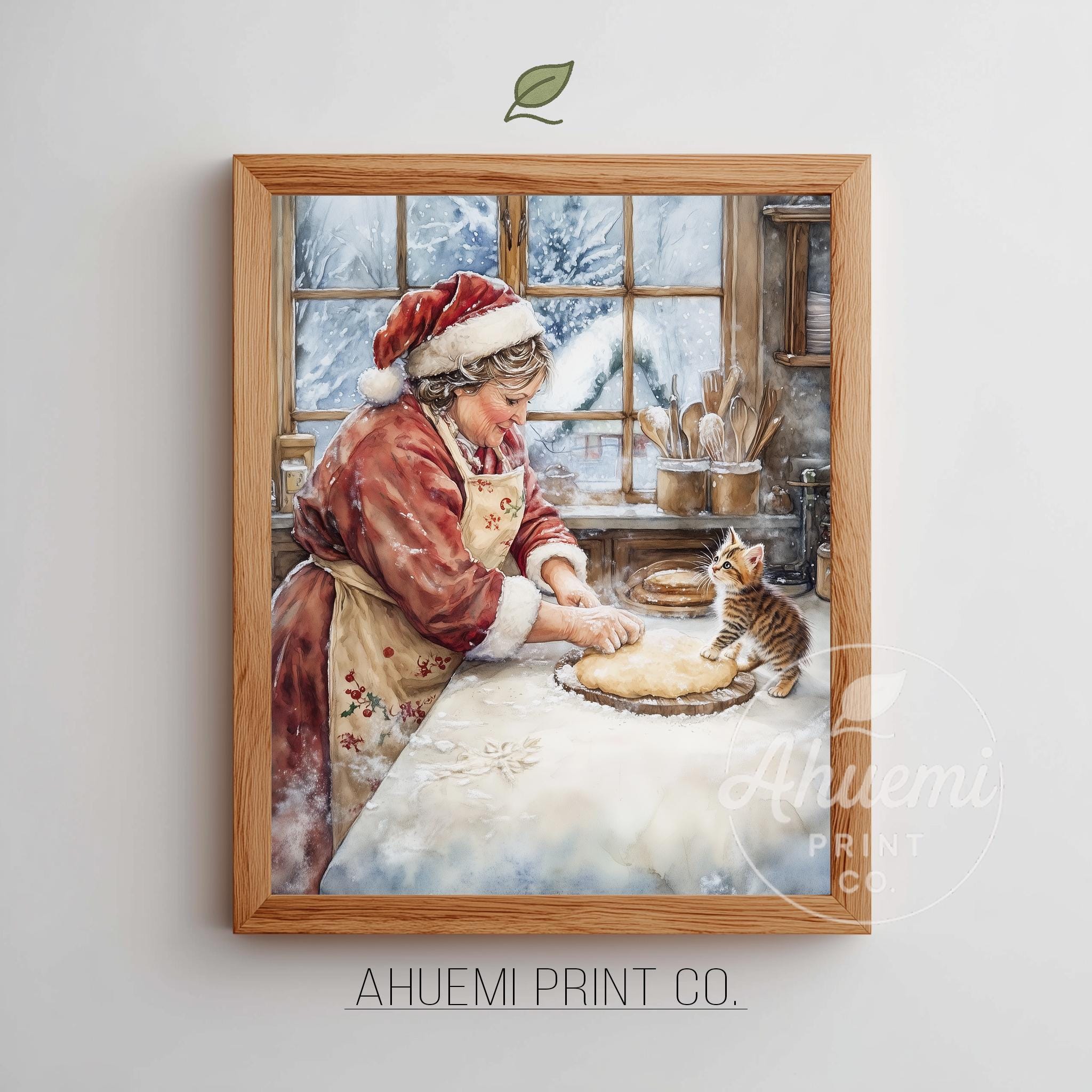 Immerse yourself in the charm with this rustic painting of Mrs. Claus joyfully rolling out dough in a warm kitchen, surrounded by festive holiday touches. An instantly downloadable print, it's perfect for elevating your decor with budget-friendly charm. This gives you the flexibility to customize the size, frame, and material according to your personal taste and space, ensuring a perfect fit for your walls.