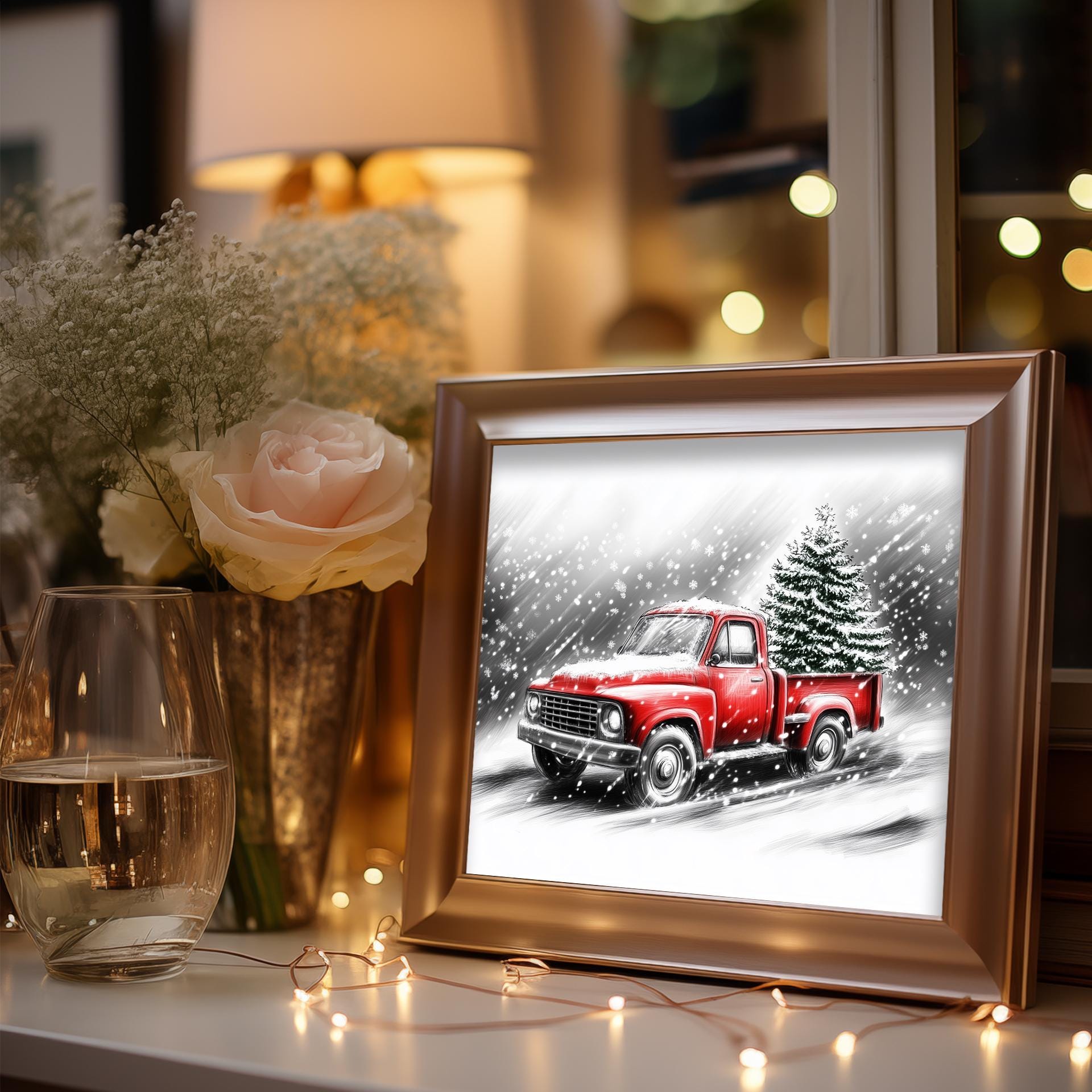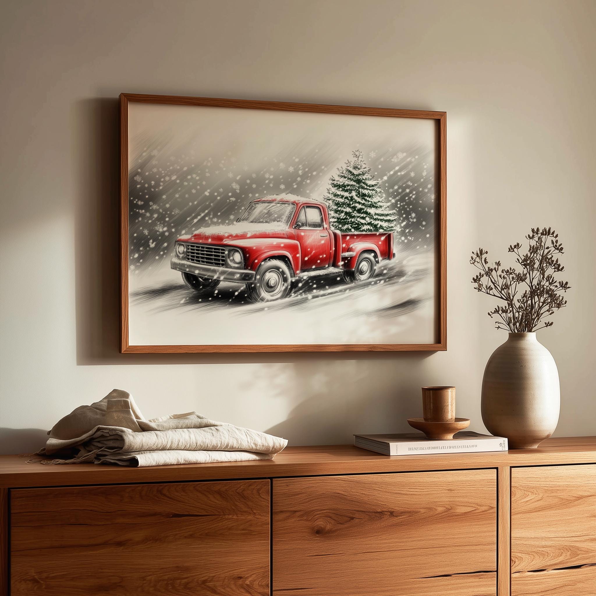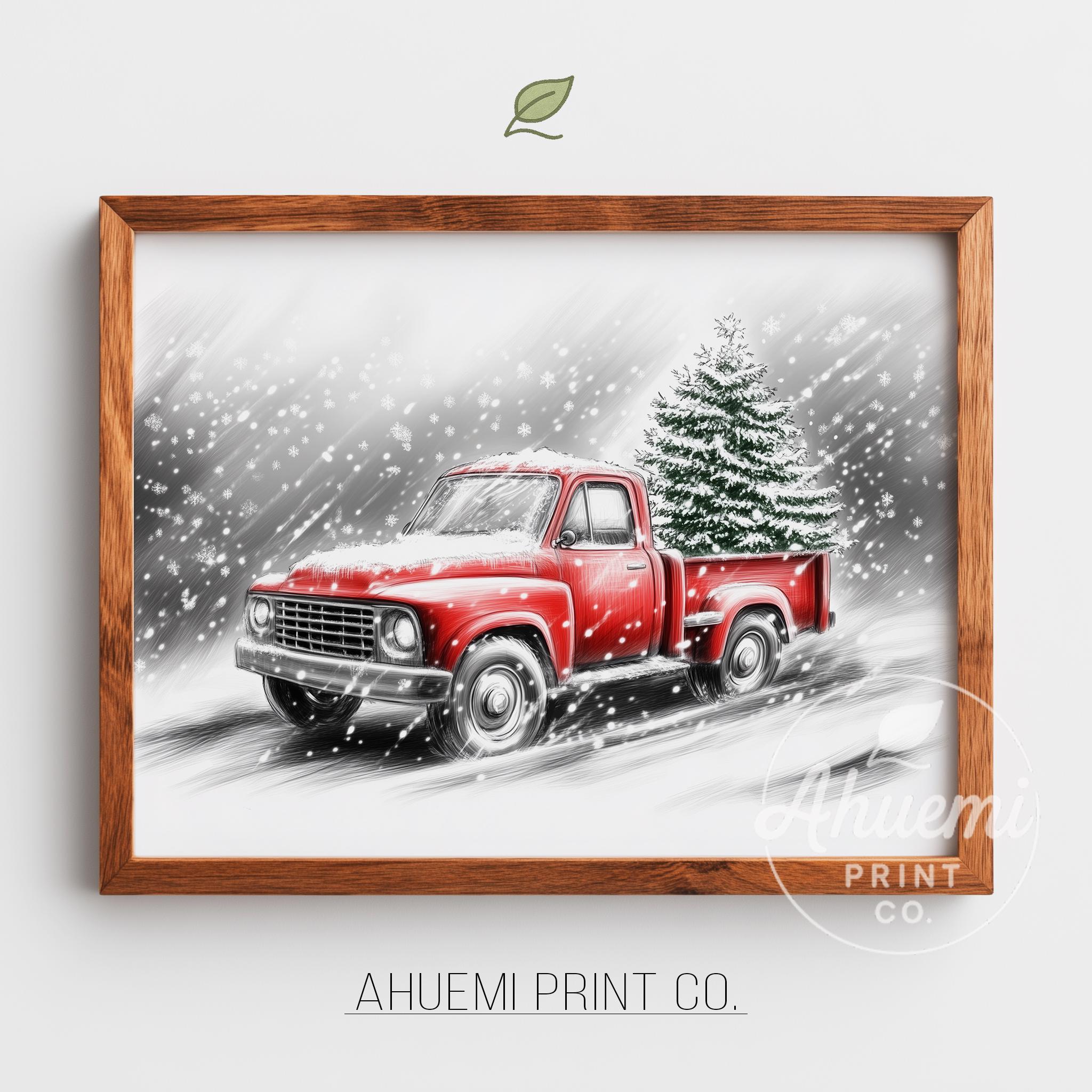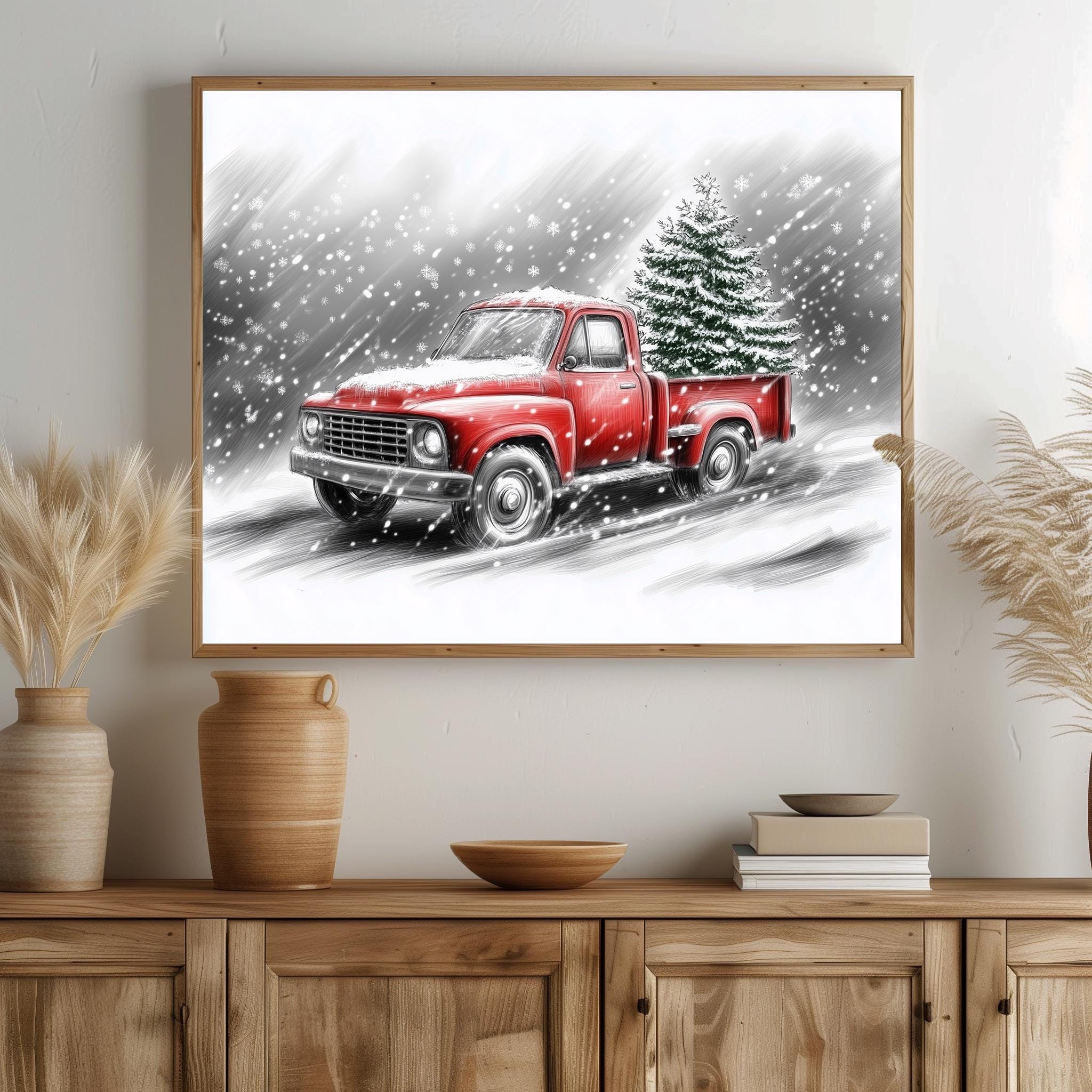 Immerse yourself in the charm with this rustic painting of a vintage pickup truck adorned with a lush evergreen tree in its bed, set against a serene winter backdrop. An instantly downloadable print, it's perfect for elevating your decor with budget-friendly charm. This gives you the flexibility to customize the size, frame, and material according to your personal taste and space, ensuring a perfect fit for your walls.