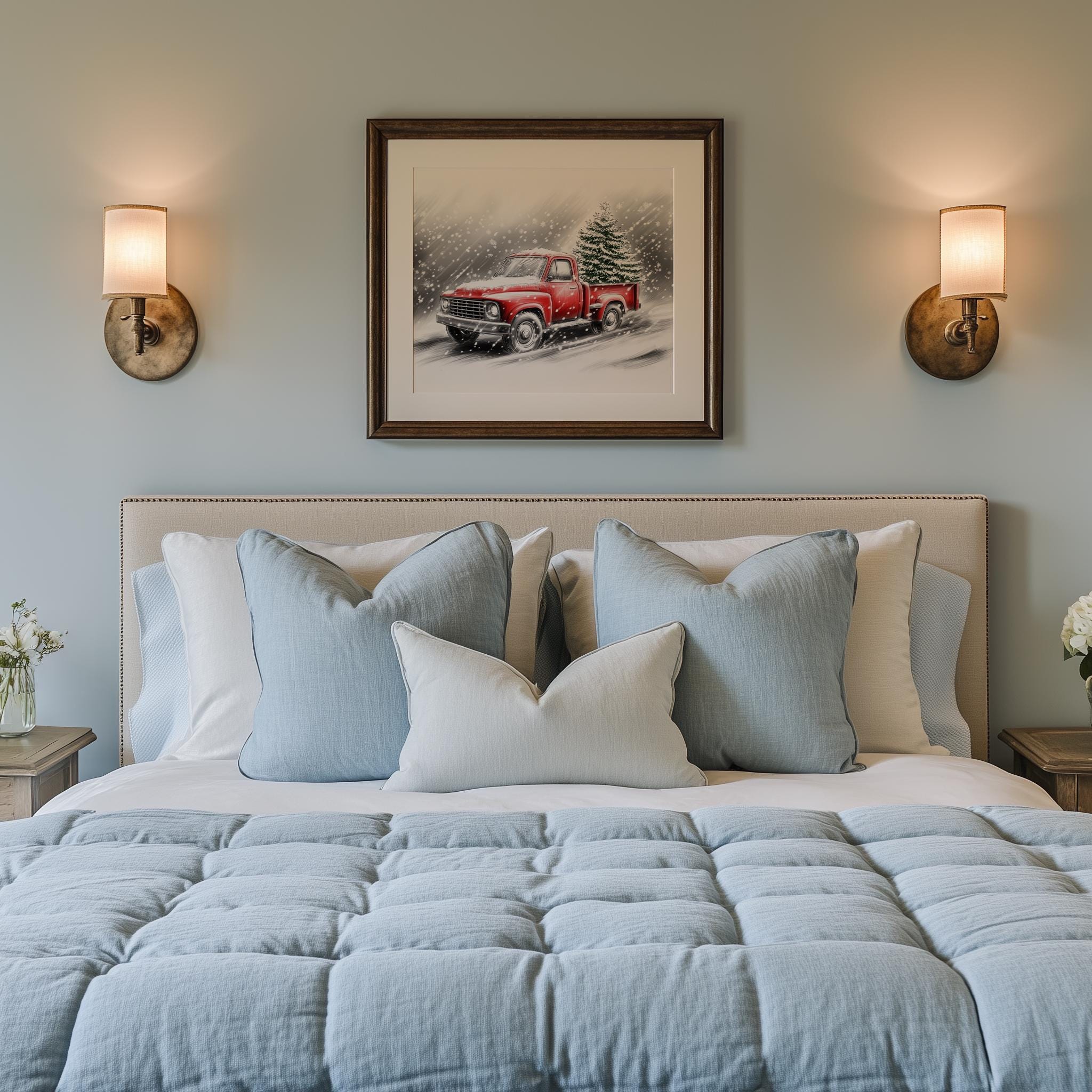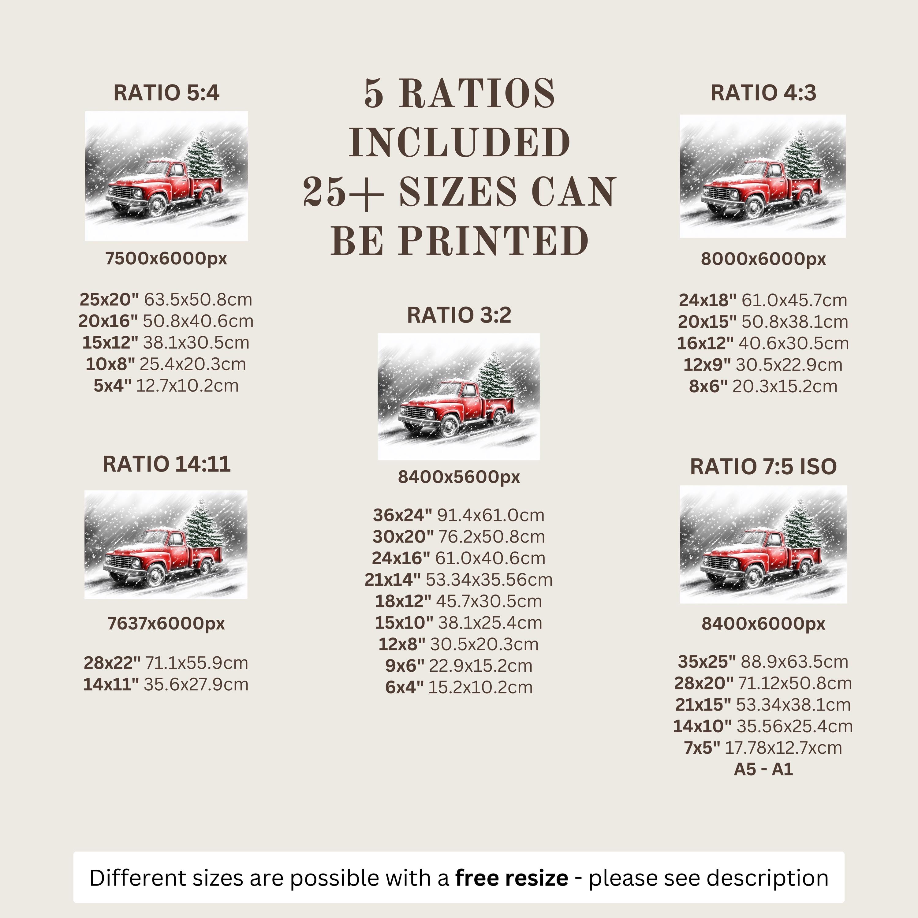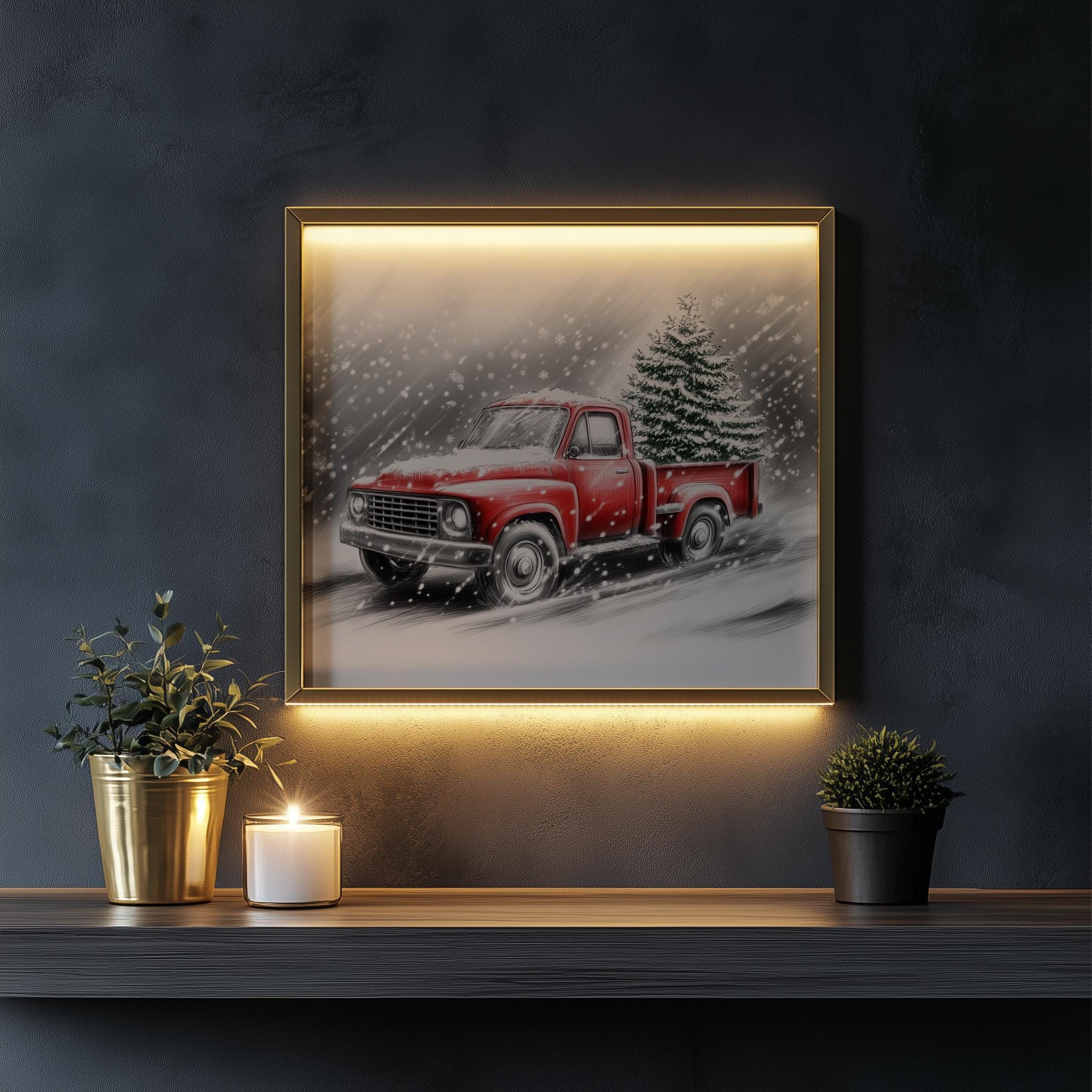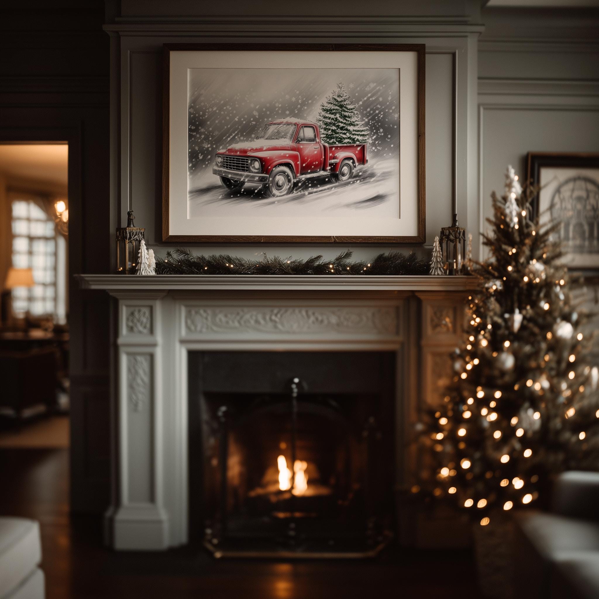 Immerse yourself in the charm with this rustic painting of a vintage pickup truck adorned with a lush evergreen tree in its bed, set against a serene winter backdrop. An instantly downloadable print, it's perfect for elevating your decor with budget-friendly charm. This gives you the flexibility to customize the size, frame, and material according to your personal taste and space, ensuring a perfect fit for your walls.