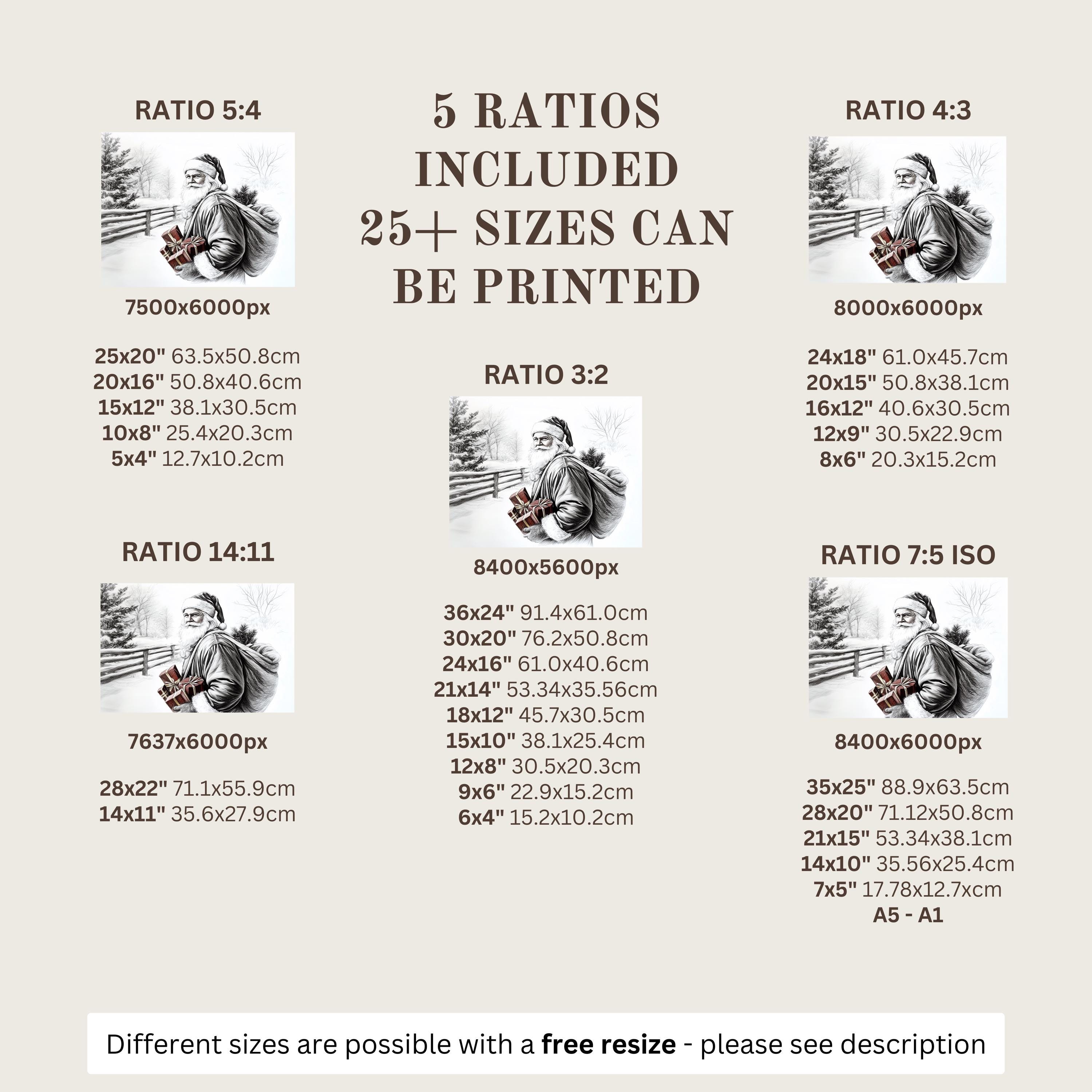 Each artwork includes 5 aspect ratios with 25+ print sizes. Most standard frames are covered. One custom resize per purchase available—message before ordering.