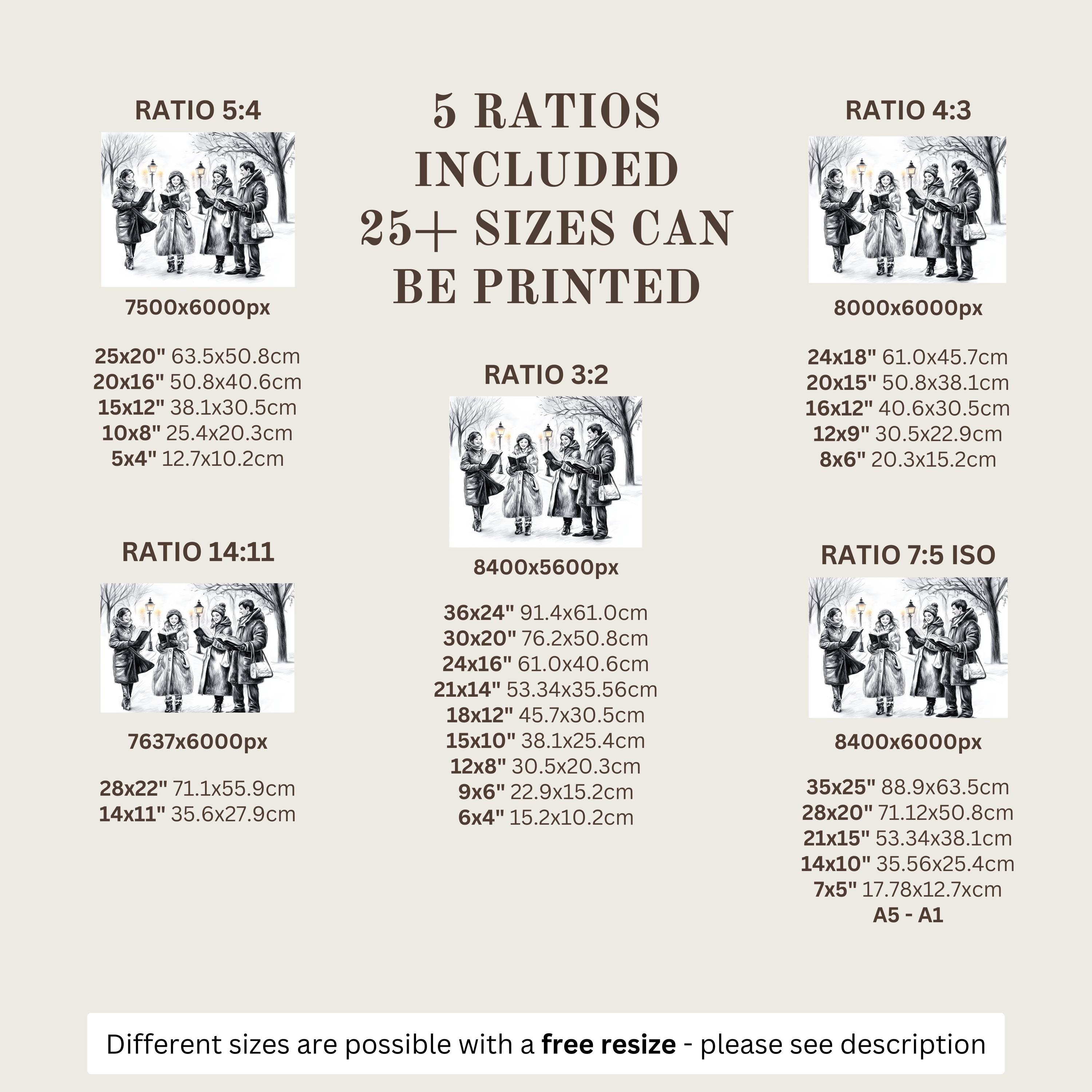 Each artwork includes 5 aspect ratios with 25+ print sizes. Most standard frames are covered. One custom resize per purchase available—message before ordering.