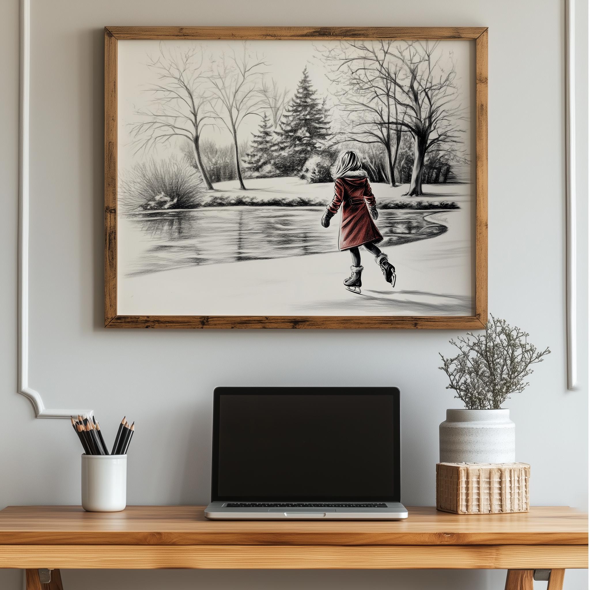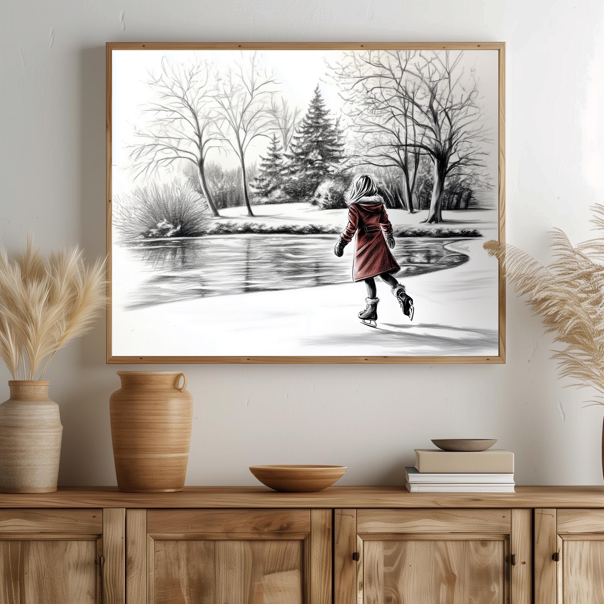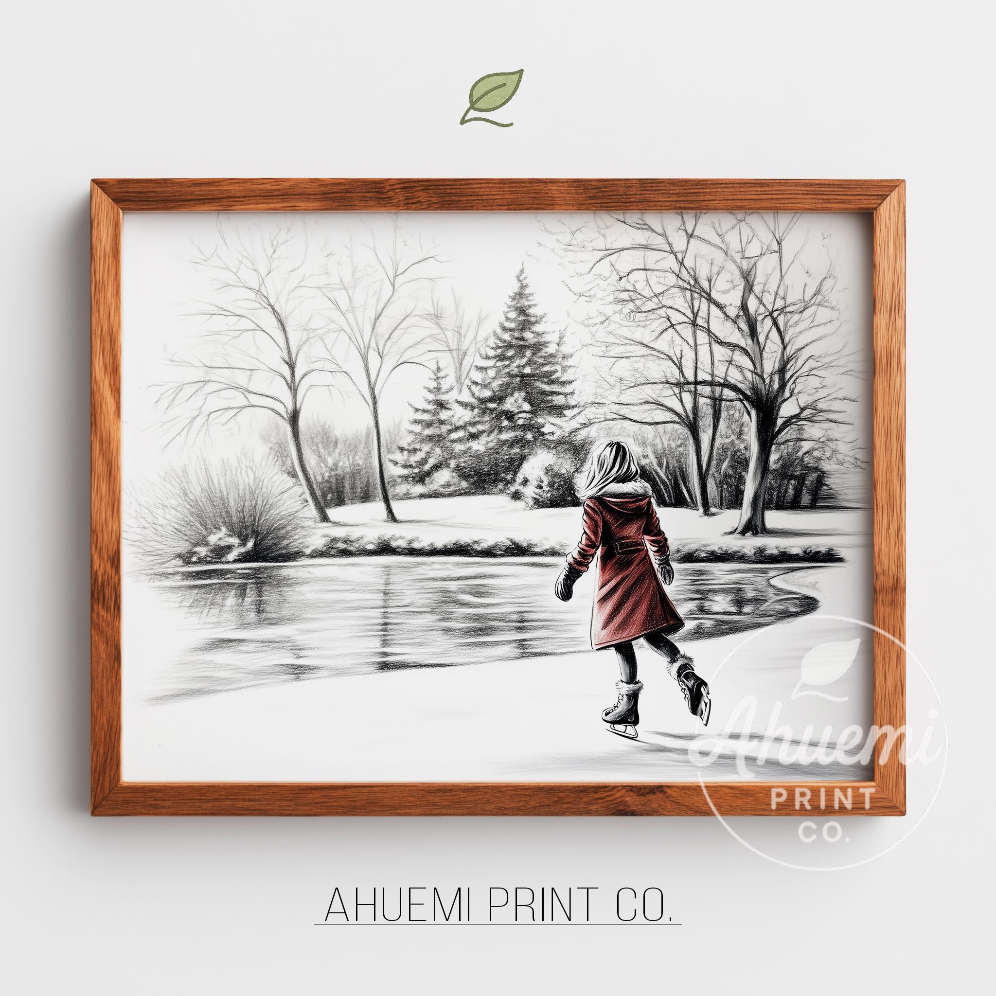 Looking to add a touch of winter nostalgia to your home? Our Vintage Ice Skating Pond Scene might just be the perfect pick for you. This Printable Winter Wall Art effortlessly captures the serene landscape of a cozy girl in a red coat as she glides across a frozen pond, bringing warmth and charm to any room. The monochrome artwork offers a timeless appeal that blends beautifully with most decor styles. As a digital download, it's super convenient—just print and hang! It's not just art; it's a quick escape to a simpler, more peaceful winter wonderland. Perfect for adding that cozy, serene vibe to your living space.