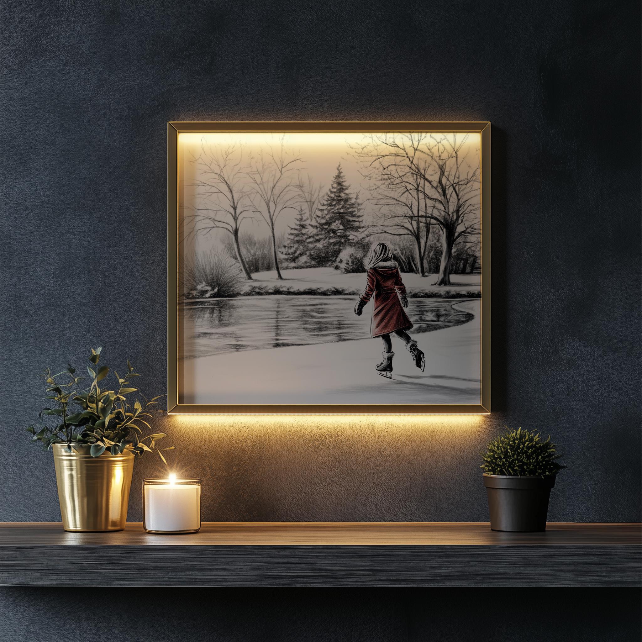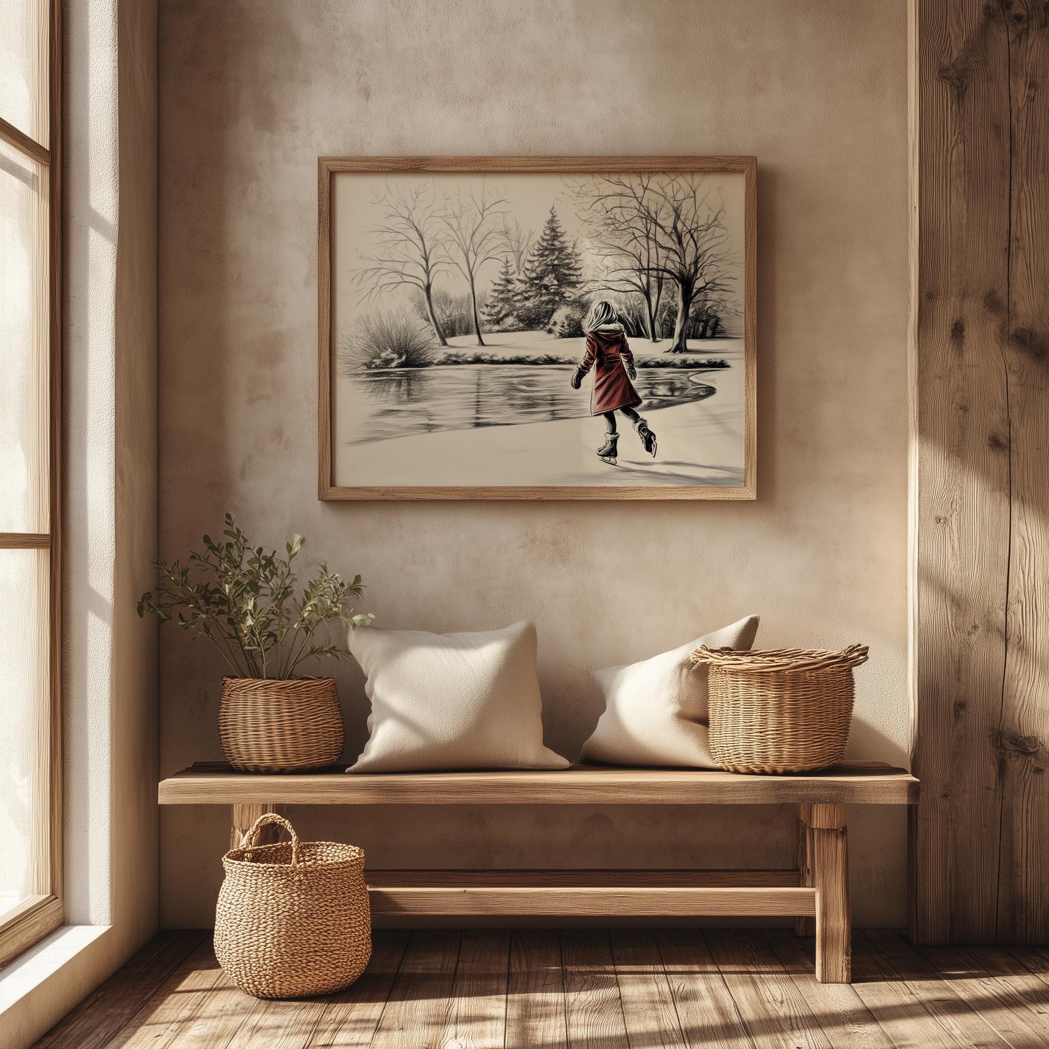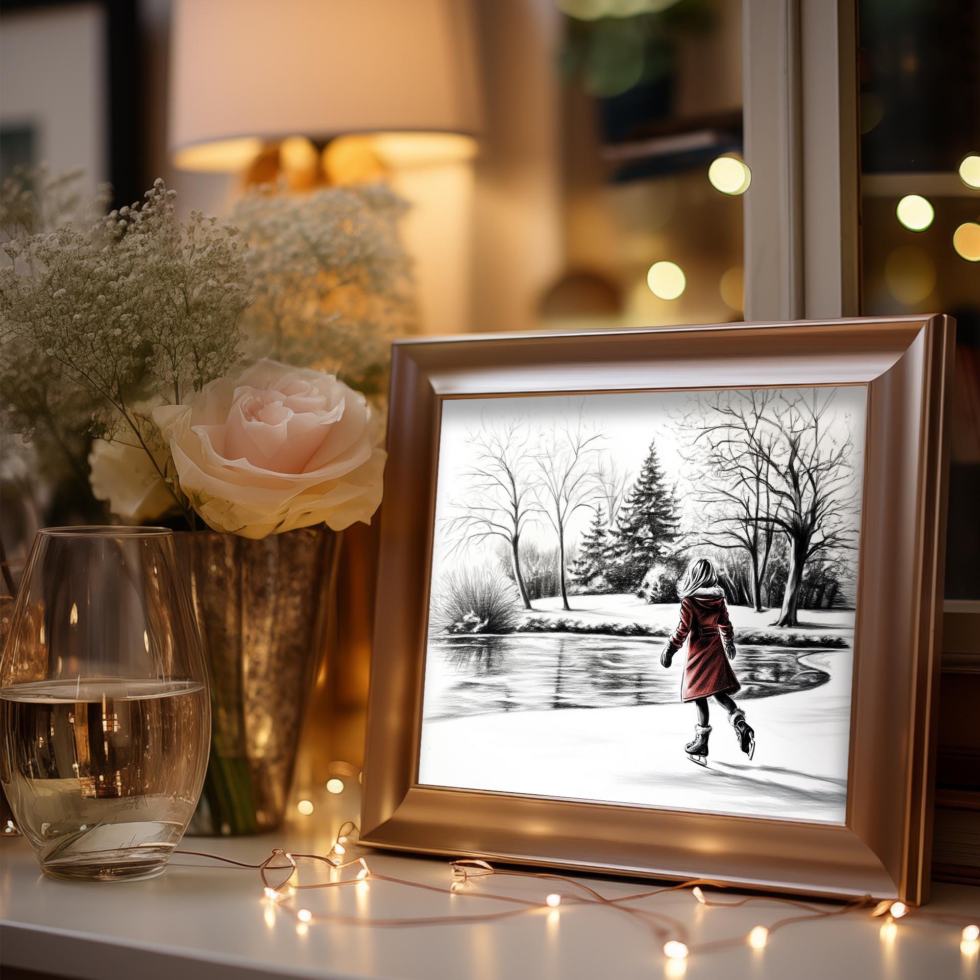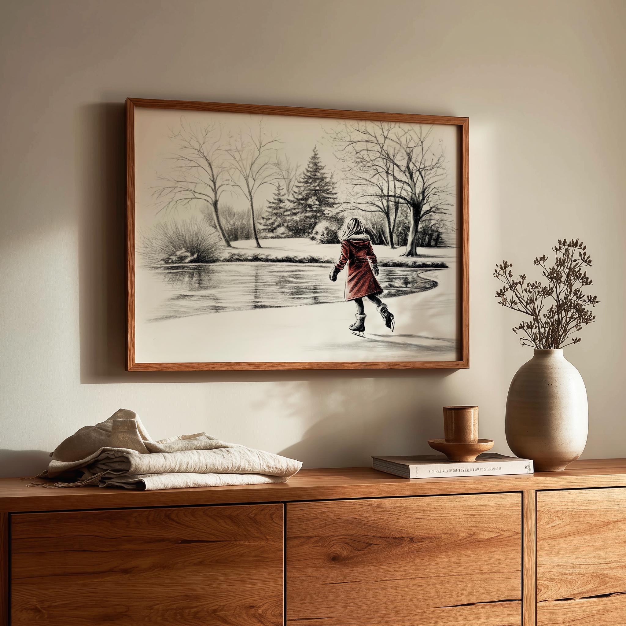 Looking to add a touch of winter nostalgia to your home? Our Vintage Ice Skating Pond Scene might just be the perfect pick for you. This Printable Winter Wall Art effortlessly captures the serene landscape of a cozy girl in a red coat as she glides across a frozen pond, bringing warmth and charm to any room. The monochrome artwork offers a timeless appeal that blends beautifully with most decor styles. As a digital download, it's super convenient—just print and hang! It's not just art; it's a quick escape to a simpler, more peaceful winter wonderland. Perfect for adding that cozy, serene vibe to your living space.