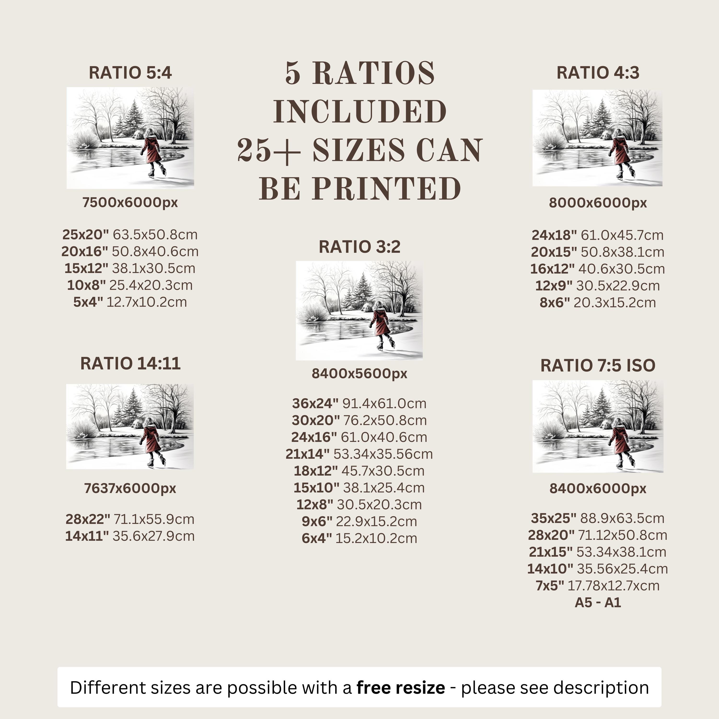 Each artwork includes 5 aspect ratios with 25+ print sizes. Most standard frames are covered. One custom resize per purchase available—message before ordering.