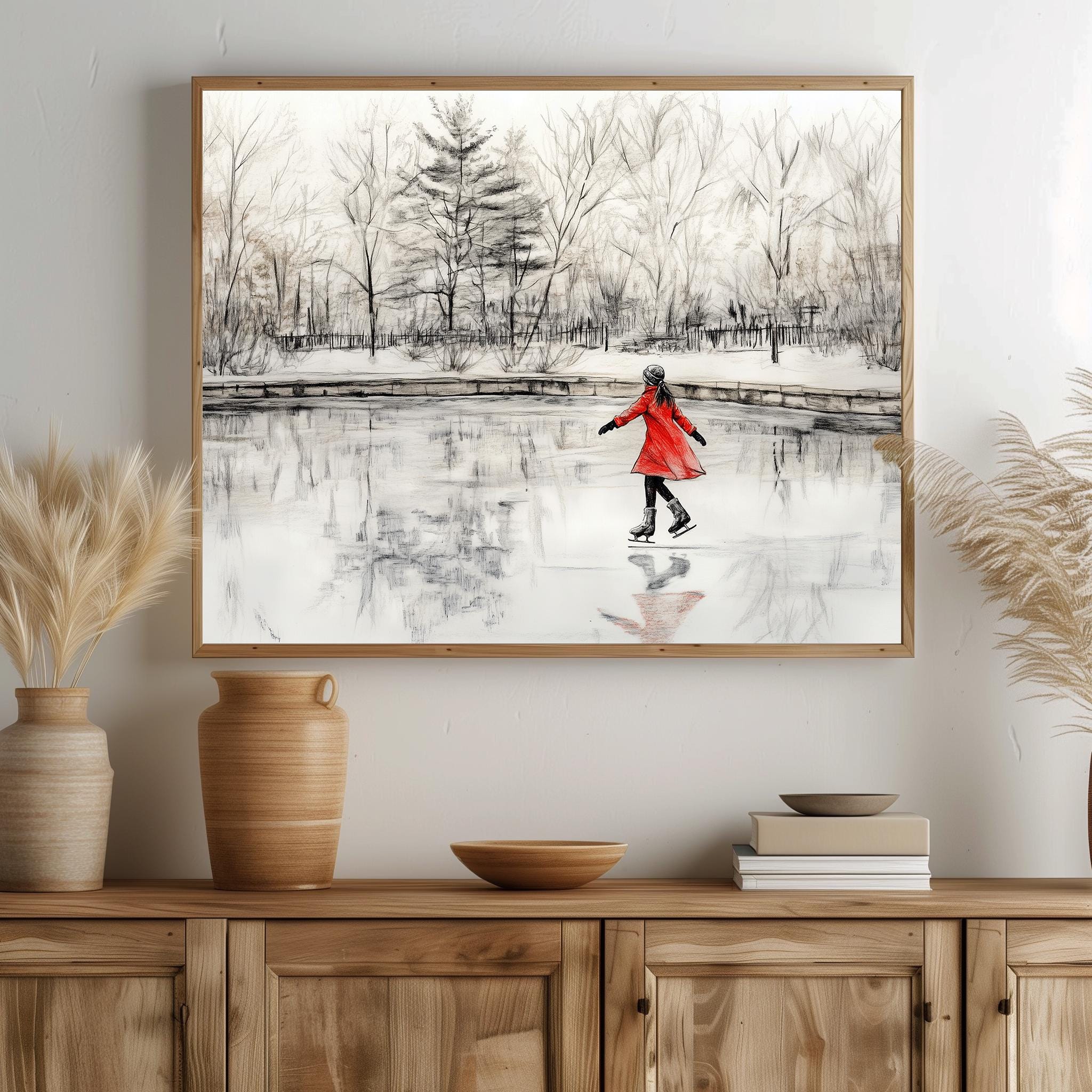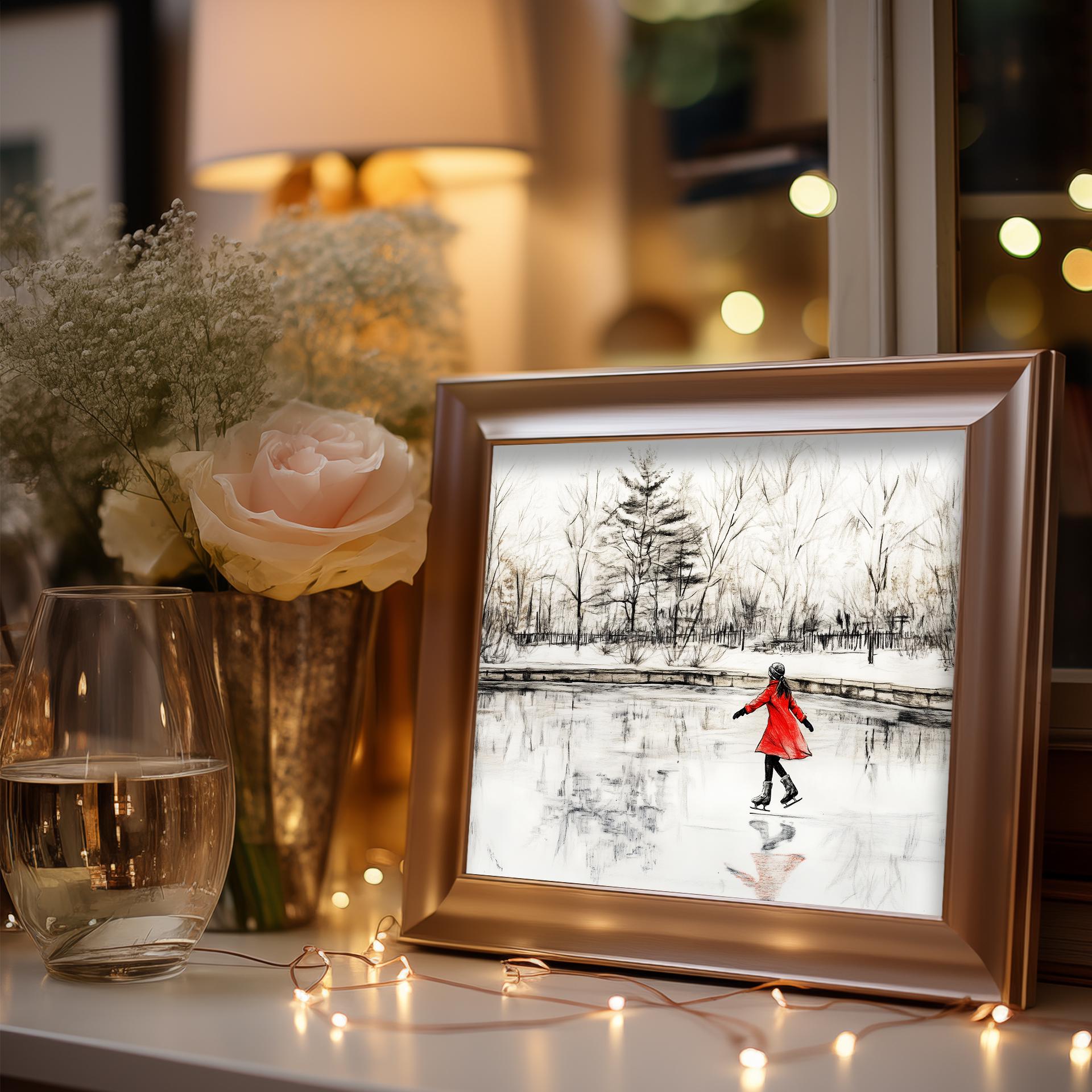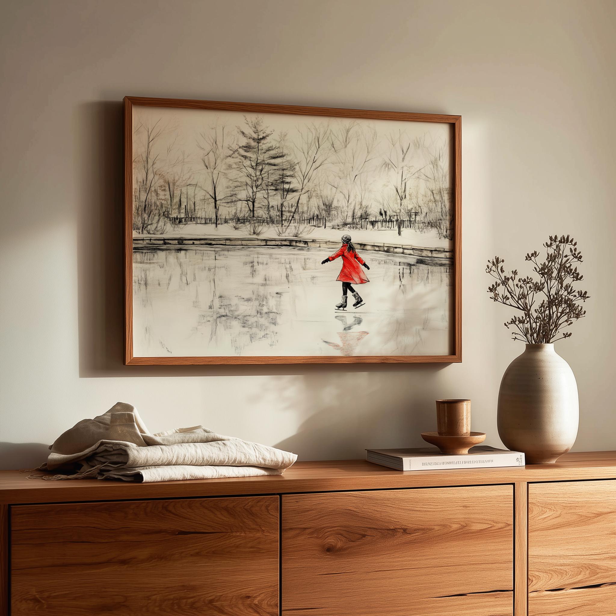 Immerse yourself in the charm with this rustic painting of a girl in a red coat gracefully ice skating on a serene pond surrounded by winter trees. An instantly downloadable print, it's perfect for elevating your decor with budget-friendly charm. This gives you the flexibility to customize the size, frame, and material according to your personal taste and space, ensuring a perfect fit for your walls.