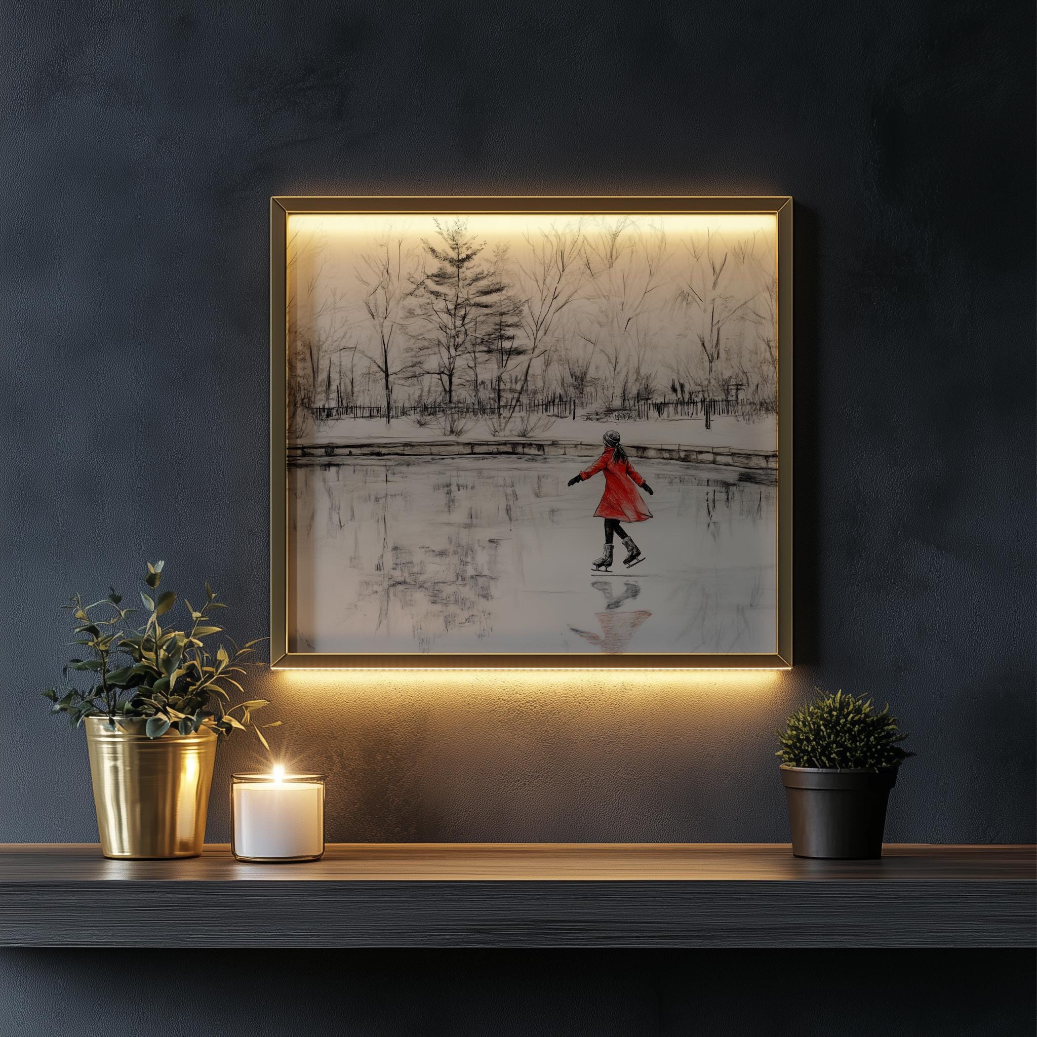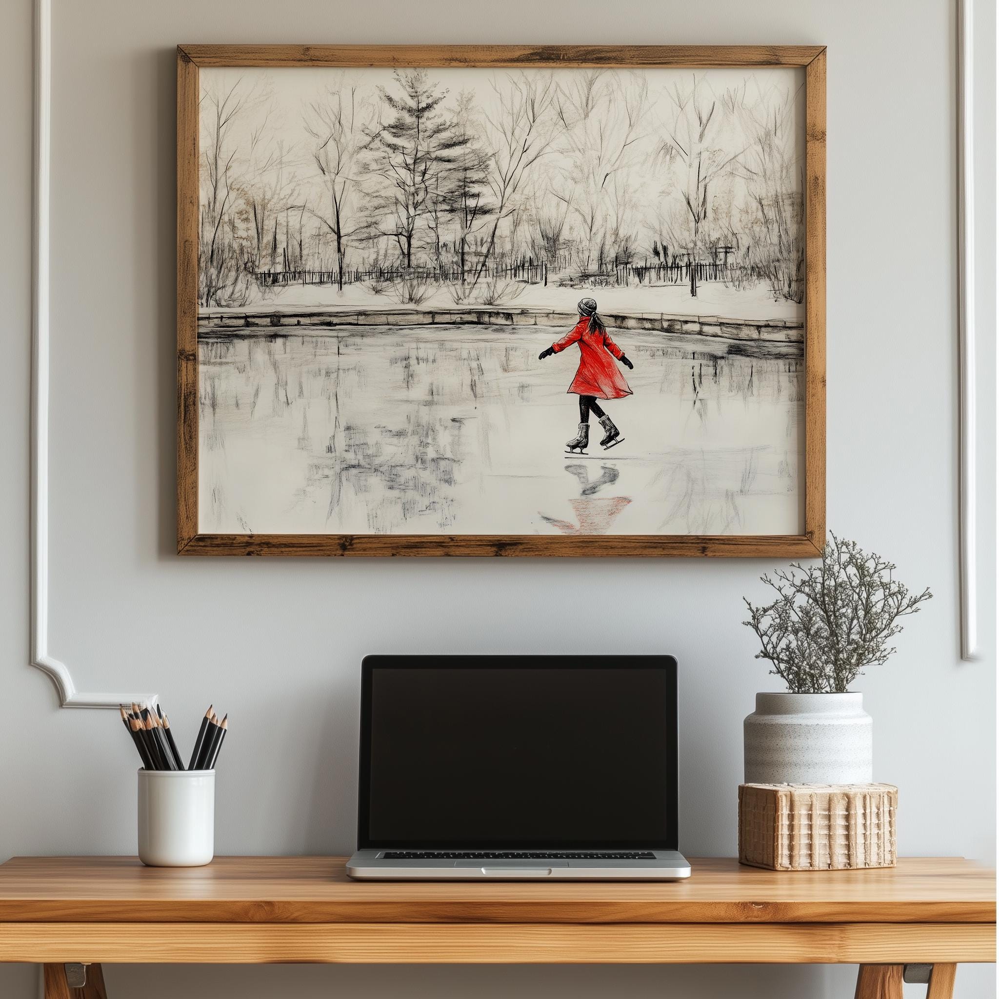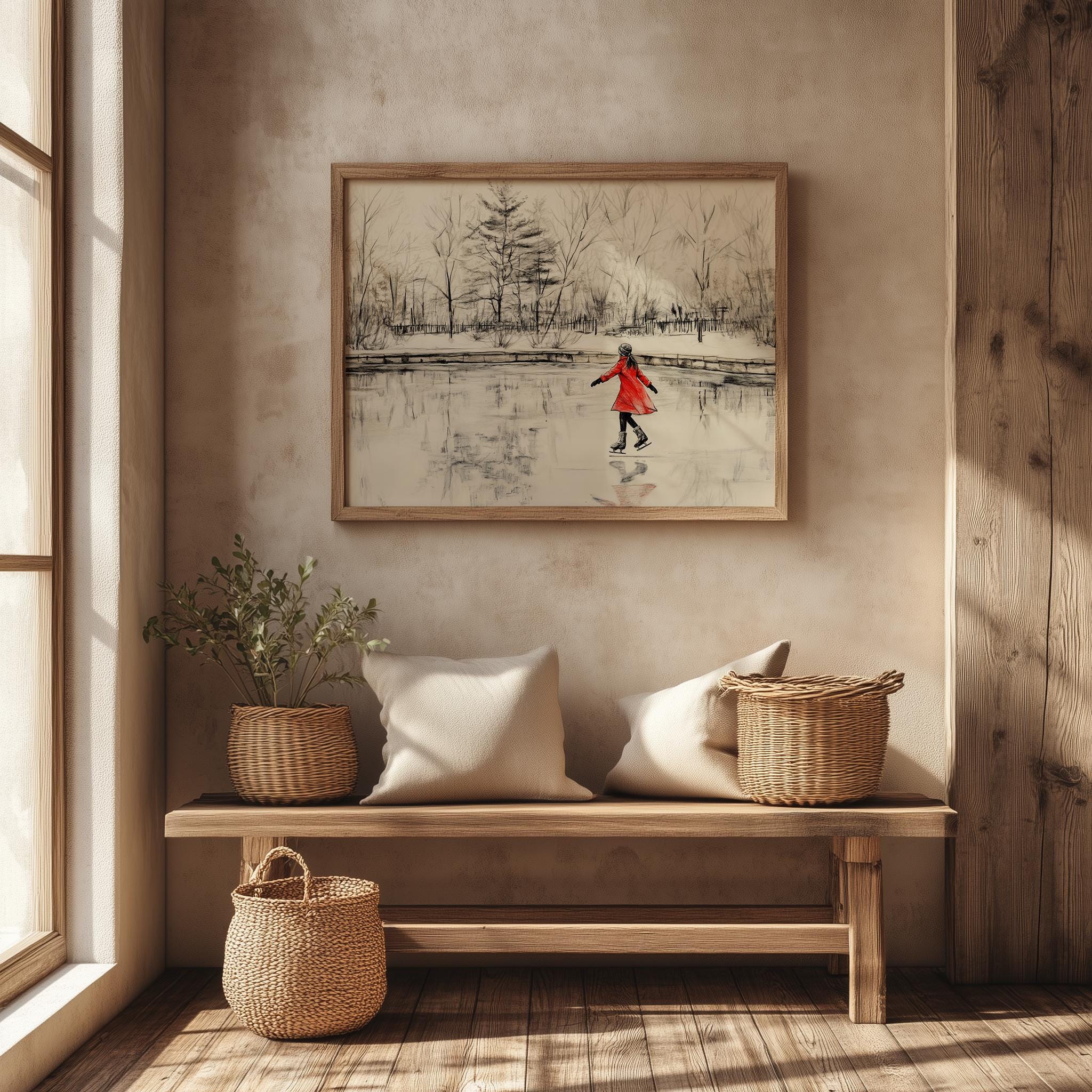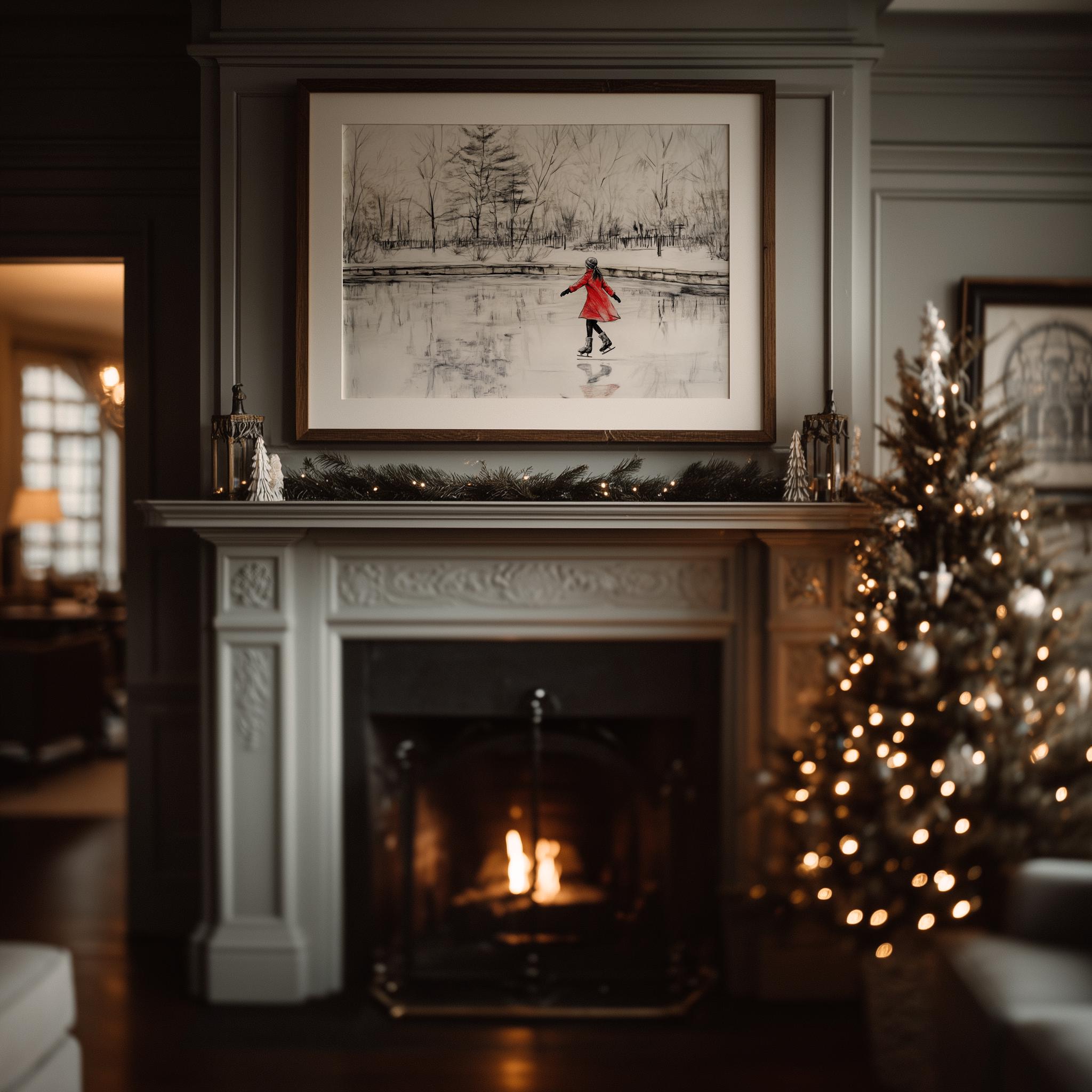 Immerse yourself in the charm with this rustic painting of a girl in a red coat gracefully ice skating on a serene pond surrounded by winter trees. An instantly downloadable print, it's perfect for elevating your decor with budget-friendly charm. This gives you the flexibility to customize the size, frame, and material according to your personal taste and space, ensuring a perfect fit for your walls.