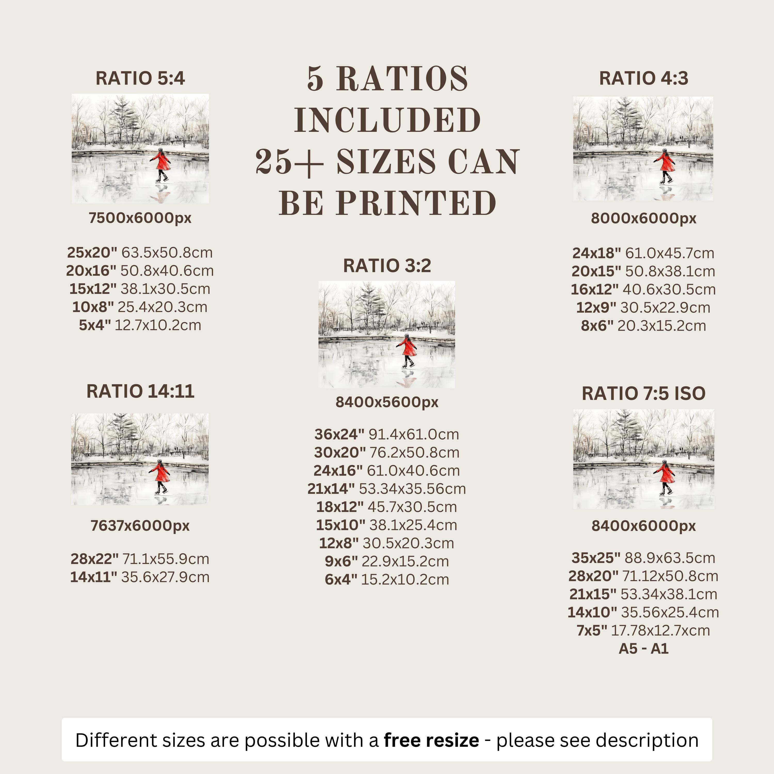 Each artwork includes 5 aspect ratios with 25+ print sizes. Most standard frames are covered. One custom resize per purchase available—message before ordering.