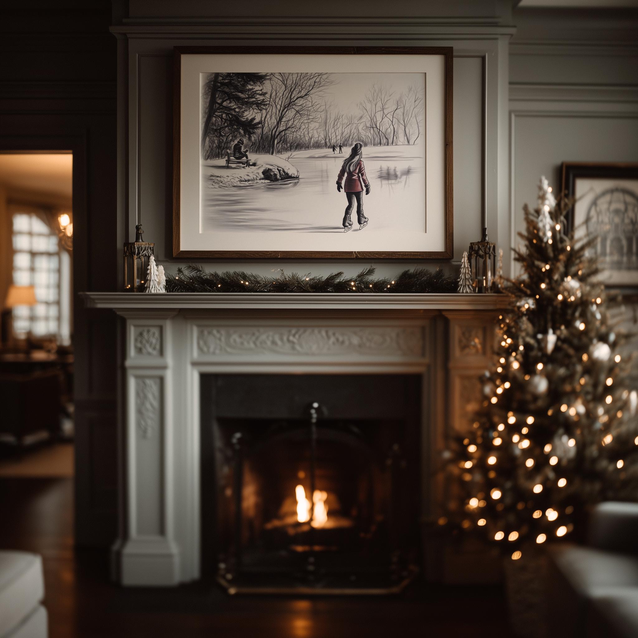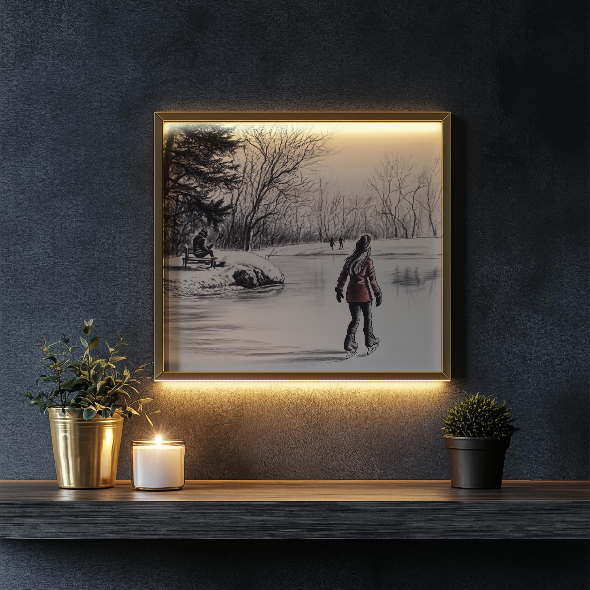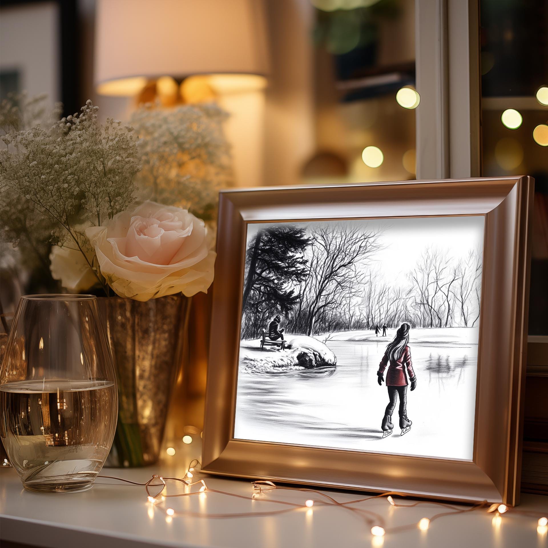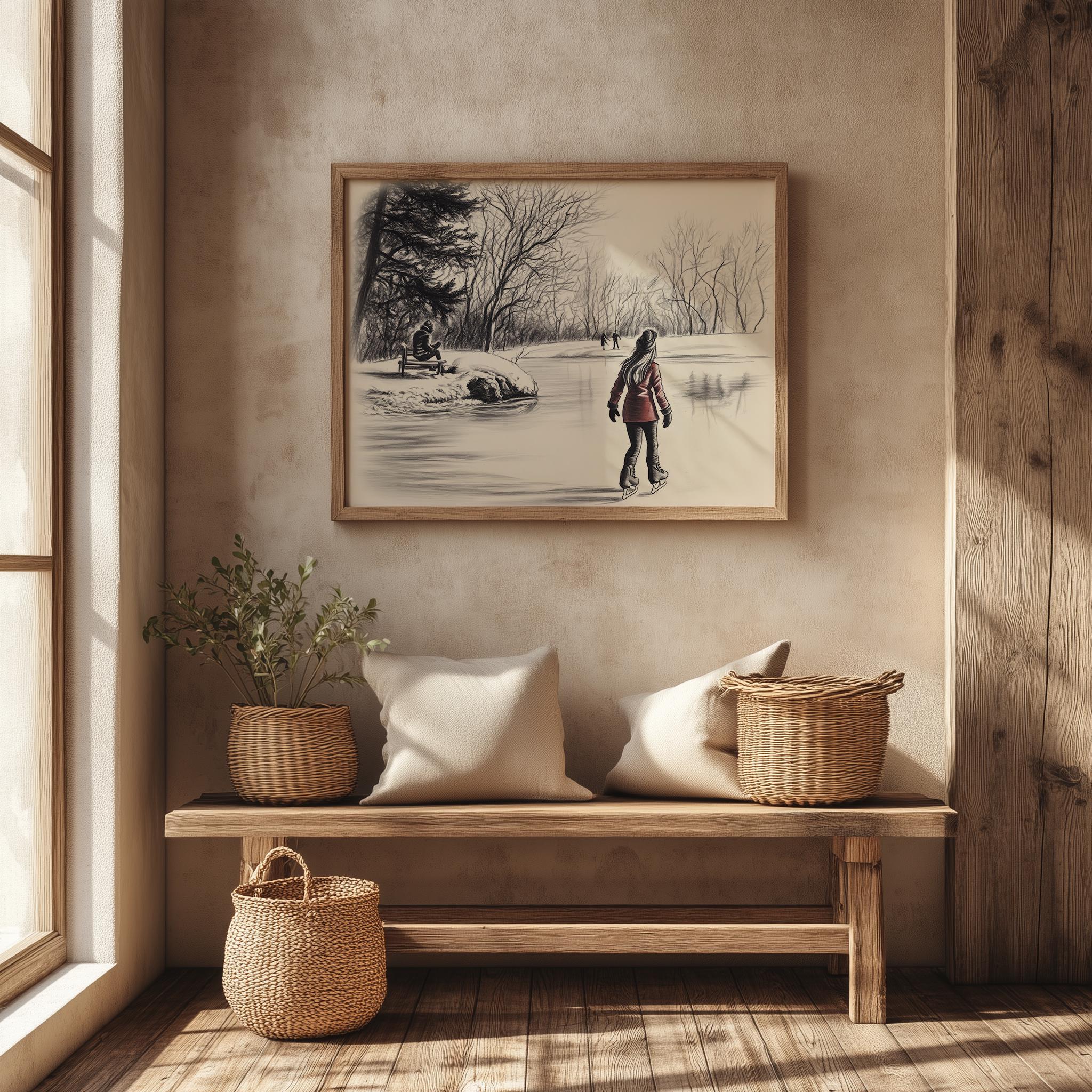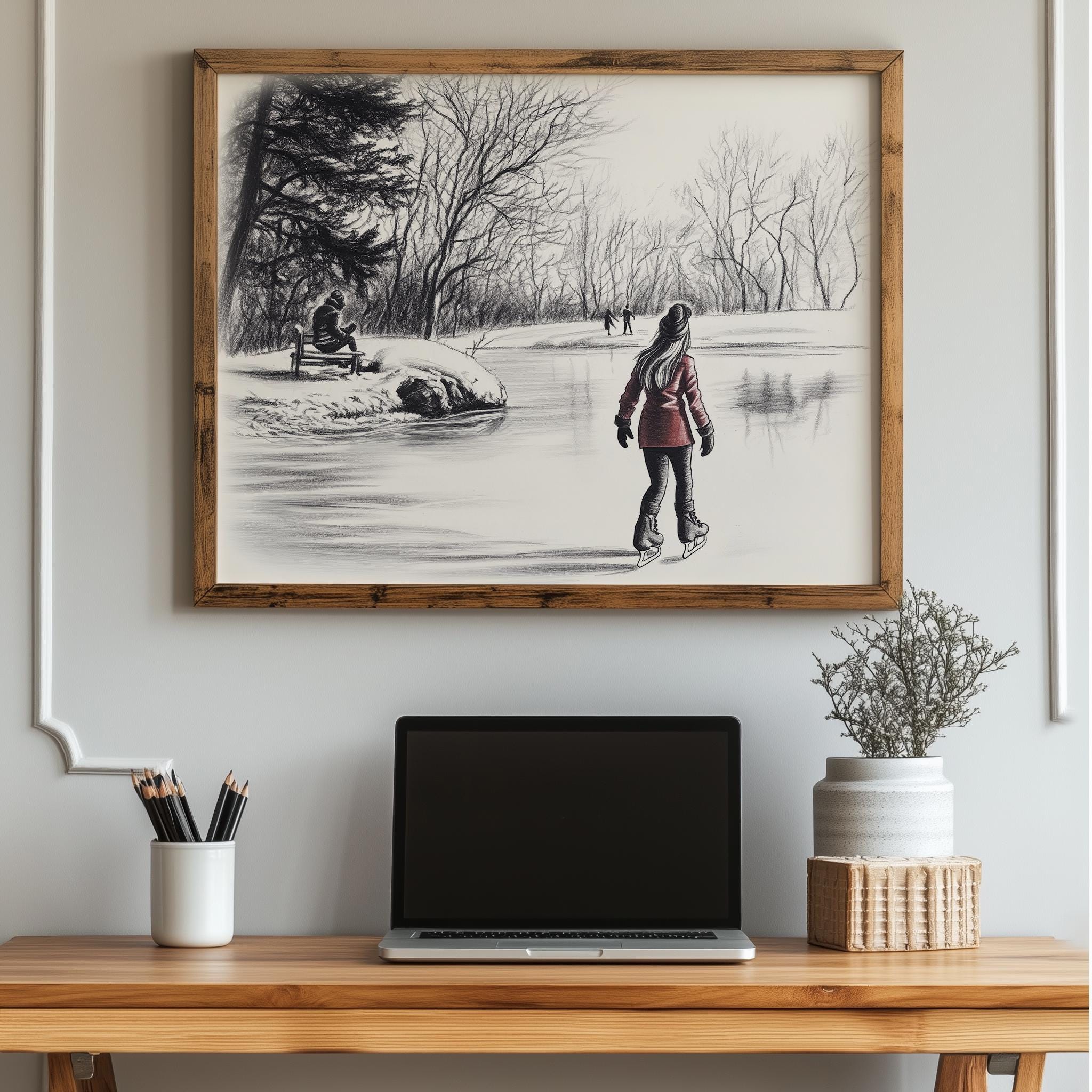 Immerse yourself in the charm with this rustic painting of a serene ice skating pond scene, where joyful skaters glide across the glistening surface surrounded by a tranquil winter landscape. An instantly downloadable print, it's perfect for elevating your decor with budget-friendly charm. This gives you the flexibility to customize the size, frame, and material according to your personal taste and space, ensuring a perfect fit for your walls.