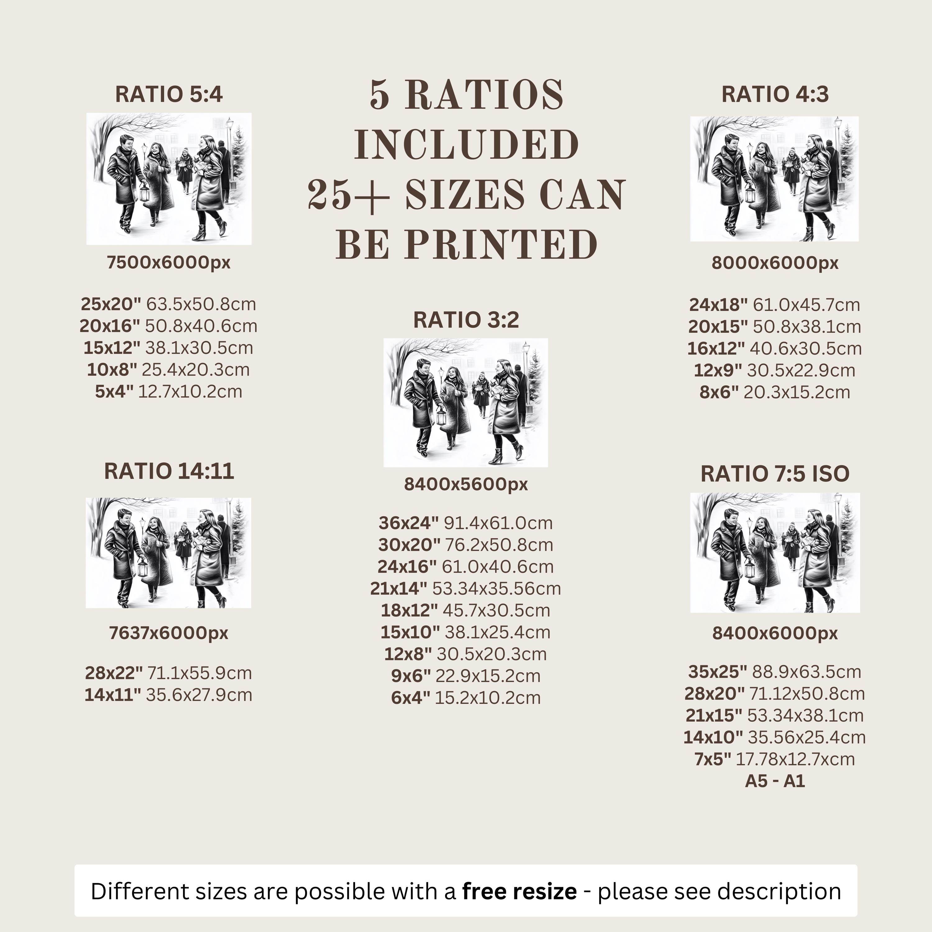 Each artwork includes 5 aspect ratios with 25+ print sizes. Most standard frames are covered. One custom resize per purchase available—message before ordering.