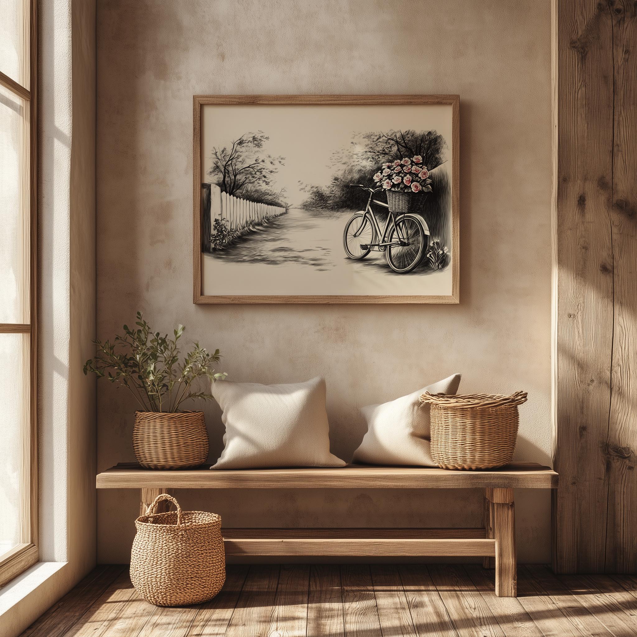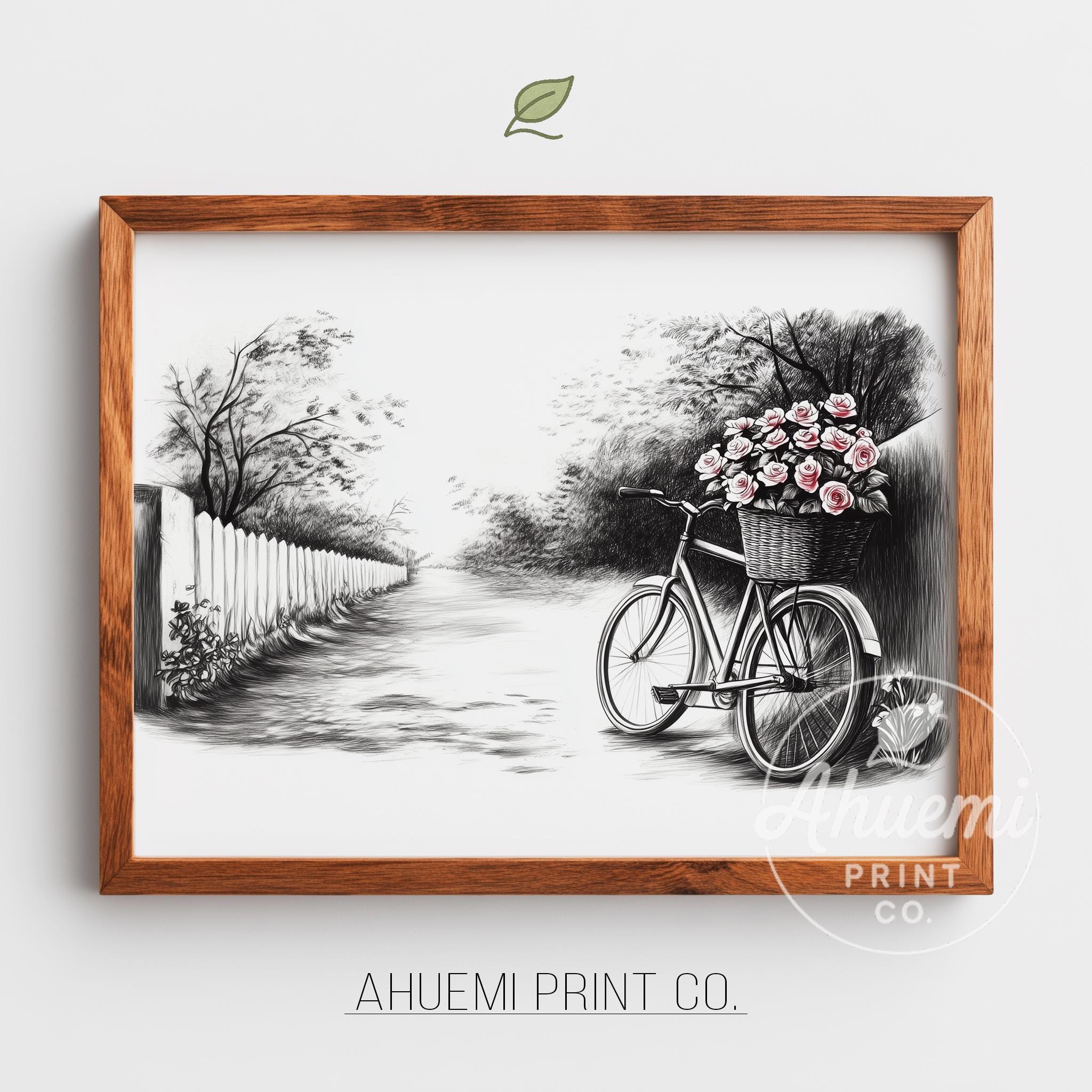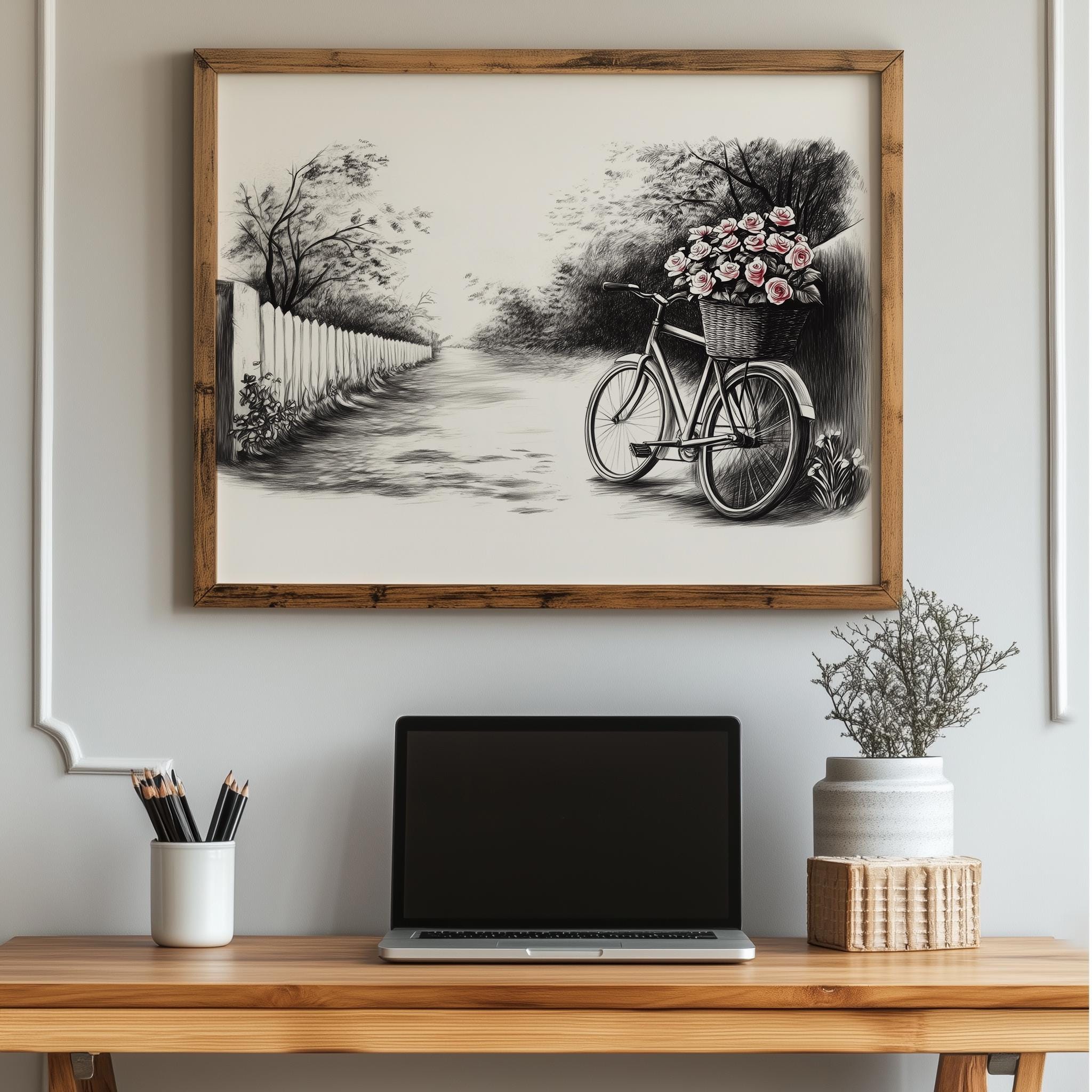 Immerse yourself in the charm with this rustic painting of a vintage bicycle adorned with a basket of pink roses. An instantly downloadable print, it's perfect for elevating your decor with budget-friendly charm. This gives you the flexibility to customize the size, frame, and material according to your personal taste and space, ensuring a perfect fit for your walls.
