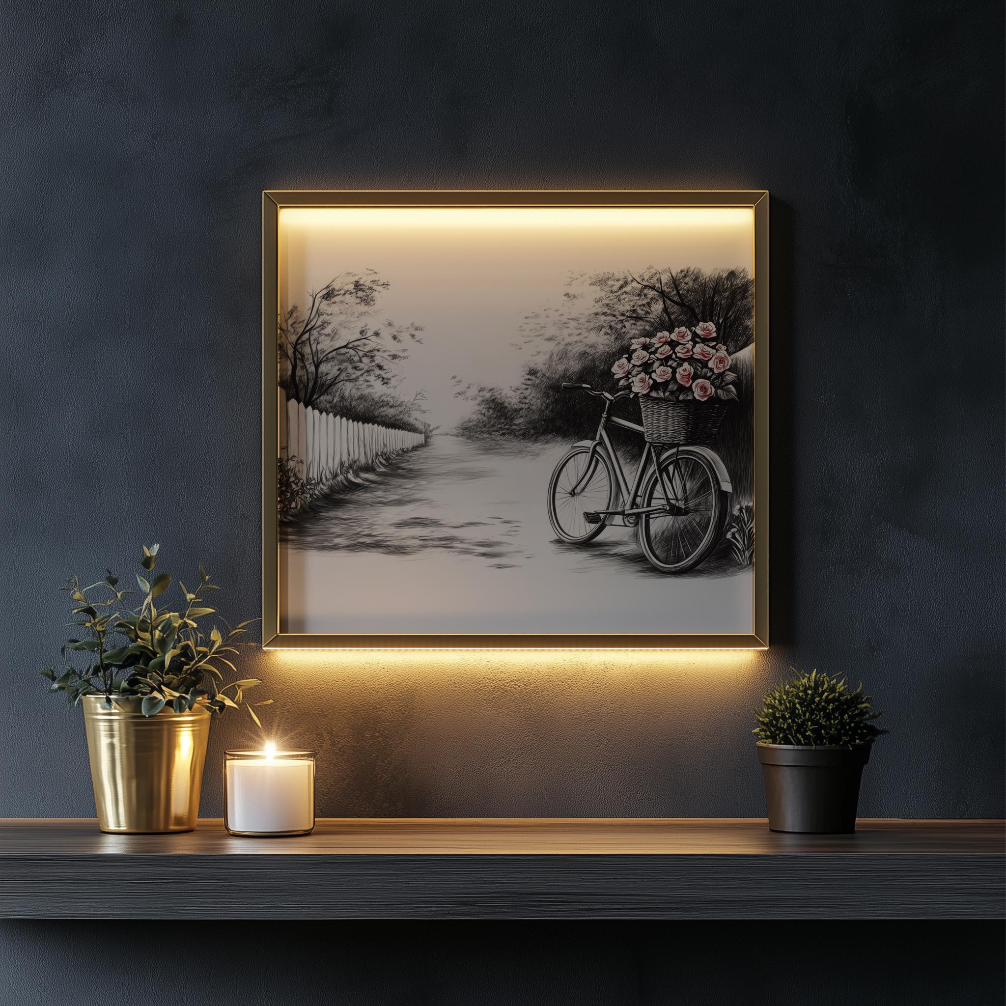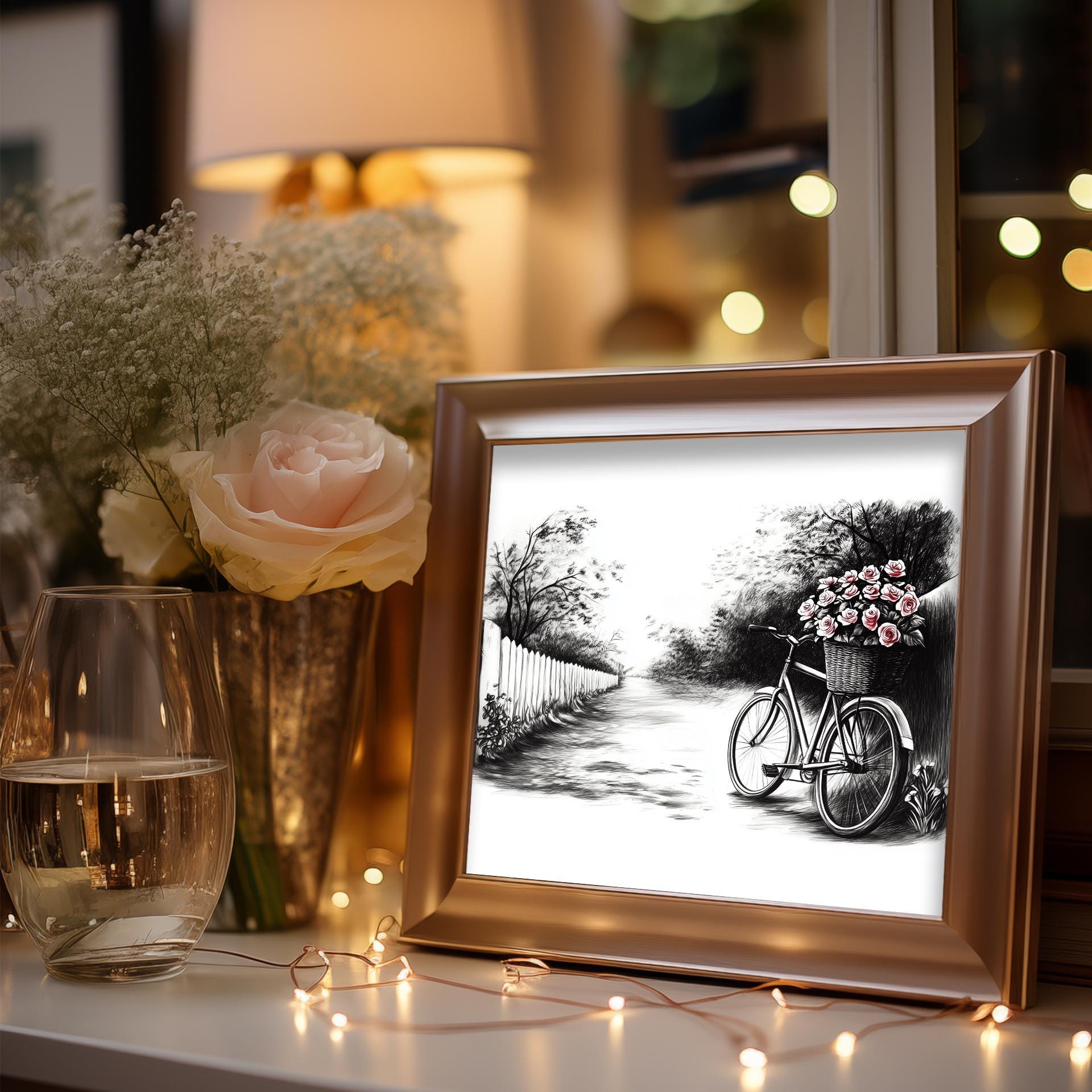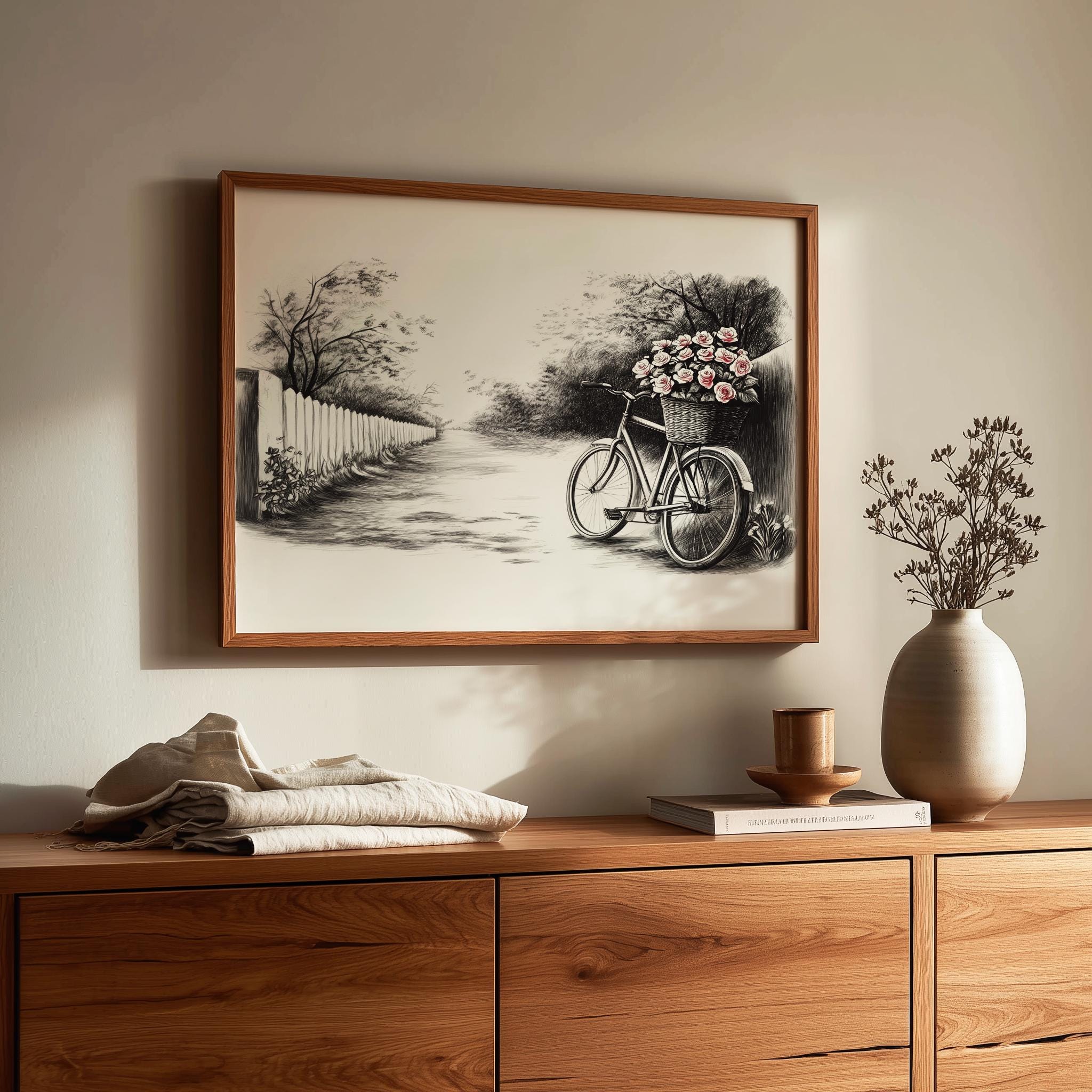 Immerse yourself in the charm with this rustic painting of a vintage bicycle adorned with a basket of pink roses. An instantly downloadable print, it's perfect for elevating your decor with budget-friendly charm. This gives you the flexibility to customize the size, frame, and material according to your personal taste and space, ensuring a perfect fit for your walls.