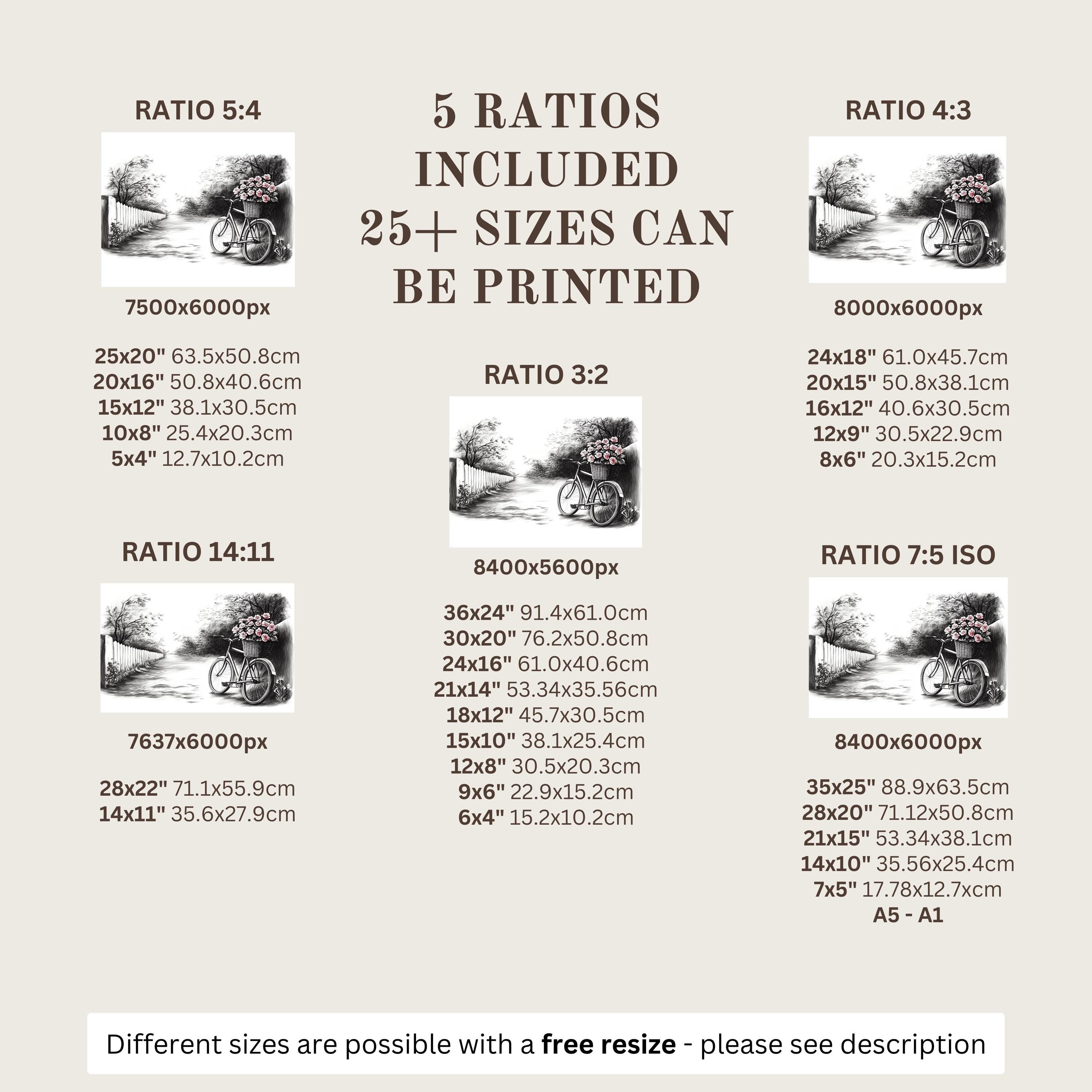 Each artwork includes 5 aspect ratios with 25+ print sizes. Most standard frames are covered. One custom resize per purchase available—message before ordering.