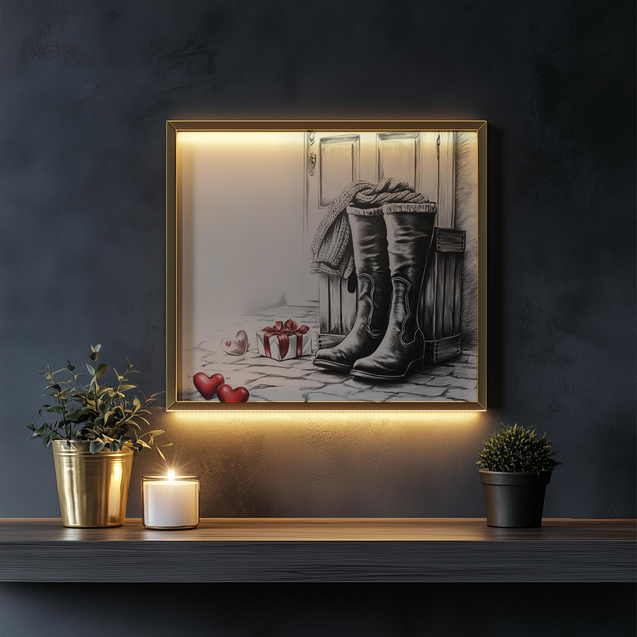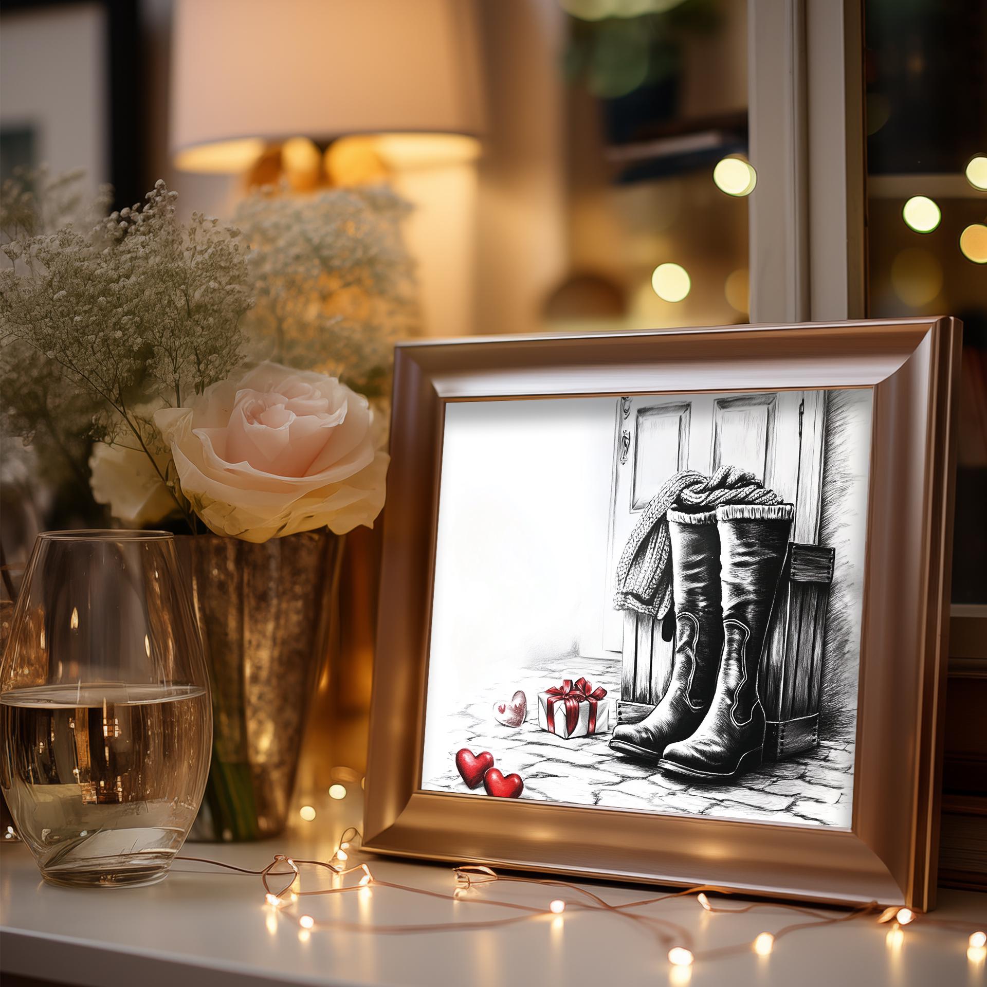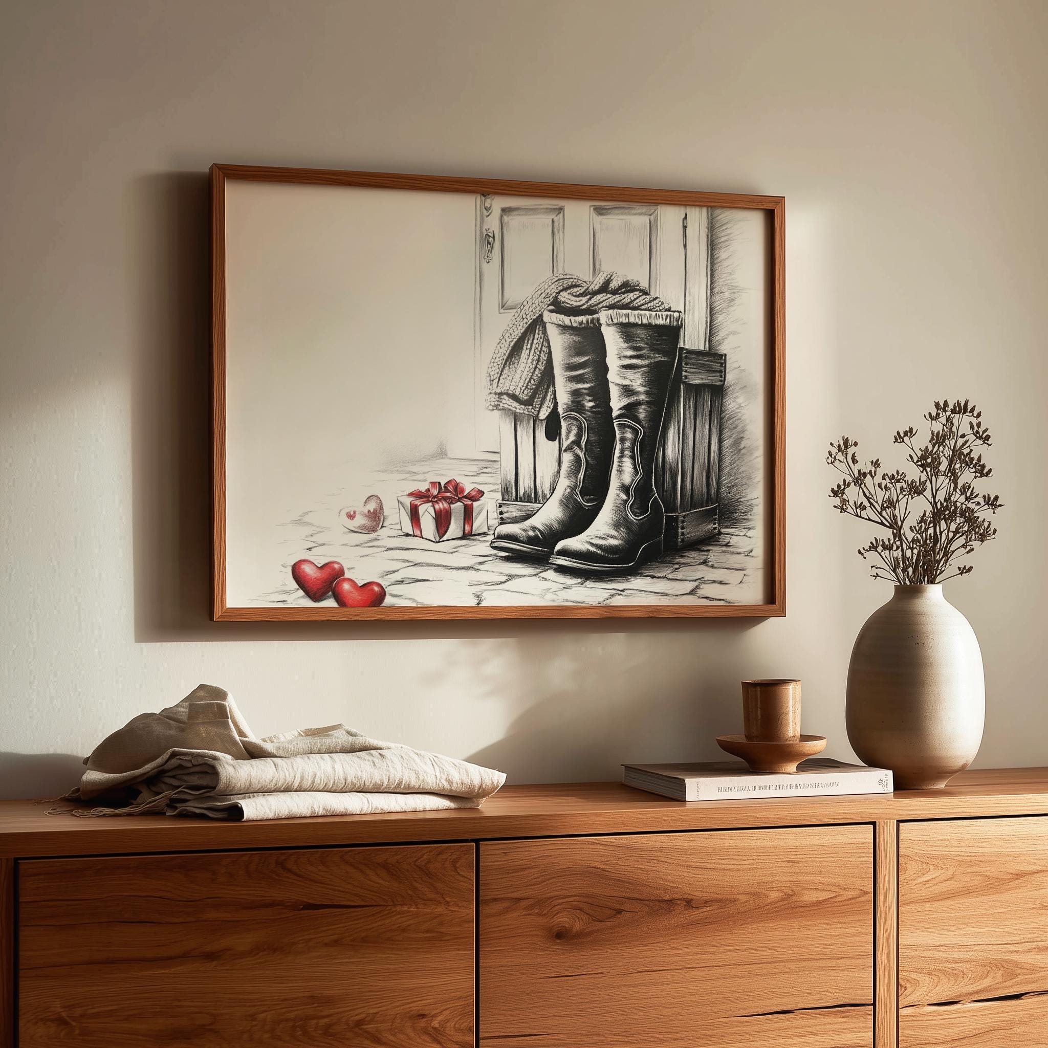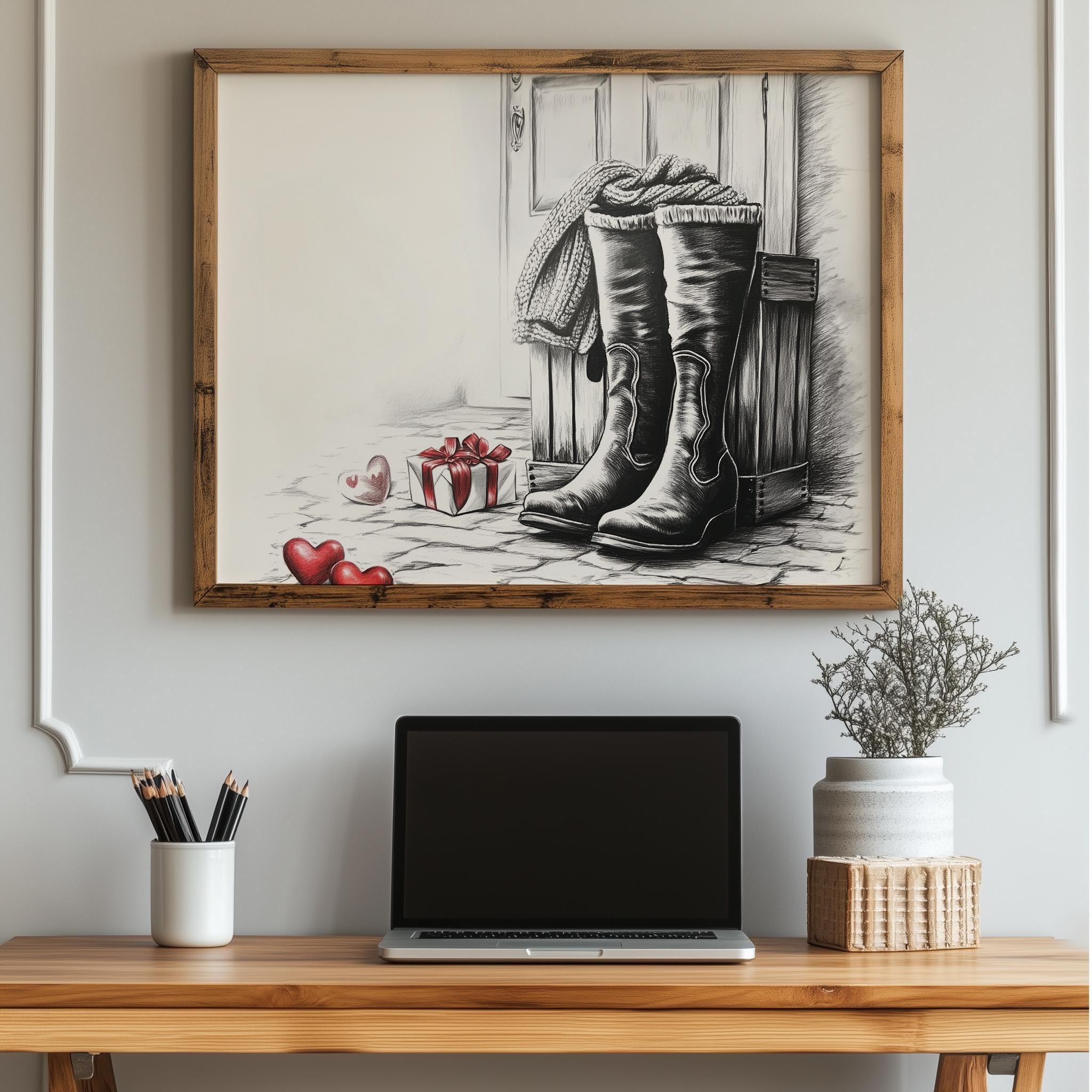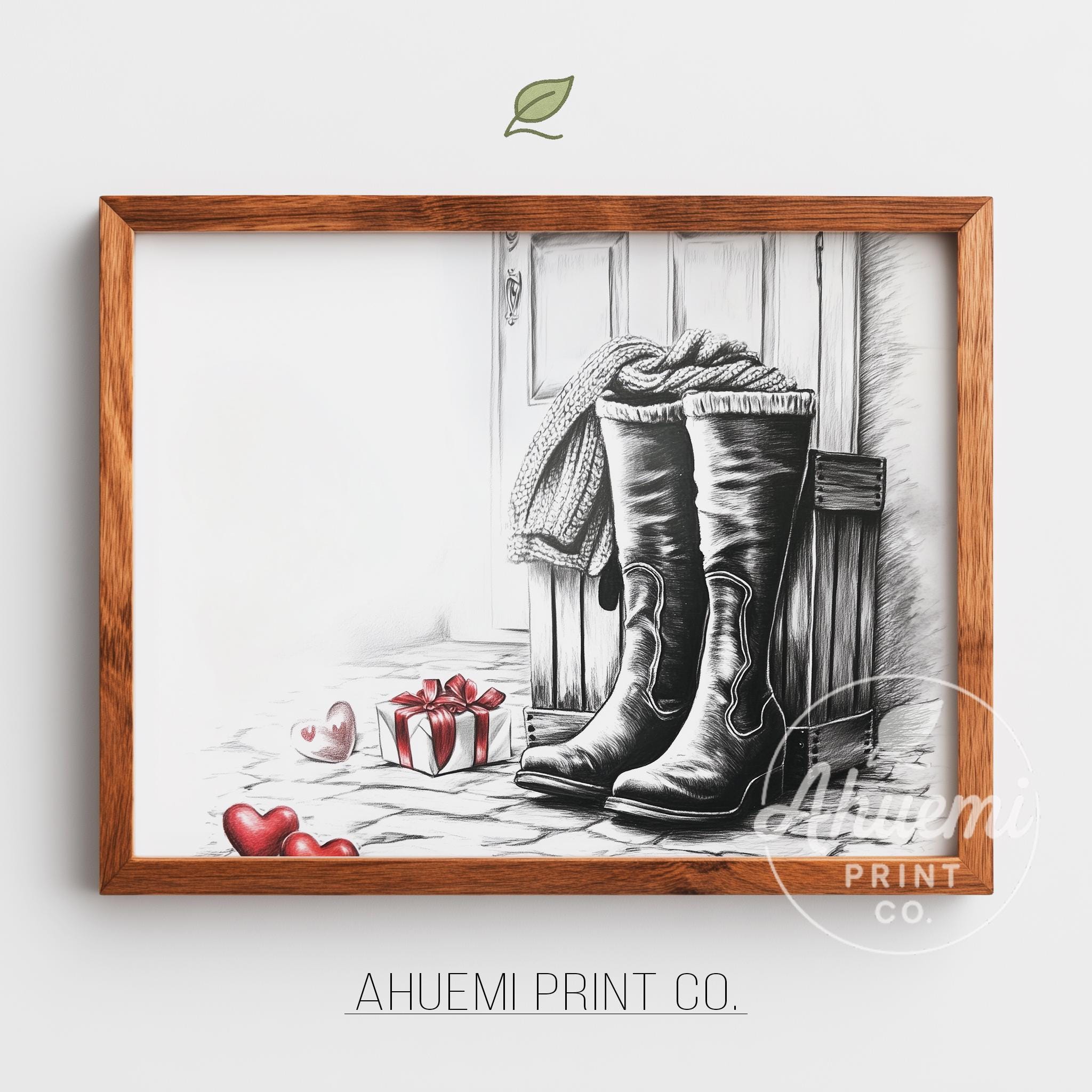 Immerse yourself in the charm with this rustic painting of stylish farmhouse boots paired with a cozy scarf and rustic crate. An instantly downloadable print, it's perfect for elevating your decor with budget-friendly charm. This gives you the flexibility to customize the size, frame, and material according to your personal taste and space, ensuring a perfect fit for your walls.