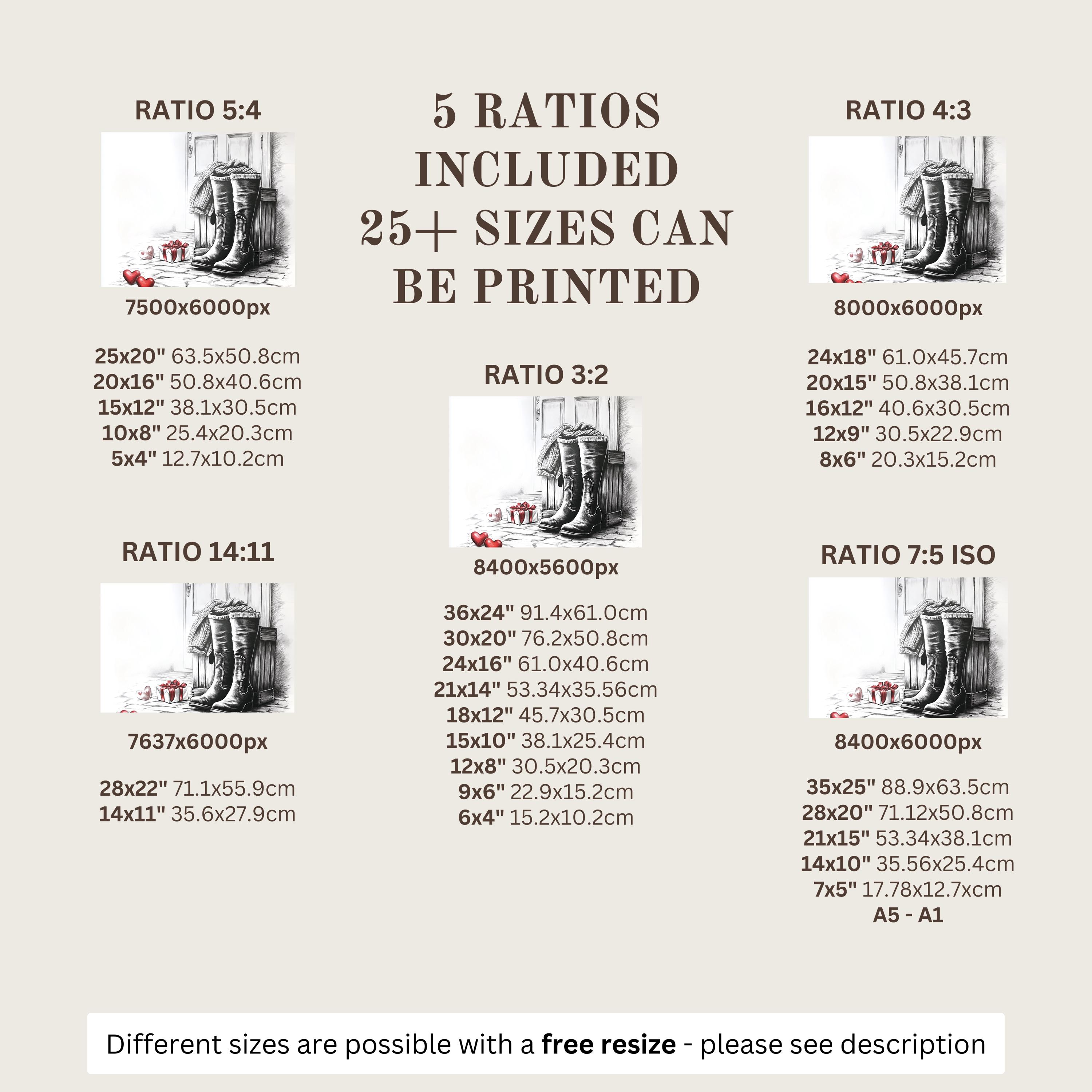 Each artwork includes 5 aspect ratios with 25+ print sizes. Most standard frames are covered. One custom resize per purchase available—message before ordering.