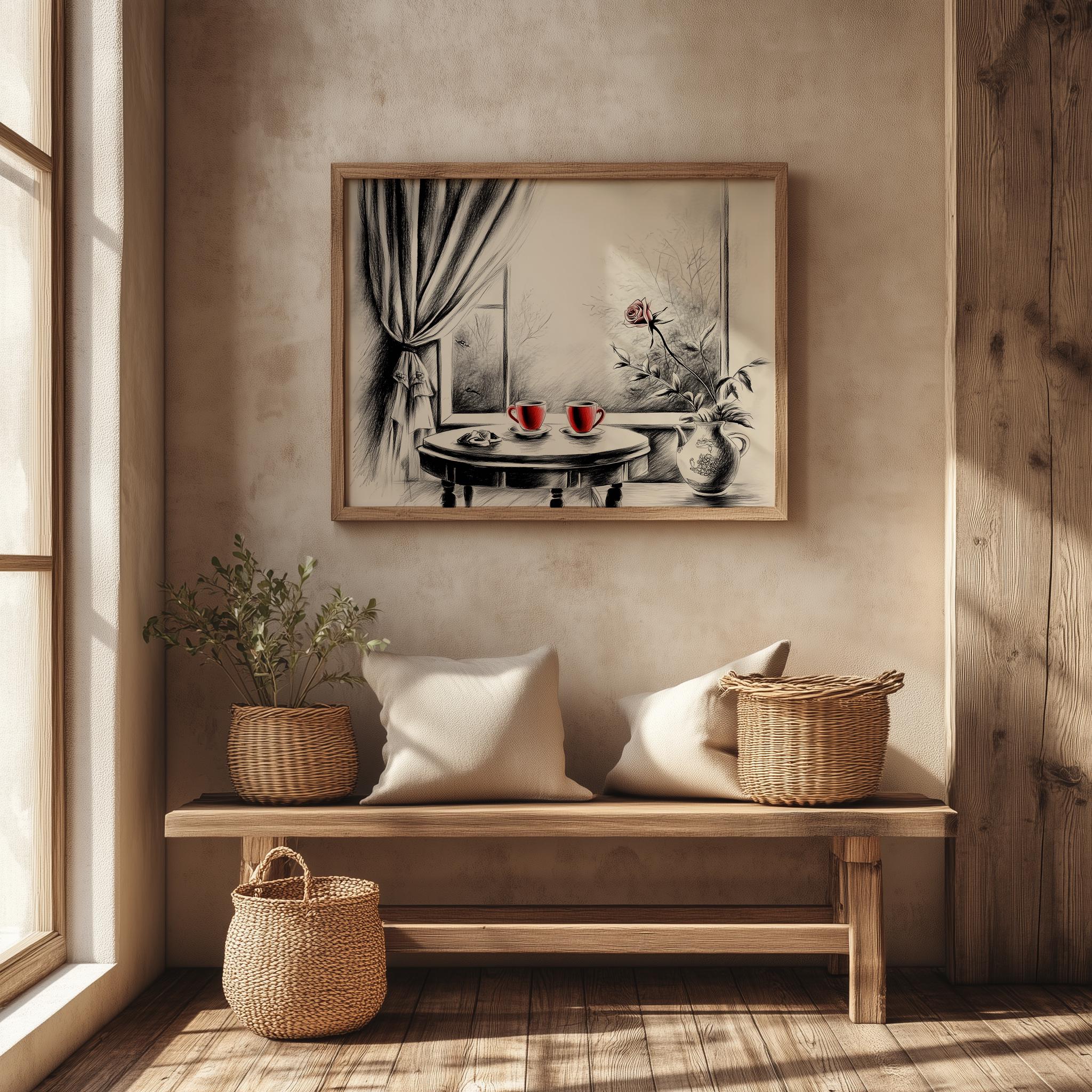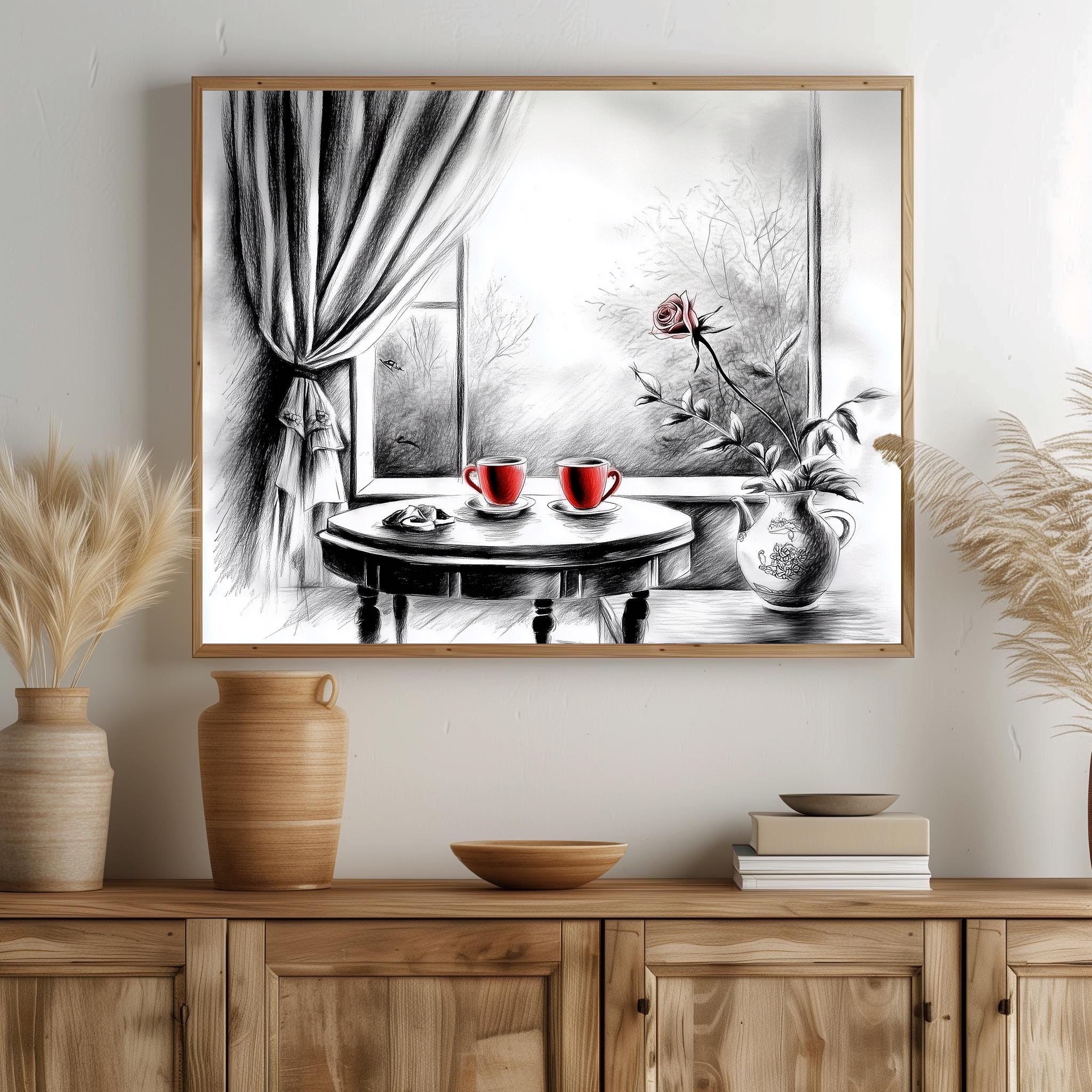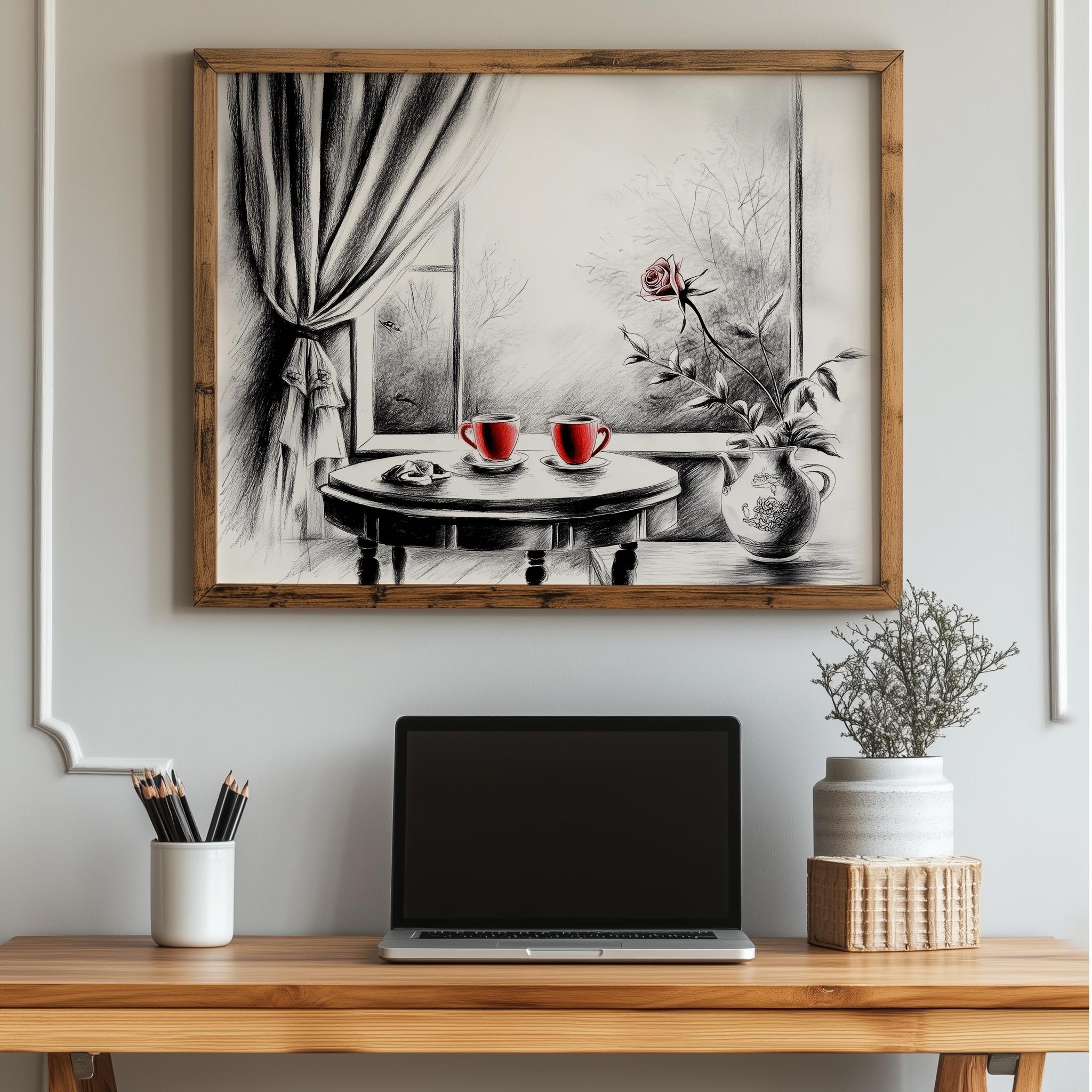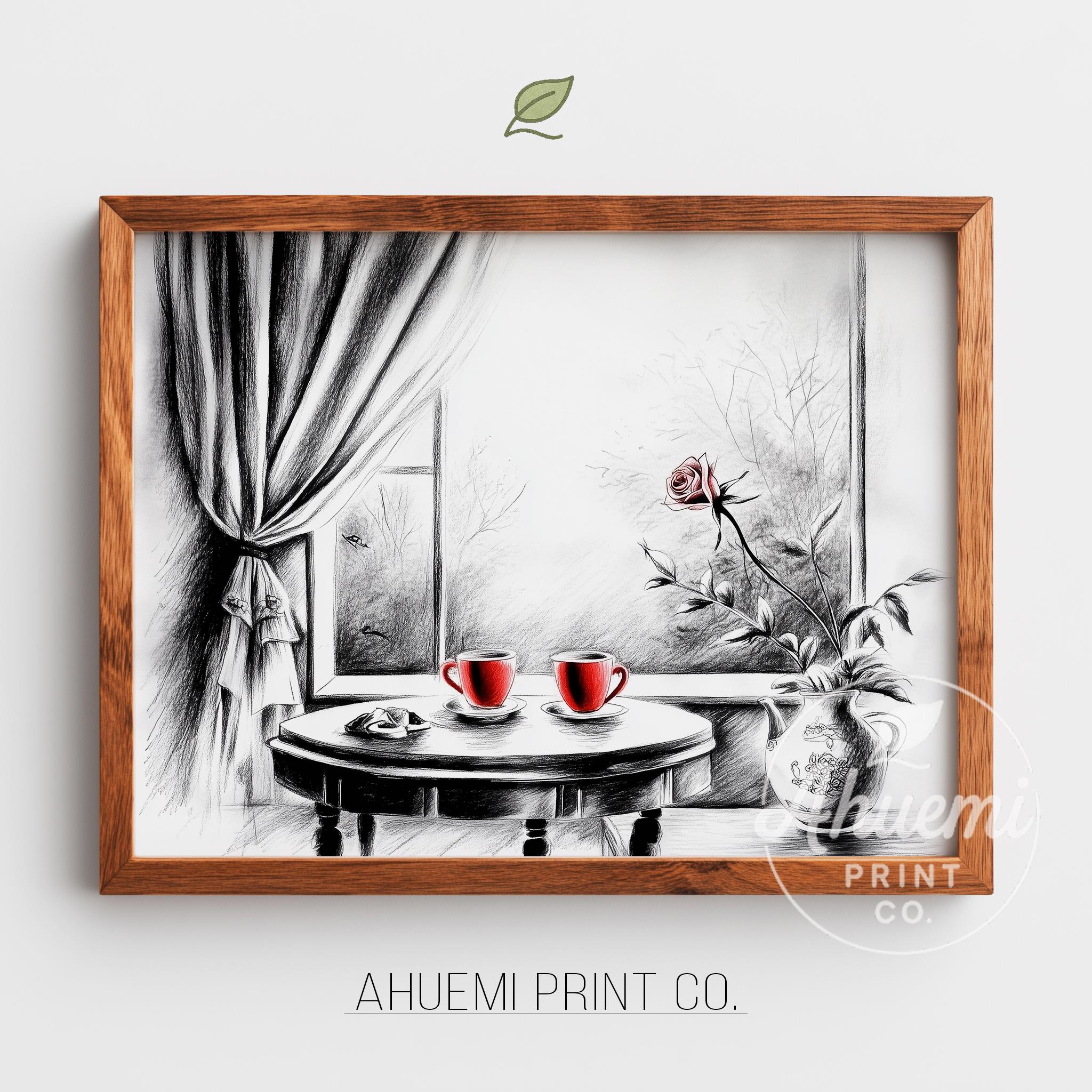 Immerse yourself in the charm with this rustic painting of a quaint café table set for two, adorned with steaming cups of tea and delicate pastries. An instantly downloadable print, it's perfect for elevating your decor with budget-friendly charm. This gives you the flexibility to customize the size, frame, and material according to your personal taste and space, ensuring a perfect fit for your walls.