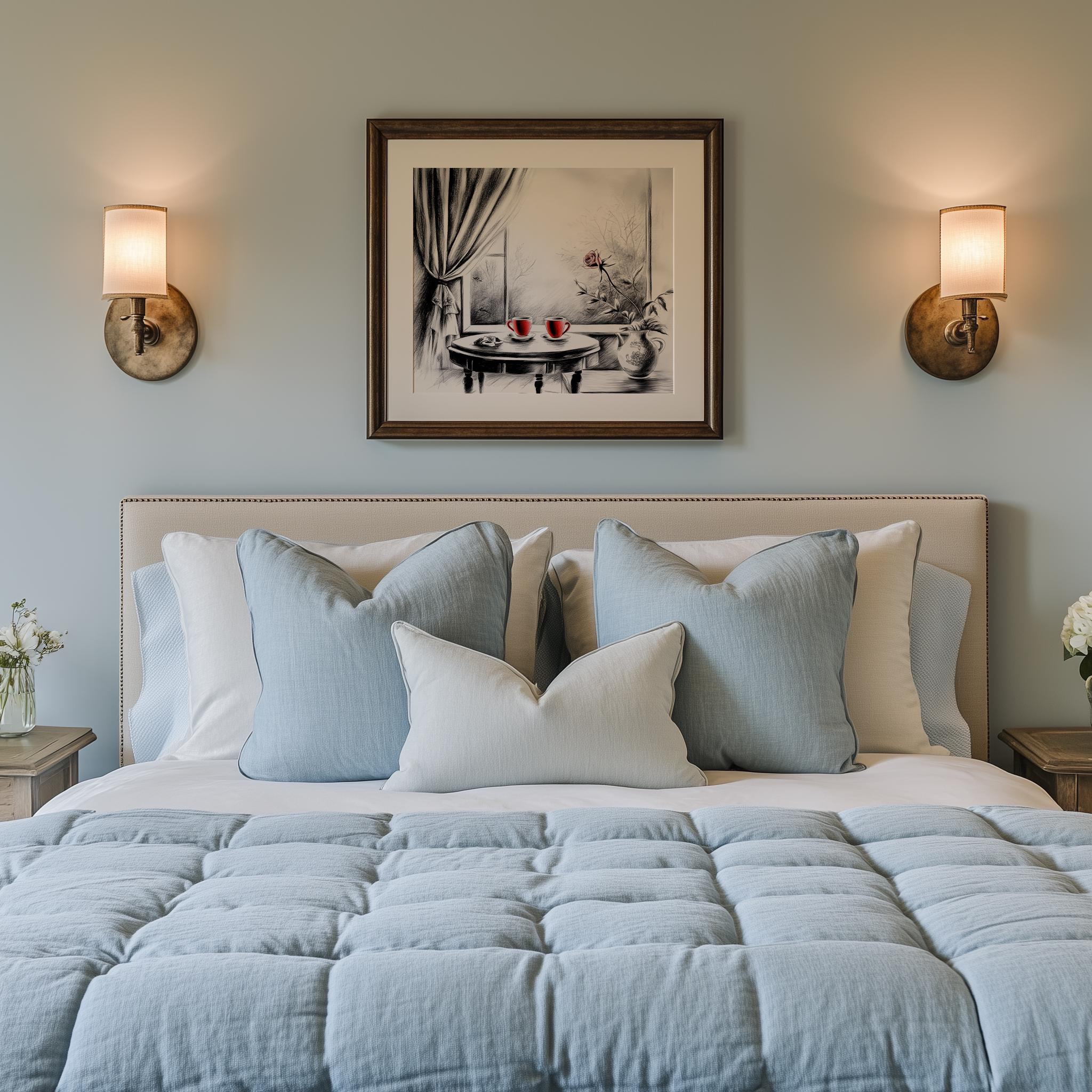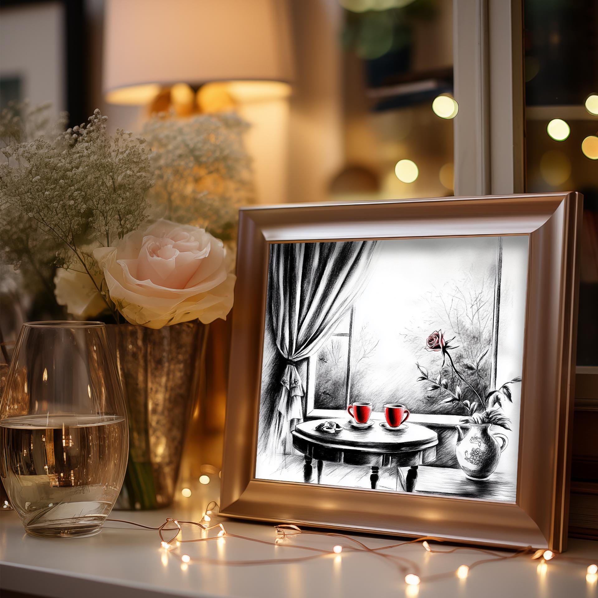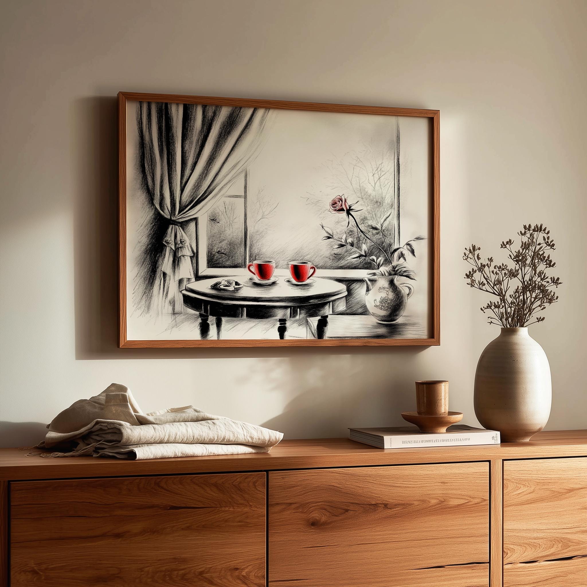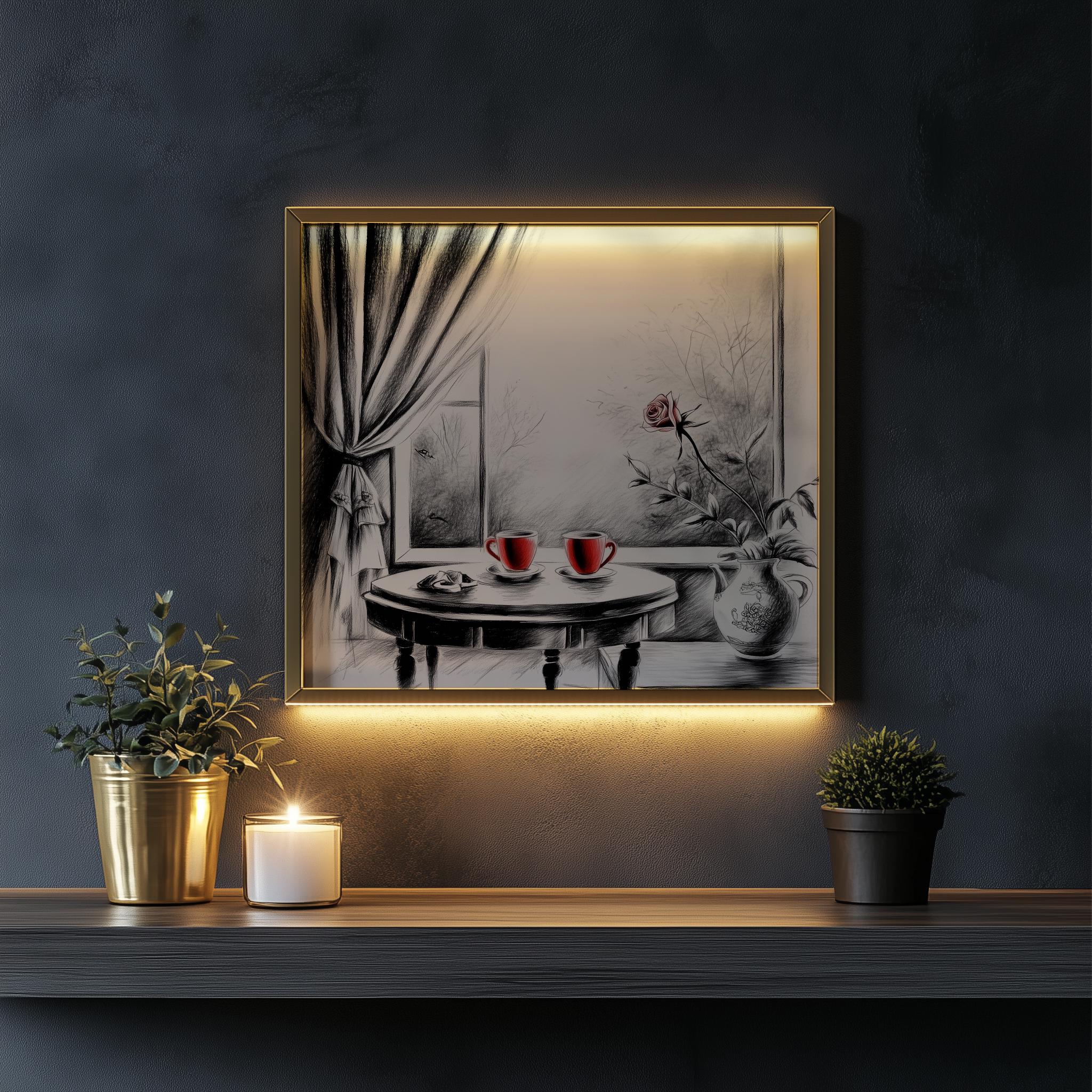Immerse yourself in the charm with this rustic painting of a quaint café table set for two, adorned with steaming cups of tea and delicate pastries. An instantly downloadable print, it's perfect for elevating your decor with budget-friendly charm. This gives you the flexibility to customize the size, frame, and material according to your personal taste and space, ensuring a perfect fit for your walls.