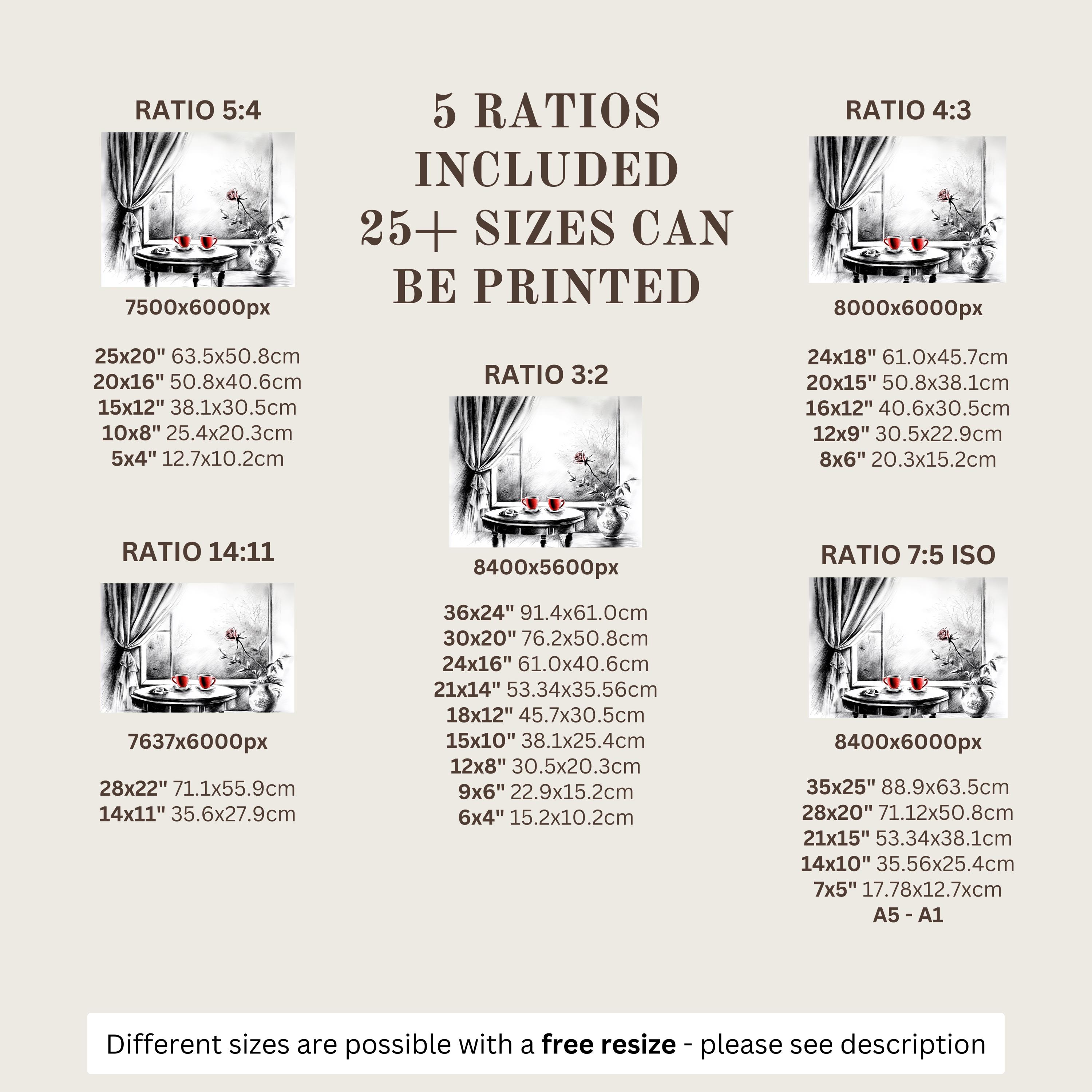 Each artwork includes 5 aspect ratios with 25+ print sizes. Most standard frames are covered. One custom resize per purchase available—message before ordering.