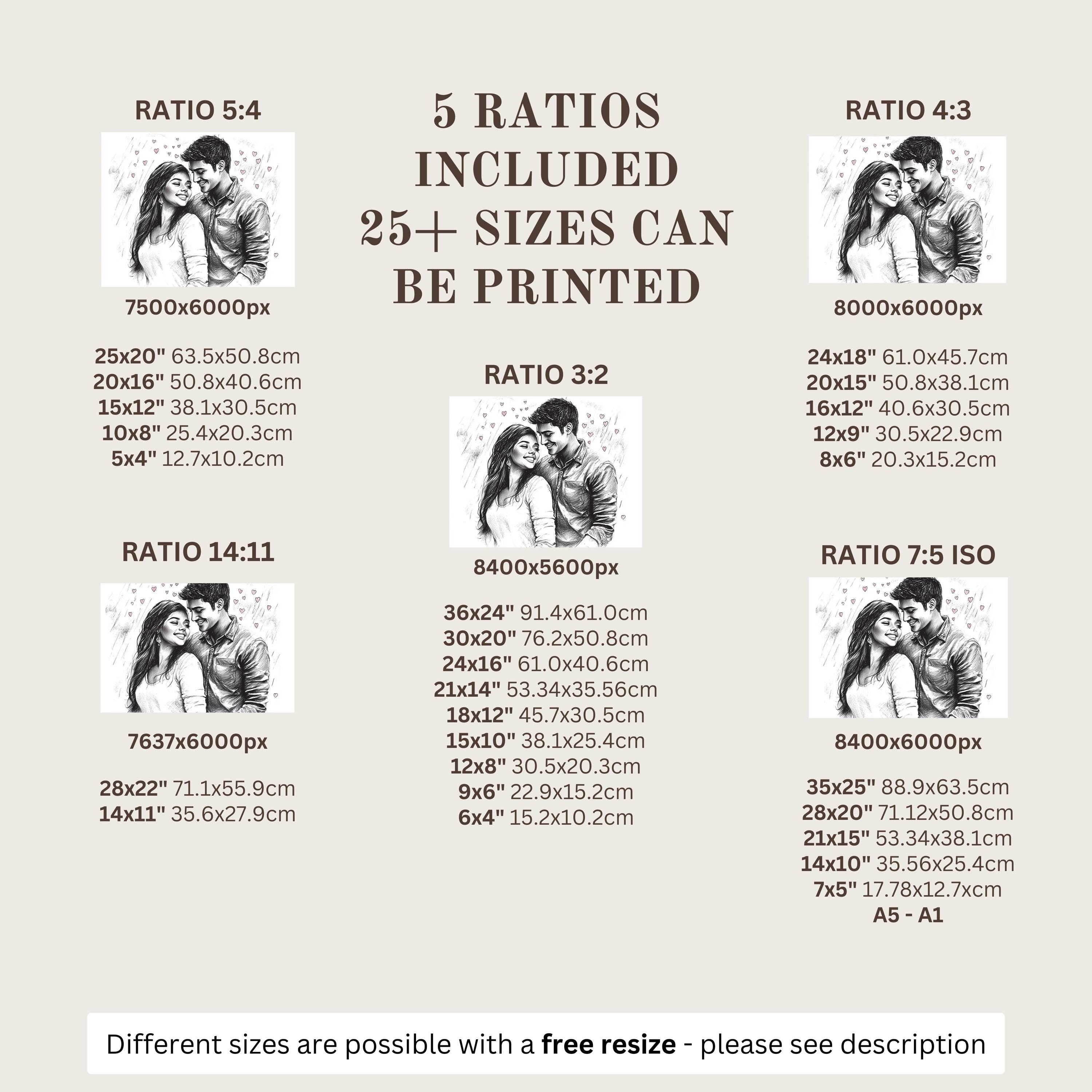 Each artwork includes 5 aspect ratios with 25+ print sizes. Most standard frames are covered. One custom resize per purchase available—message before ordering.