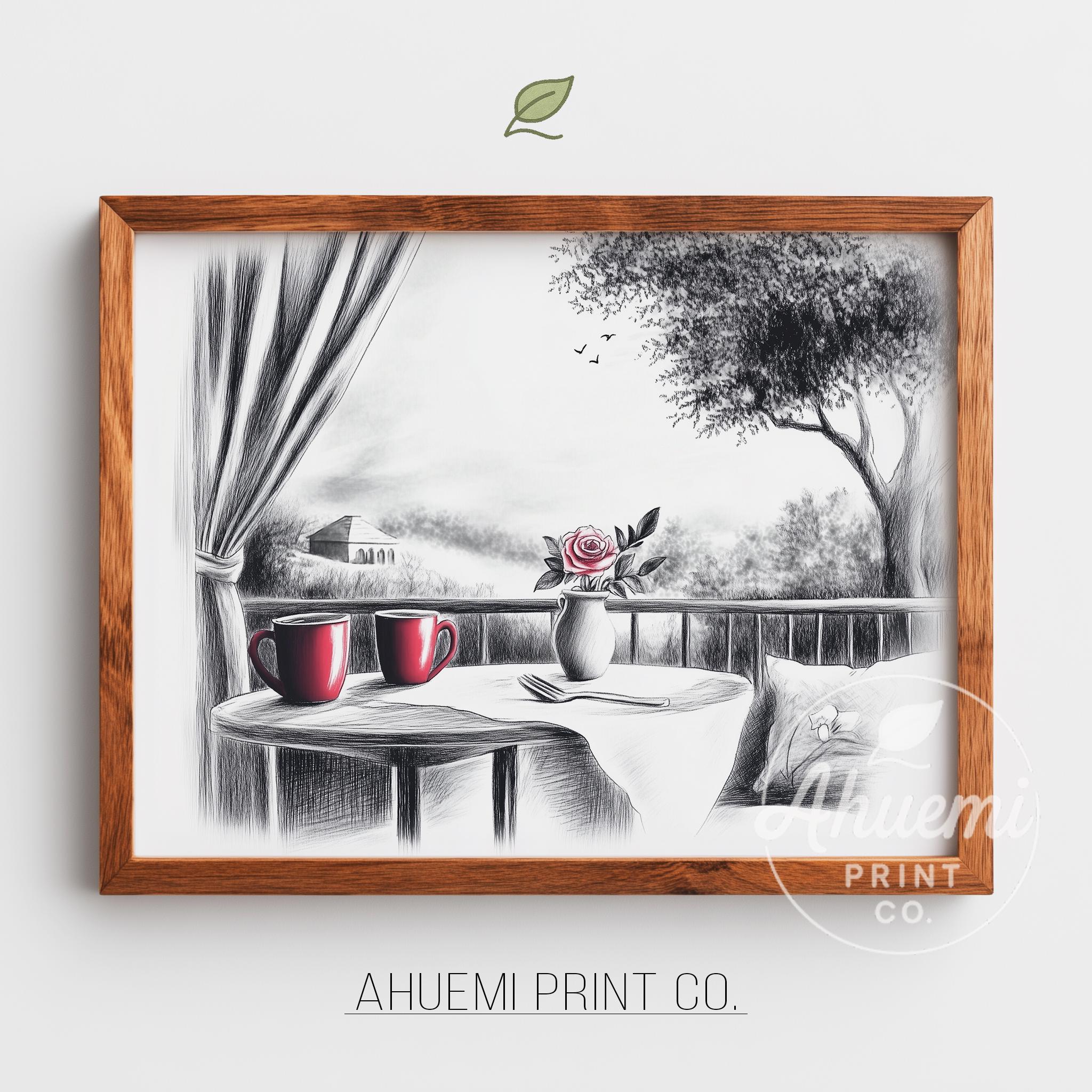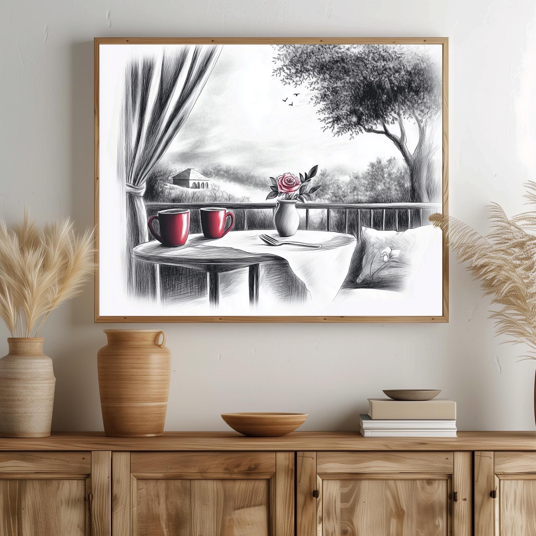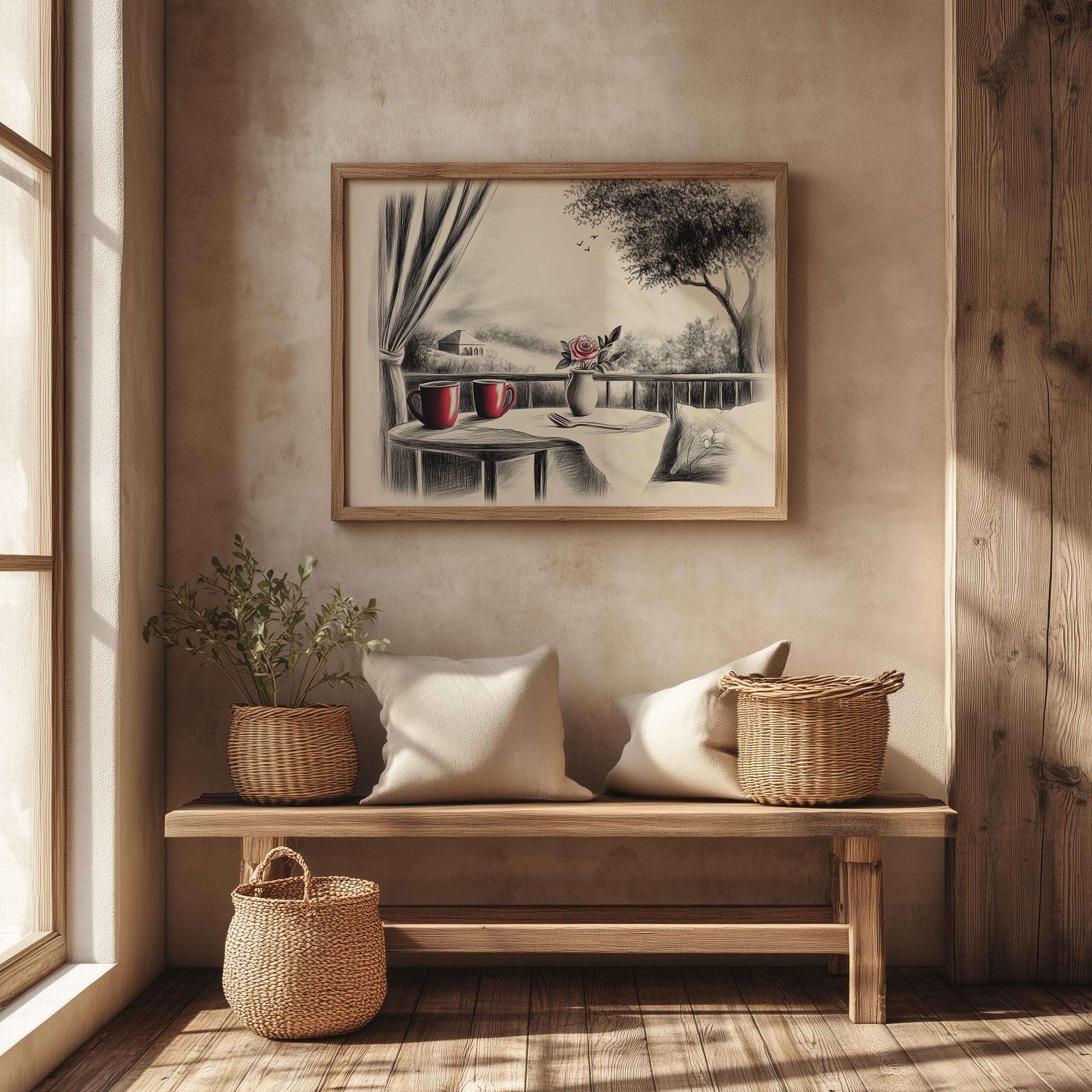 Immerse yourself in the charm with this rustic painting of a cozy cafe scene featuring a charming table for two adorned with vintage red mugs. An instantly downloadable print, it's perfect for elevating your decor with budget-friendly charm. This gives you the flexibility to customize the size, frame, and material according to your personal taste and space, ensuring a perfect fit for your walls.