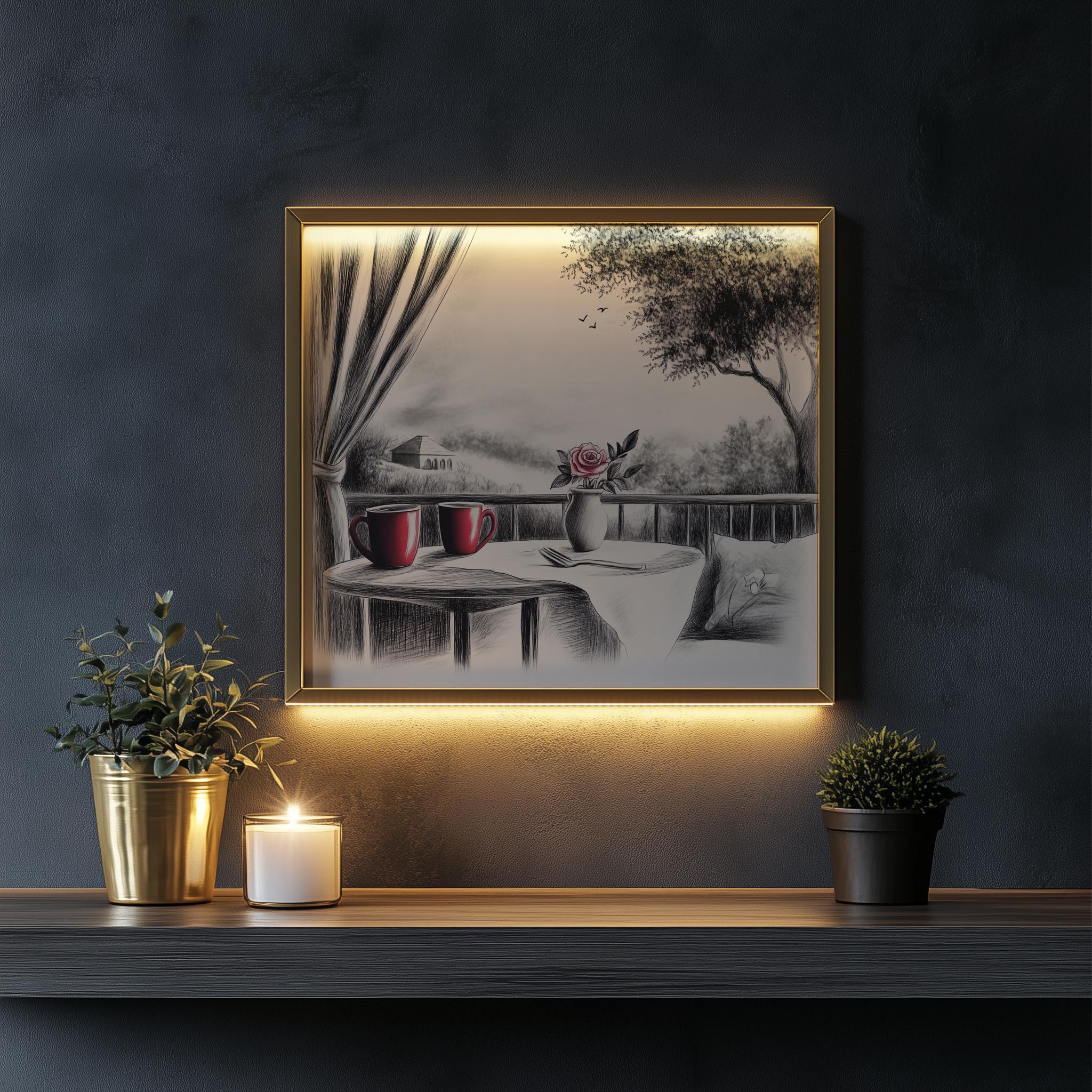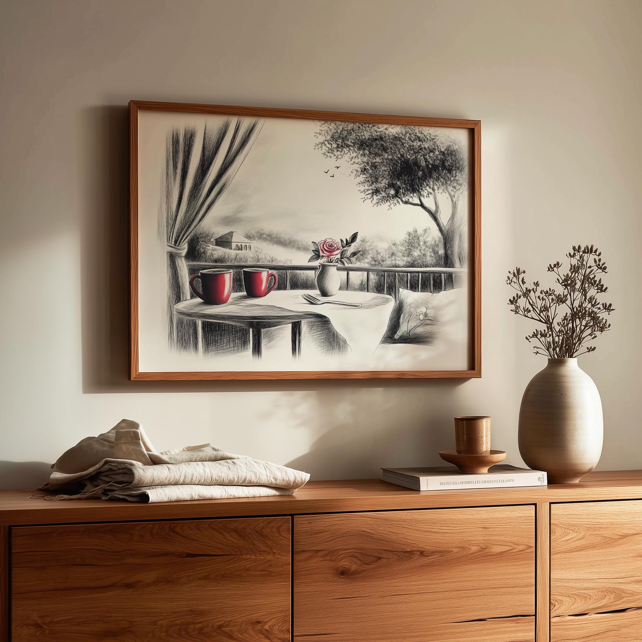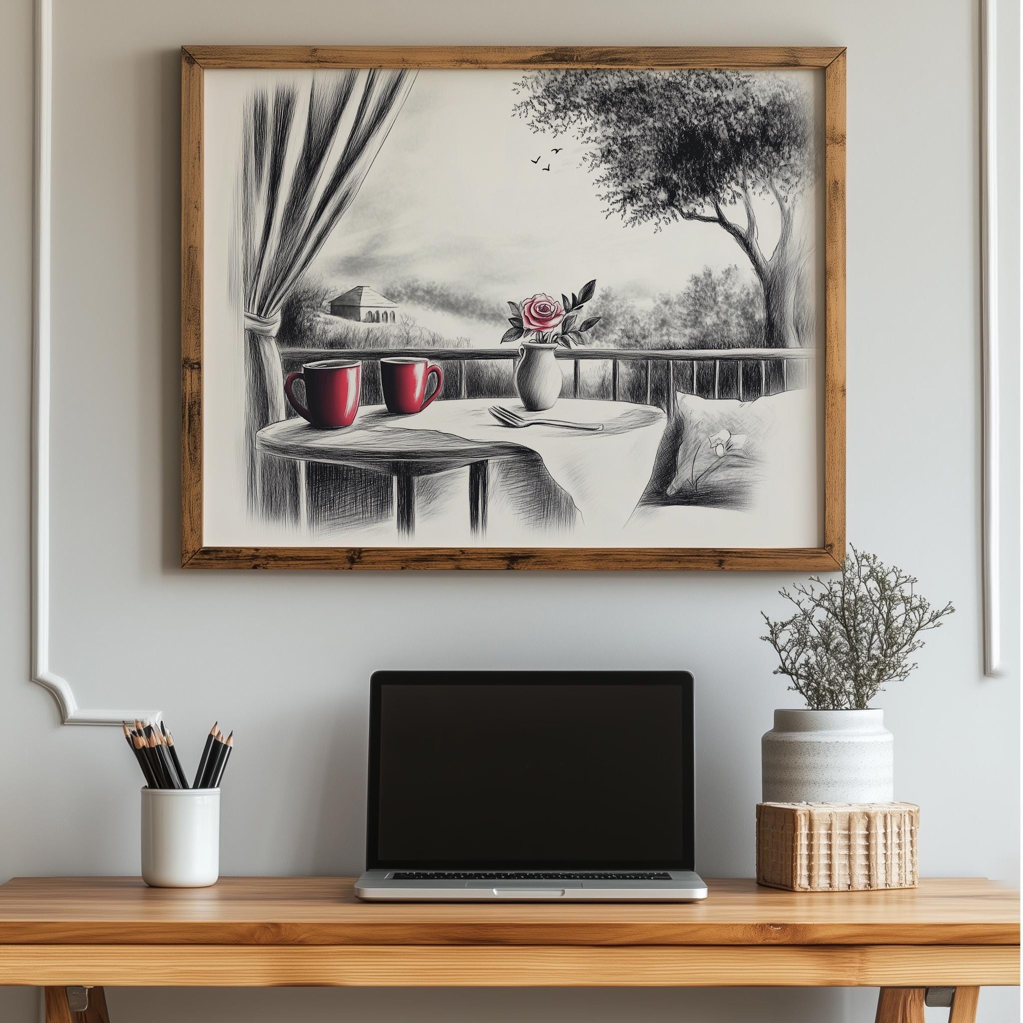 Immerse yourself in the charm with this rustic painting of a cozy cafe scene featuring a charming table for two adorned with vintage red mugs. An instantly downloadable print, it's perfect for elevating your decor with budget-friendly charm. This gives you the flexibility to customize the size, frame, and material according to your personal taste and space, ensuring a perfect fit for your walls.