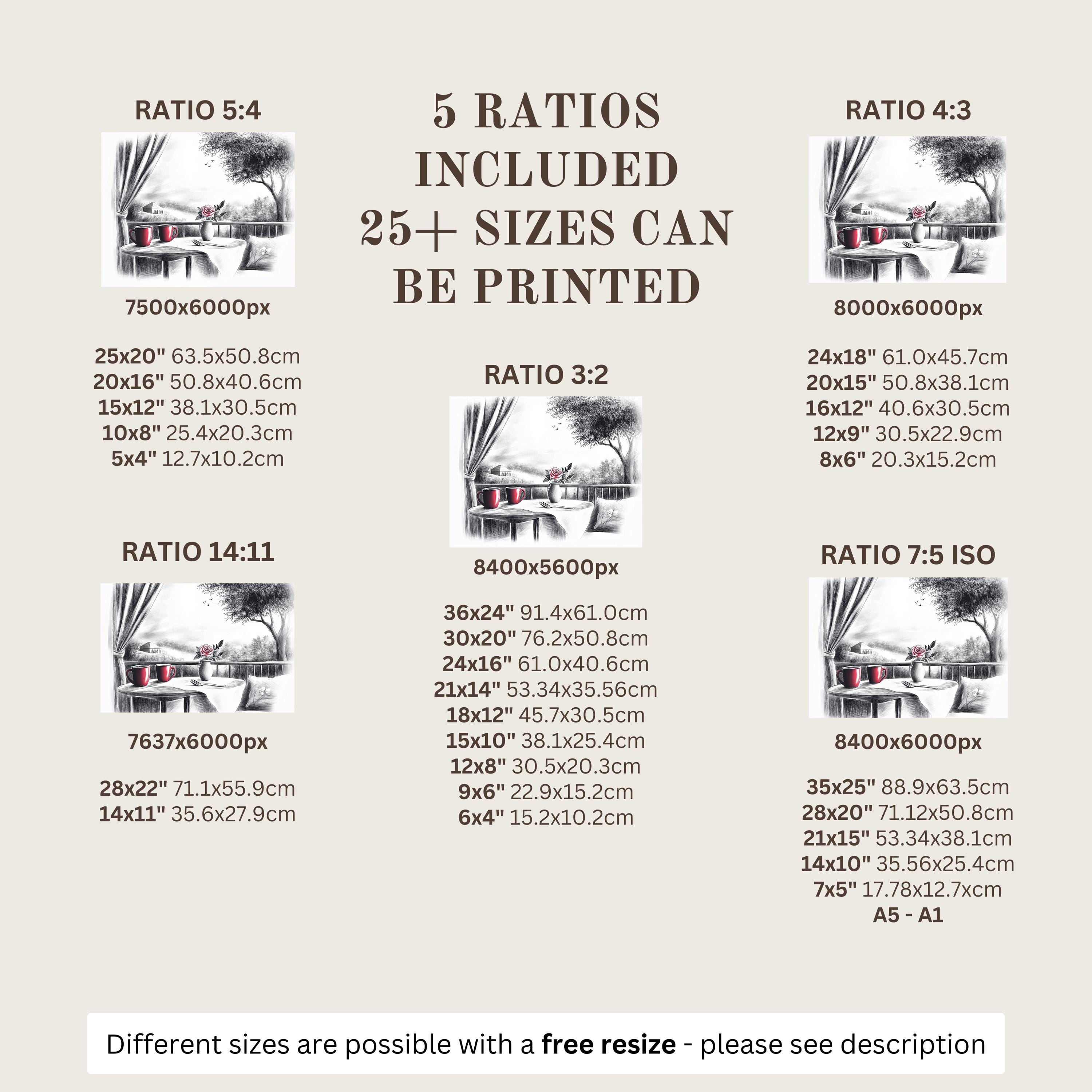 Each artwork includes 5 aspect ratios with 25+ print sizes. Most standard frames are covered. One custom resize per purchase available—message before ordering.