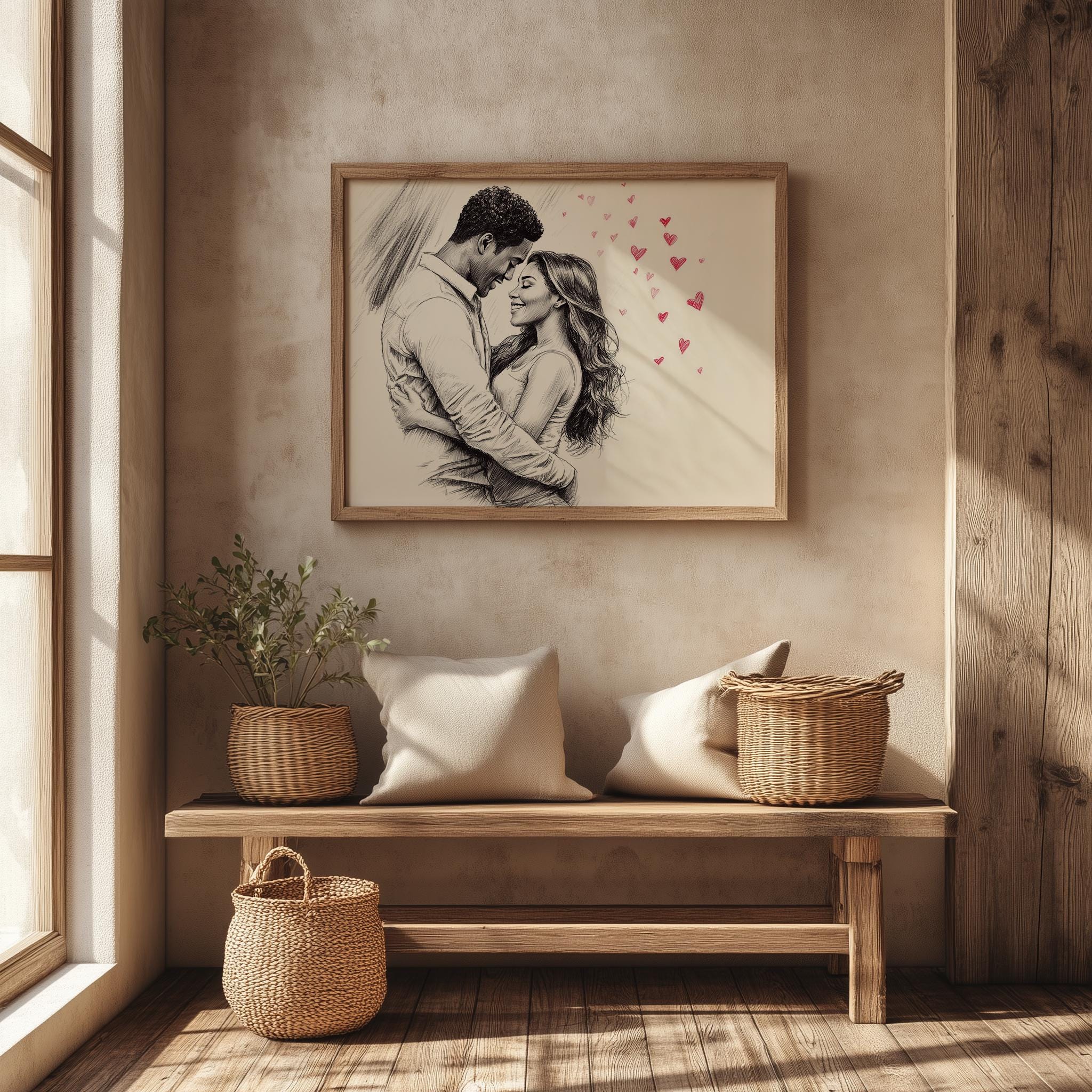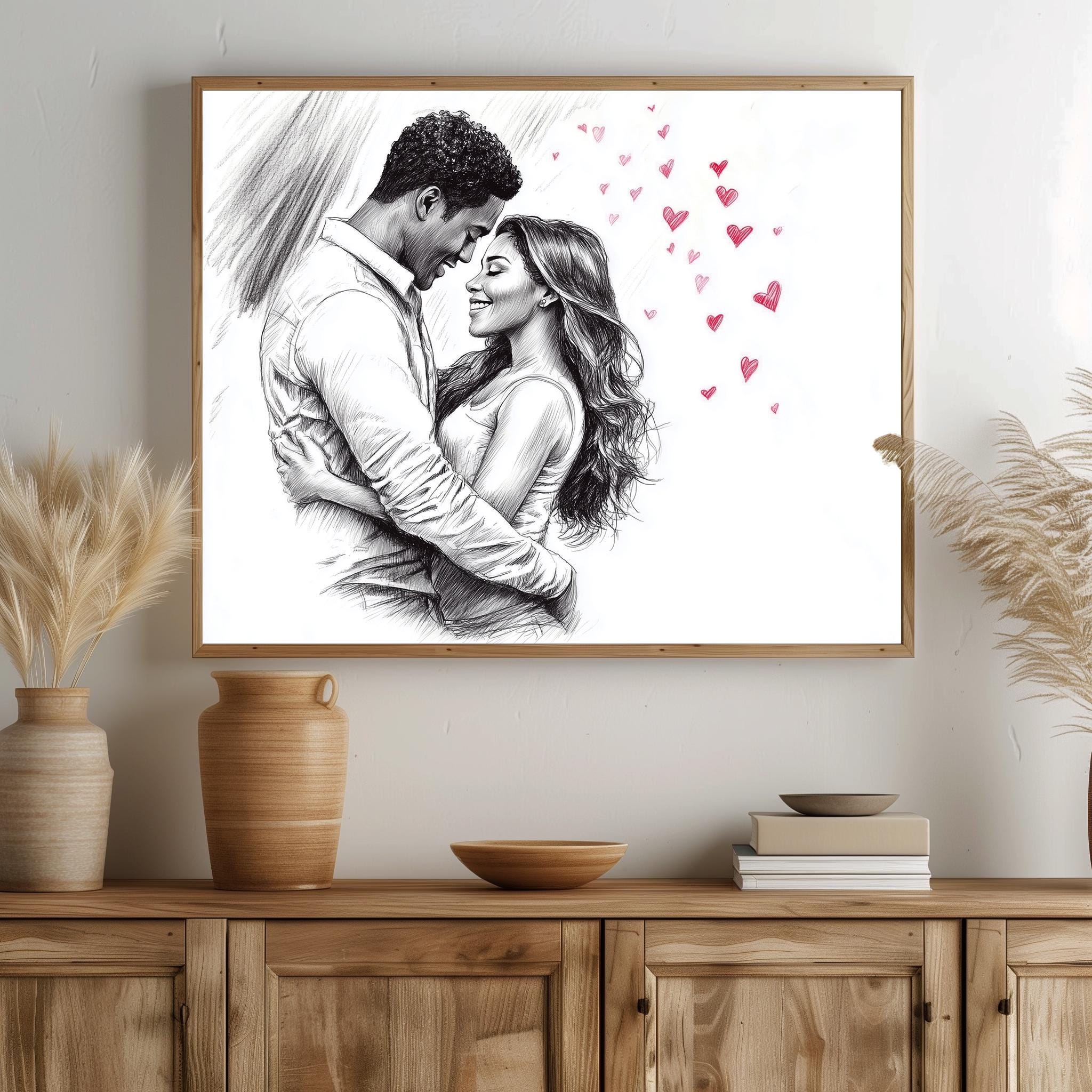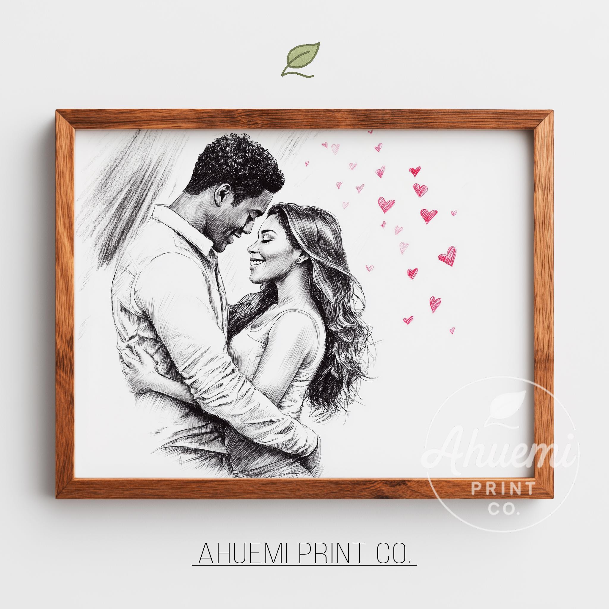 Immerse yourself in the charm with this rustic painting of a loving black couple sharing a tender embrace, captured in a minimalist style. An instantly downloadable print, it's perfect for elevating your decor with budget-friendly charm. This gives you the flexibility to customize the size, frame, and material according to your personal taste and space, ensuring a perfect fit for your walls.