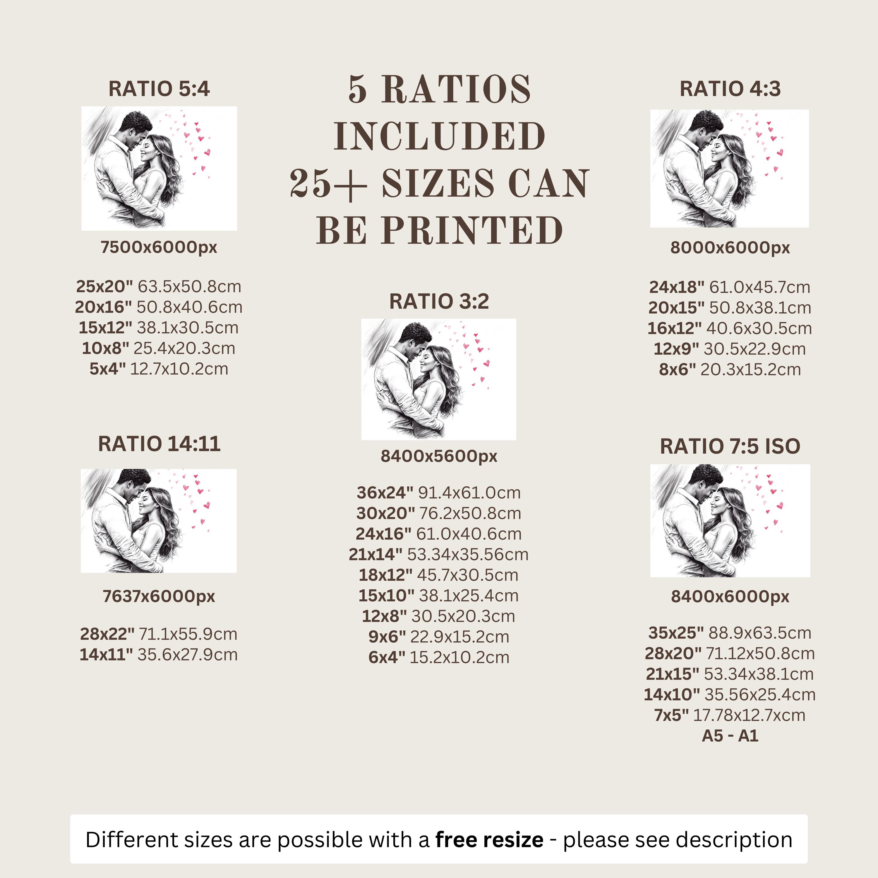 Each artwork includes 5 aspect ratios with 25+ print sizes. Most standard frames are covered. One custom resize per purchase available—message before ordering.