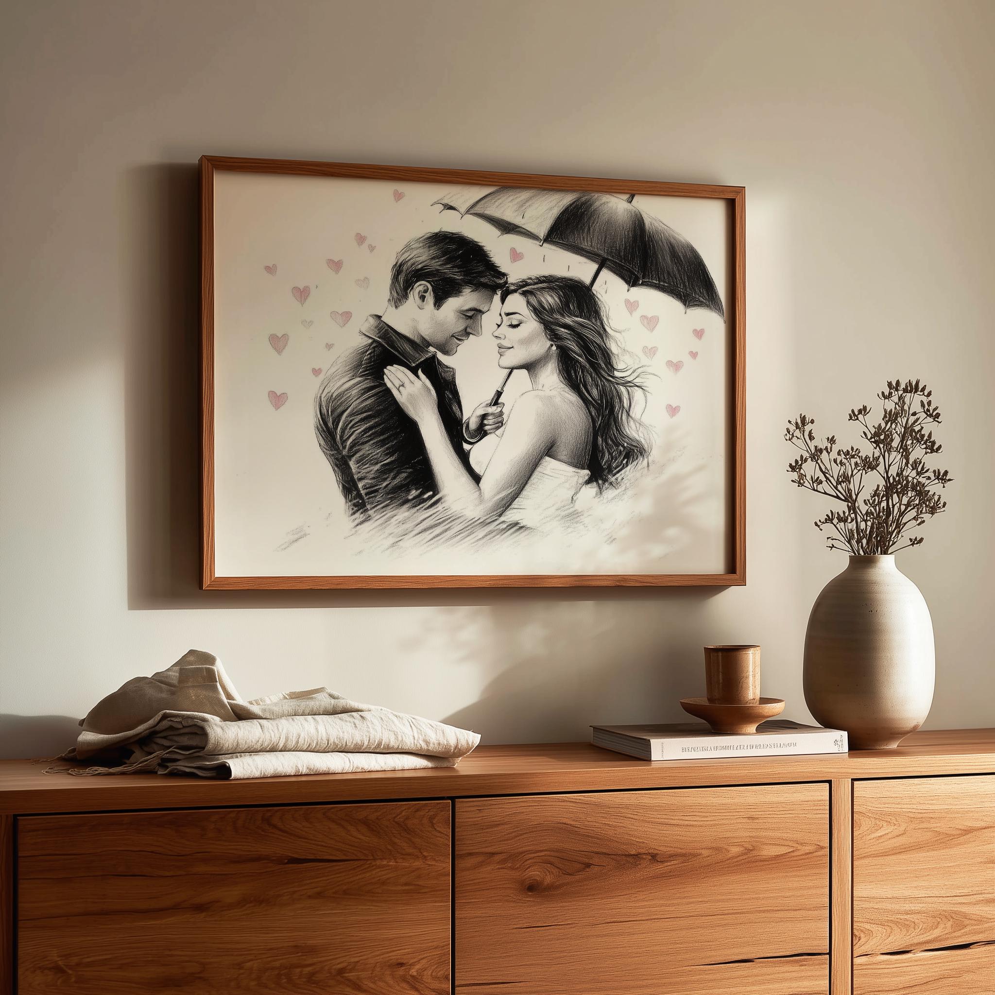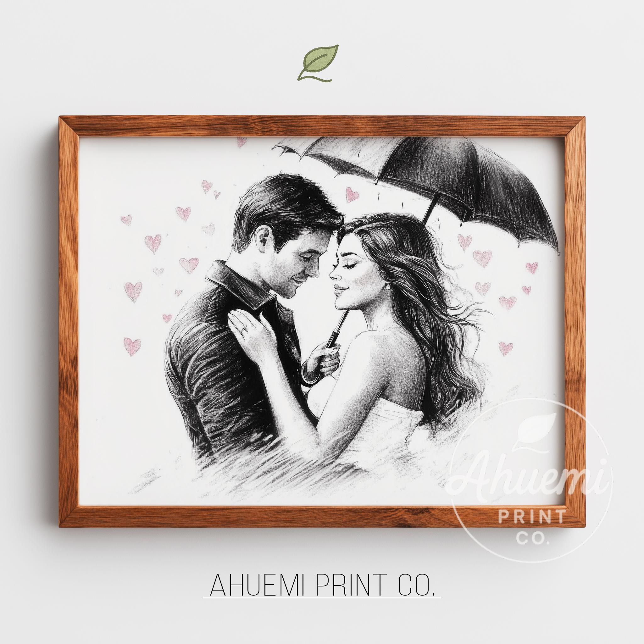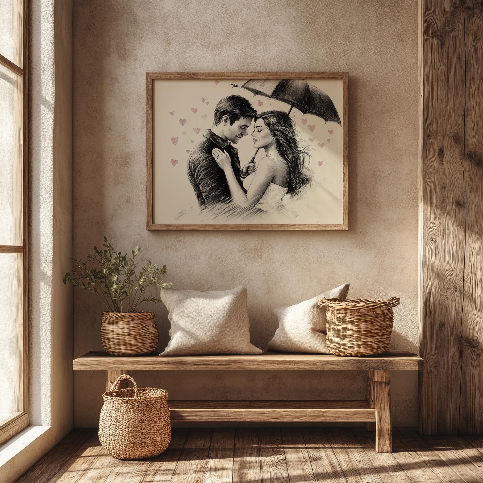 Immerse yourself in the charm with this rustic painting of a loving couple sharing an umbrella. An instantly downloadable print, it's perfect for elevating your decor with budget-friendly charm. This gives you the flexibility to customize the size, frame, and material according to your personal taste and space, ensuring a perfect fit for your walls.