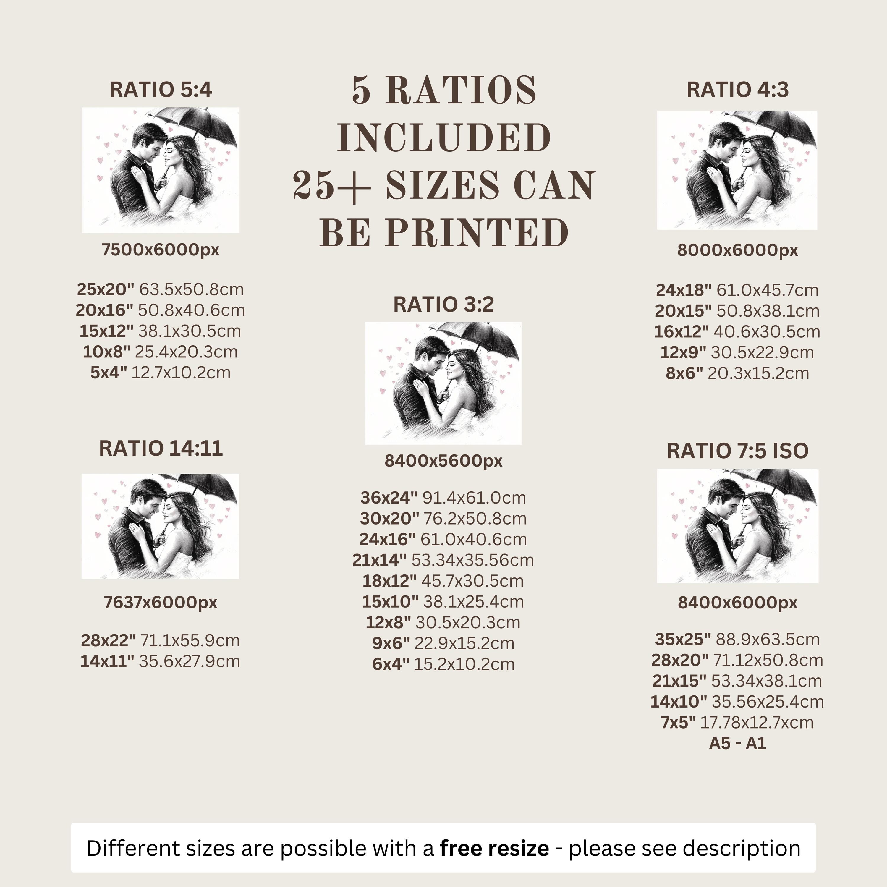 Each artwork includes 5 aspect ratios with 25+ print sizes. Most standard frames are covered. One custom resize per purchase available—message before ordering.