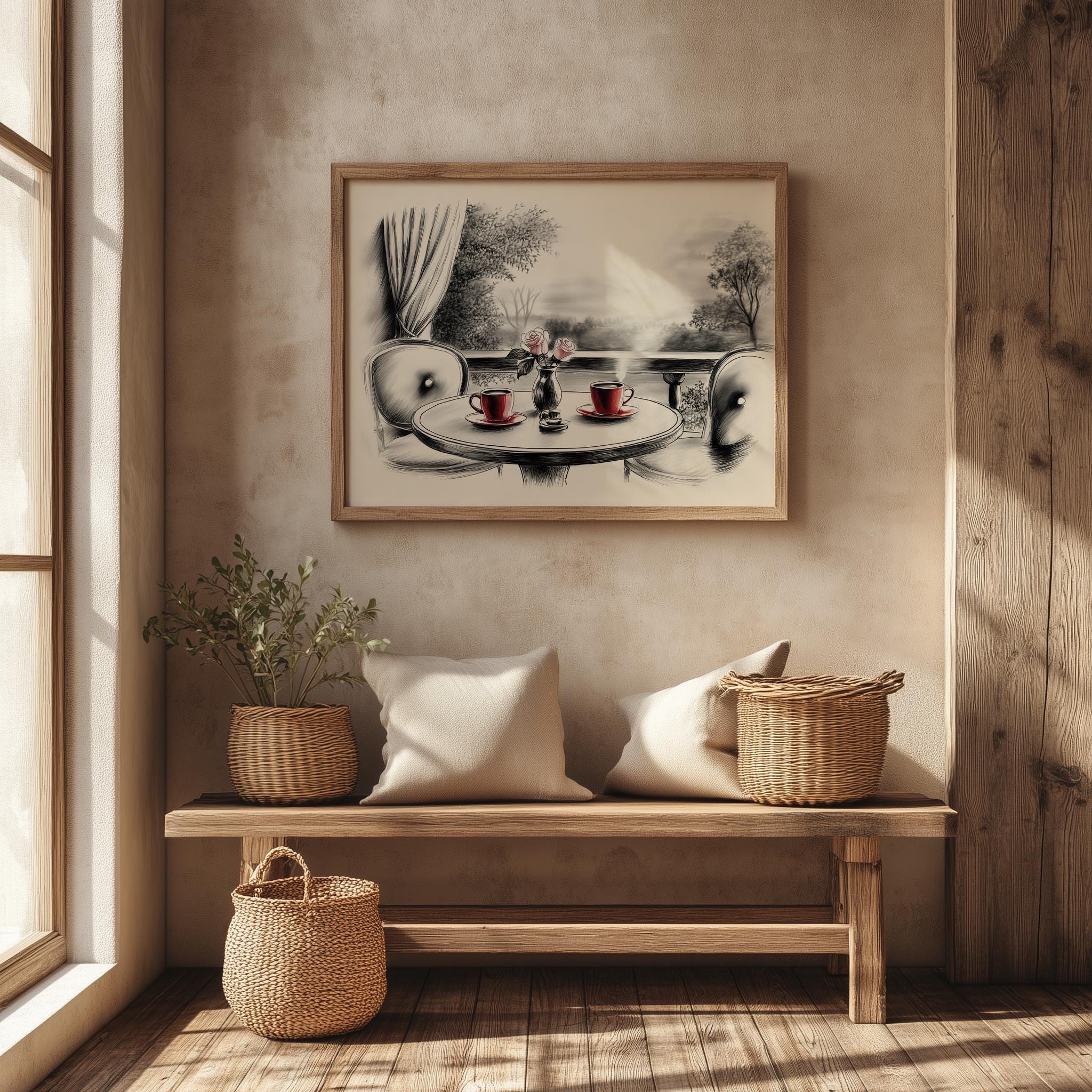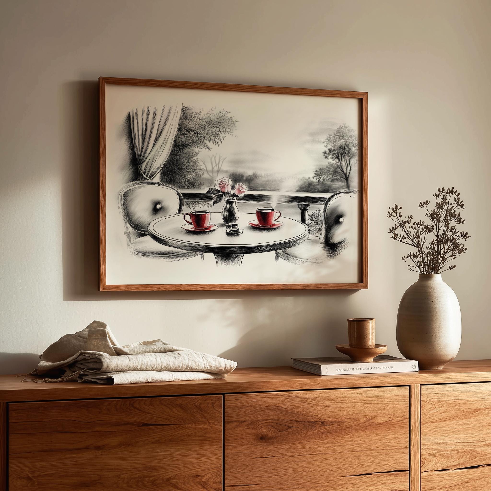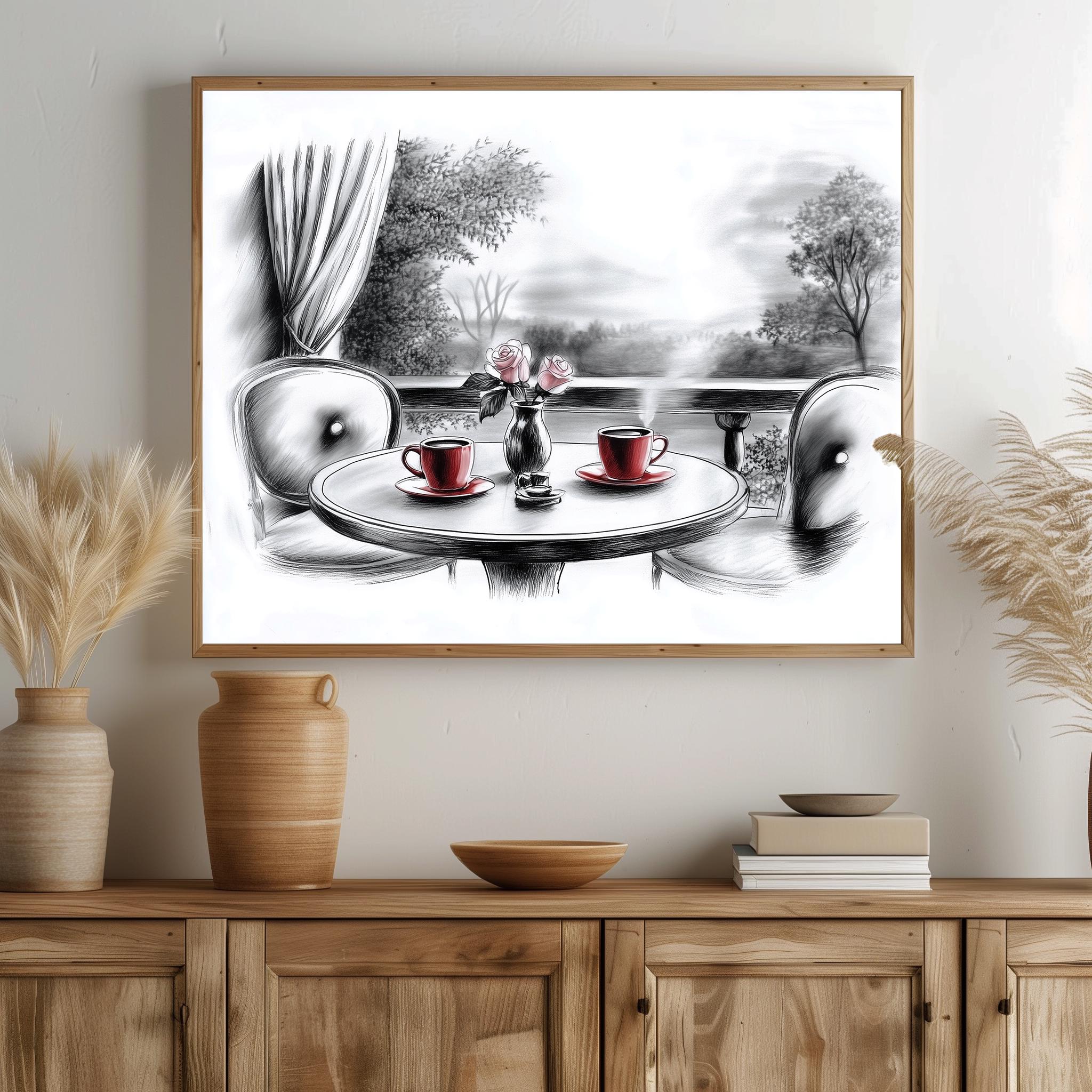 Immerse yourself in the charm with this rustic painting of a cozy café table set for two, adorned with vintage red mugs. An instantly downloadable print, it's perfect for elevating your decor with budget-friendly charm. This gives you the flexibility to customize the size, frame, and material according to your personal taste and space, ensuring a perfect fit for your walls.