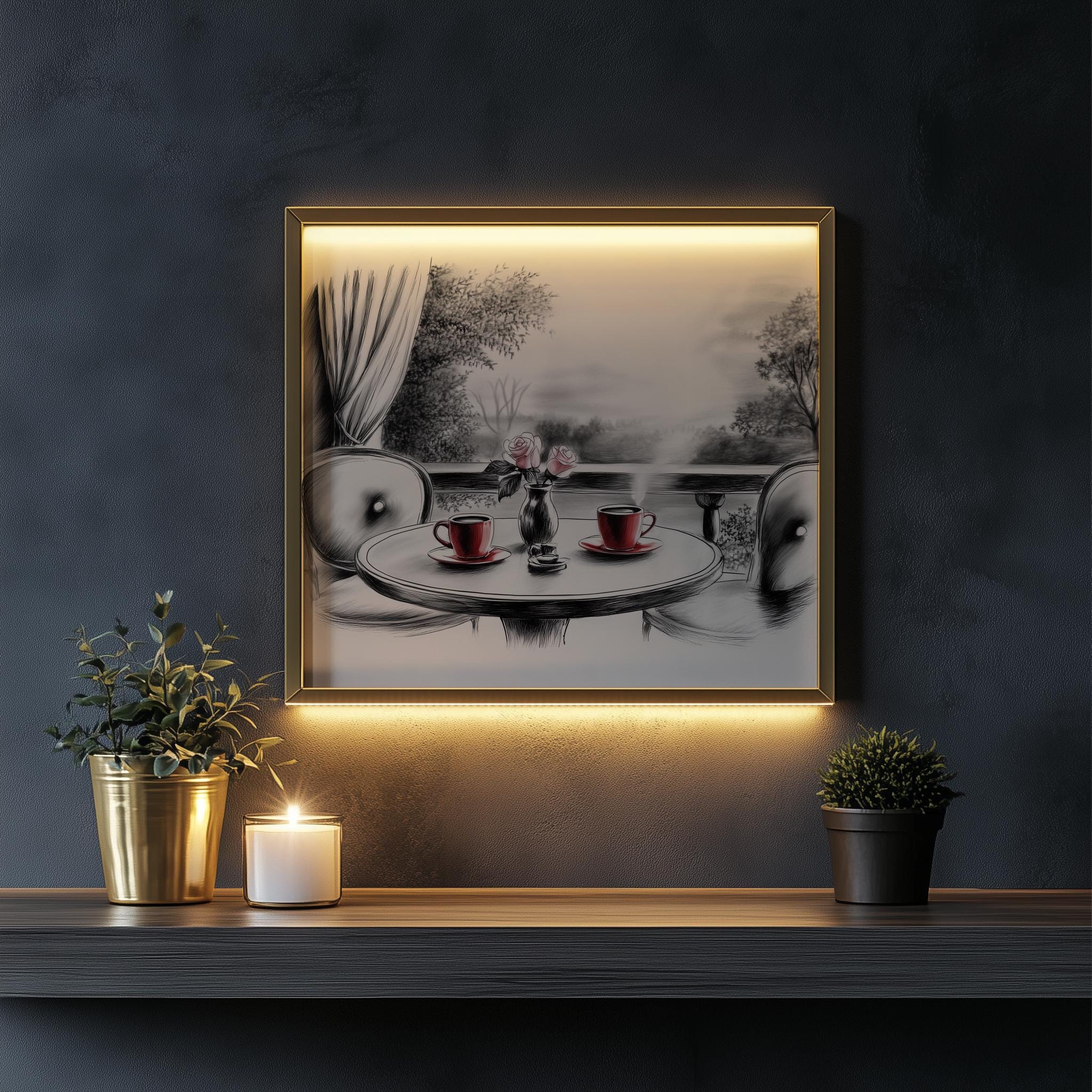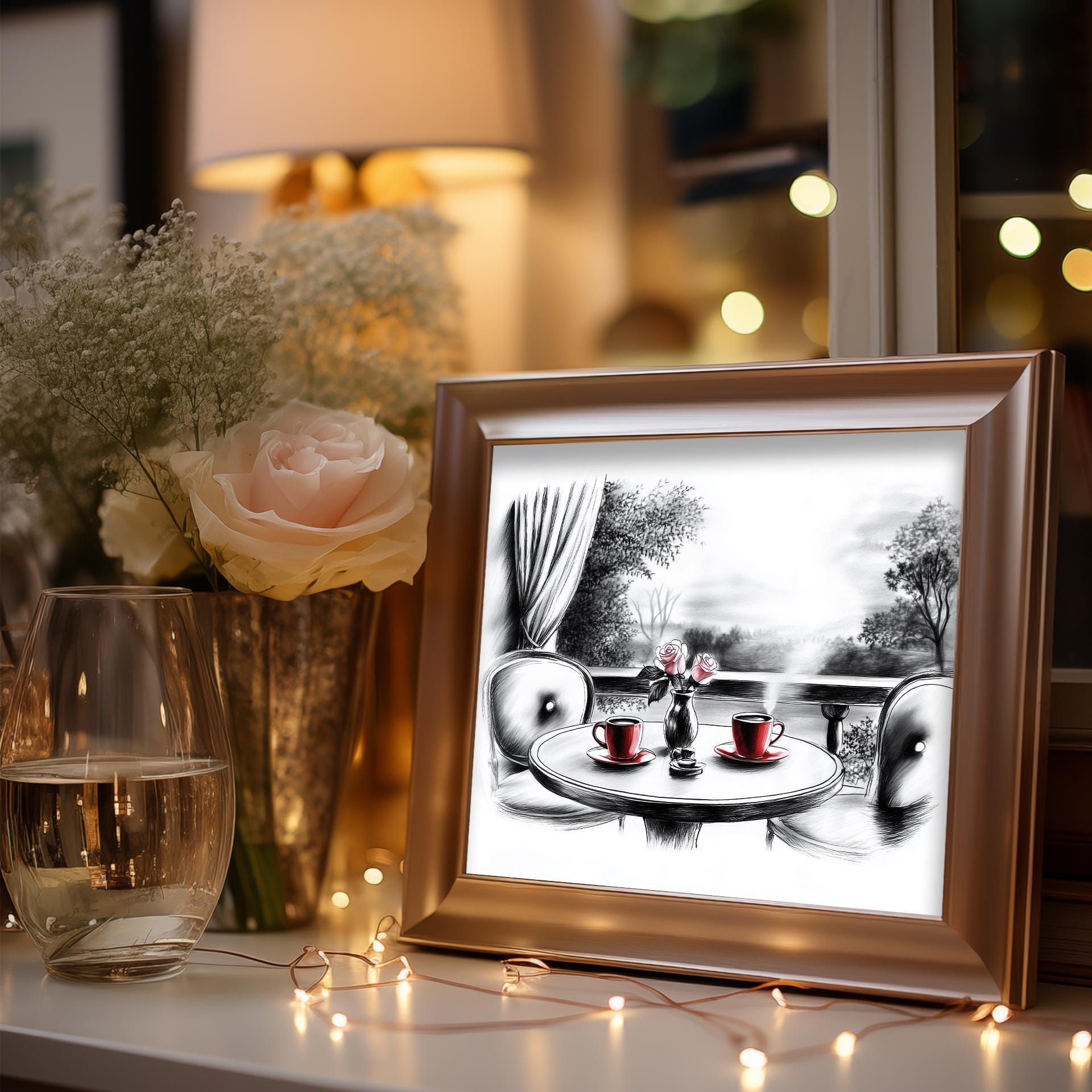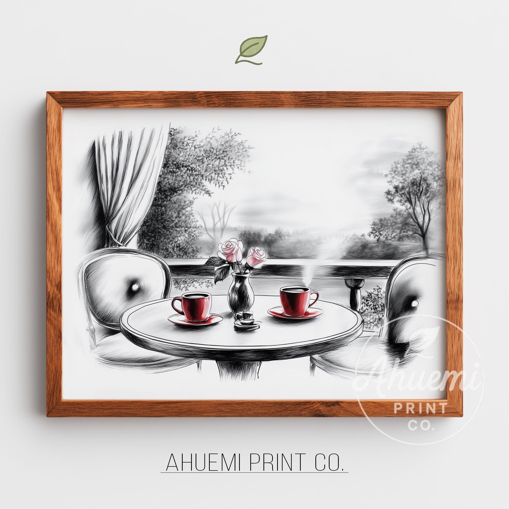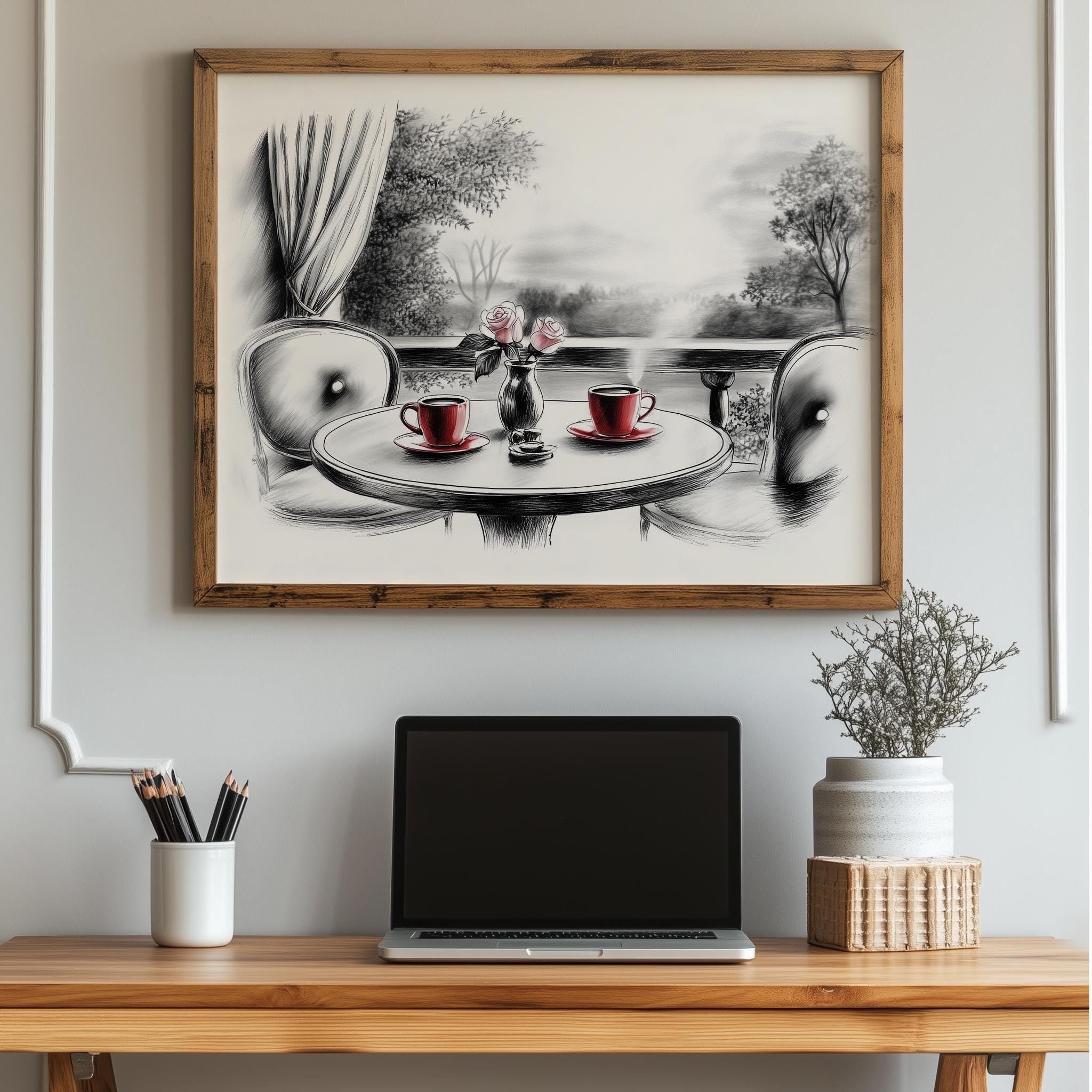 Immerse yourself in the charm with this rustic painting of a cozy café table set for two, adorned with vintage red mugs. An instantly downloadable print, it's perfect for elevating your decor with budget-friendly charm. This gives you the flexibility to customize the size, frame, and material according to your personal taste and space, ensuring a perfect fit for your walls.