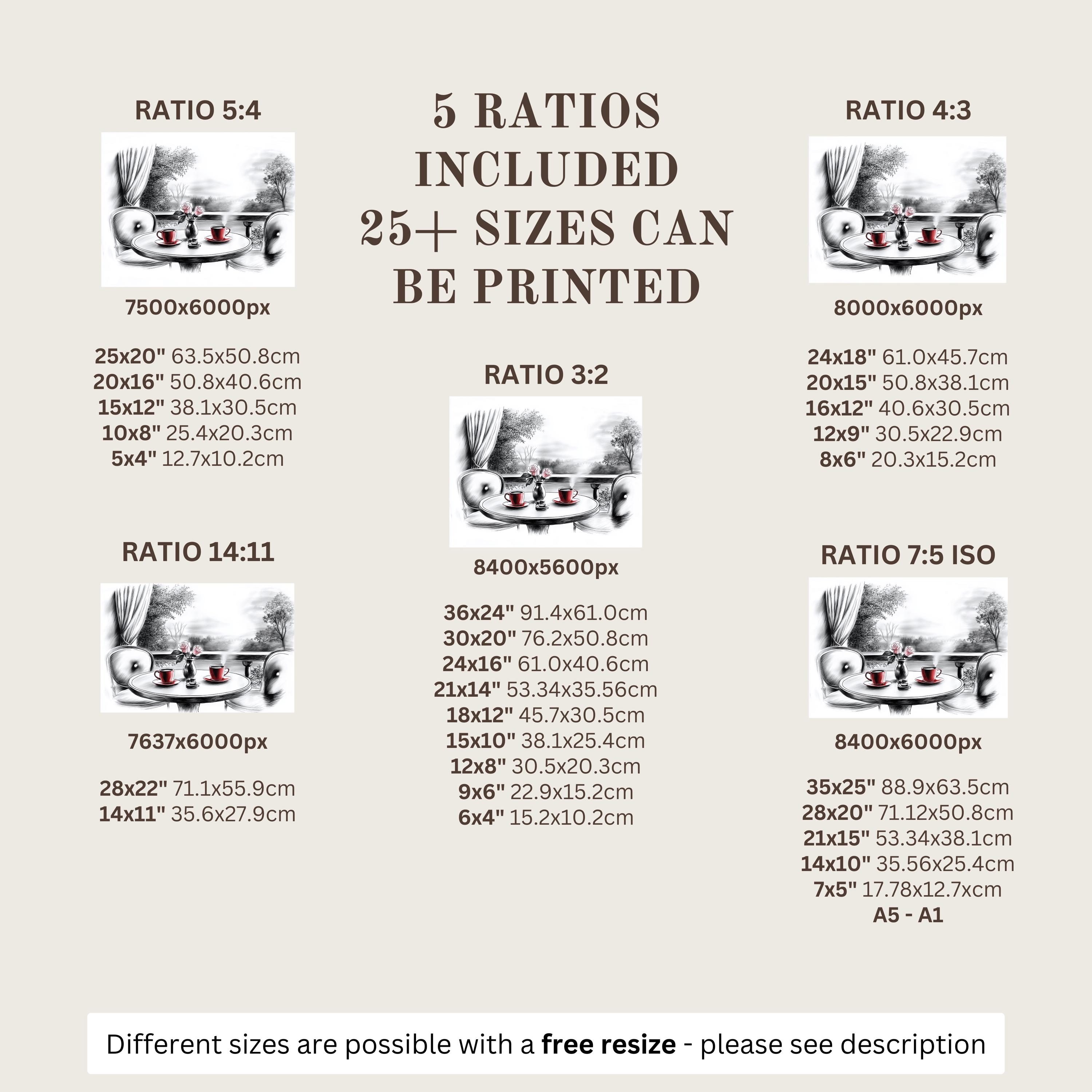 Each artwork includes 5 aspect ratios with 25+ print sizes. Most standard frames are covered. One custom resize per purchase available—message before ordering.