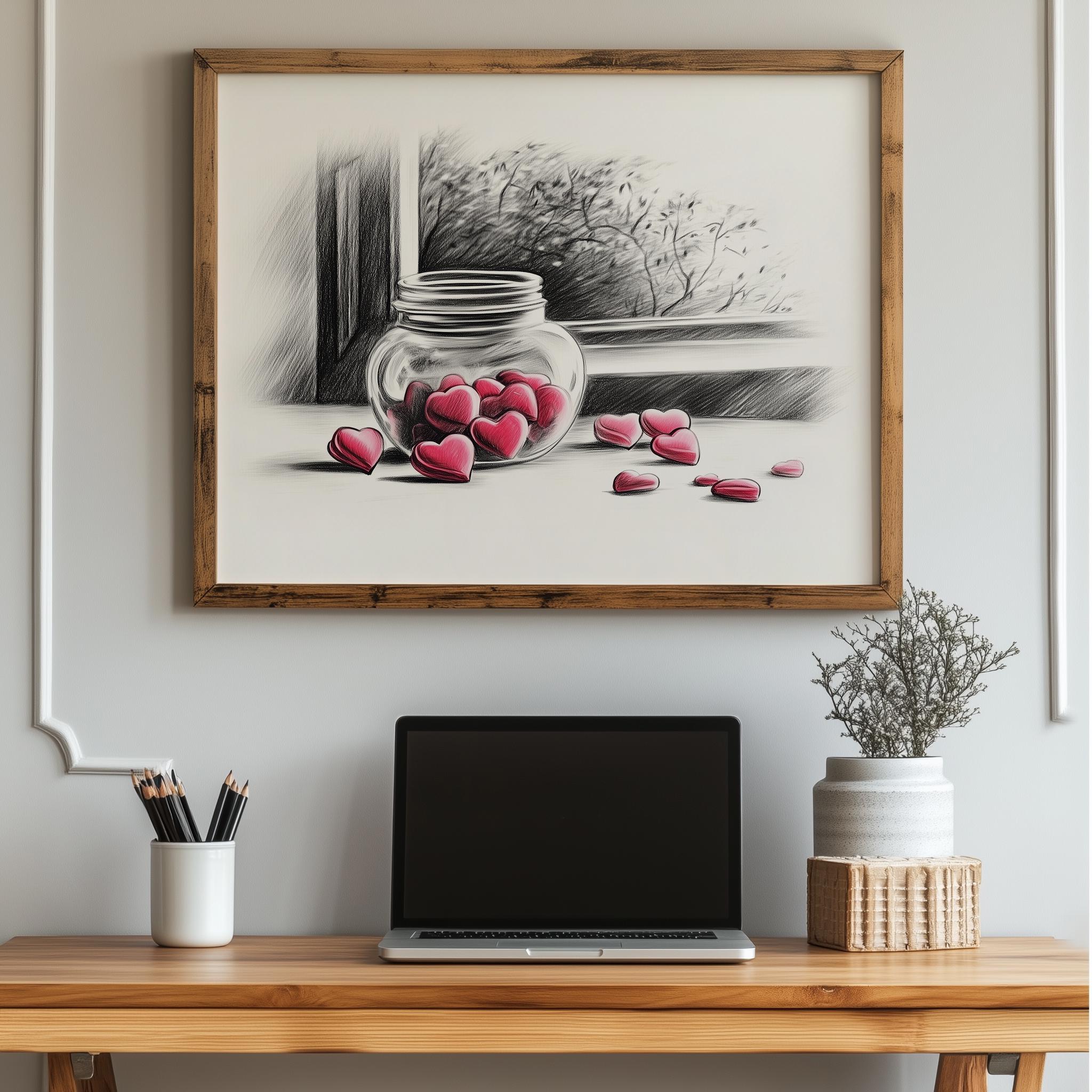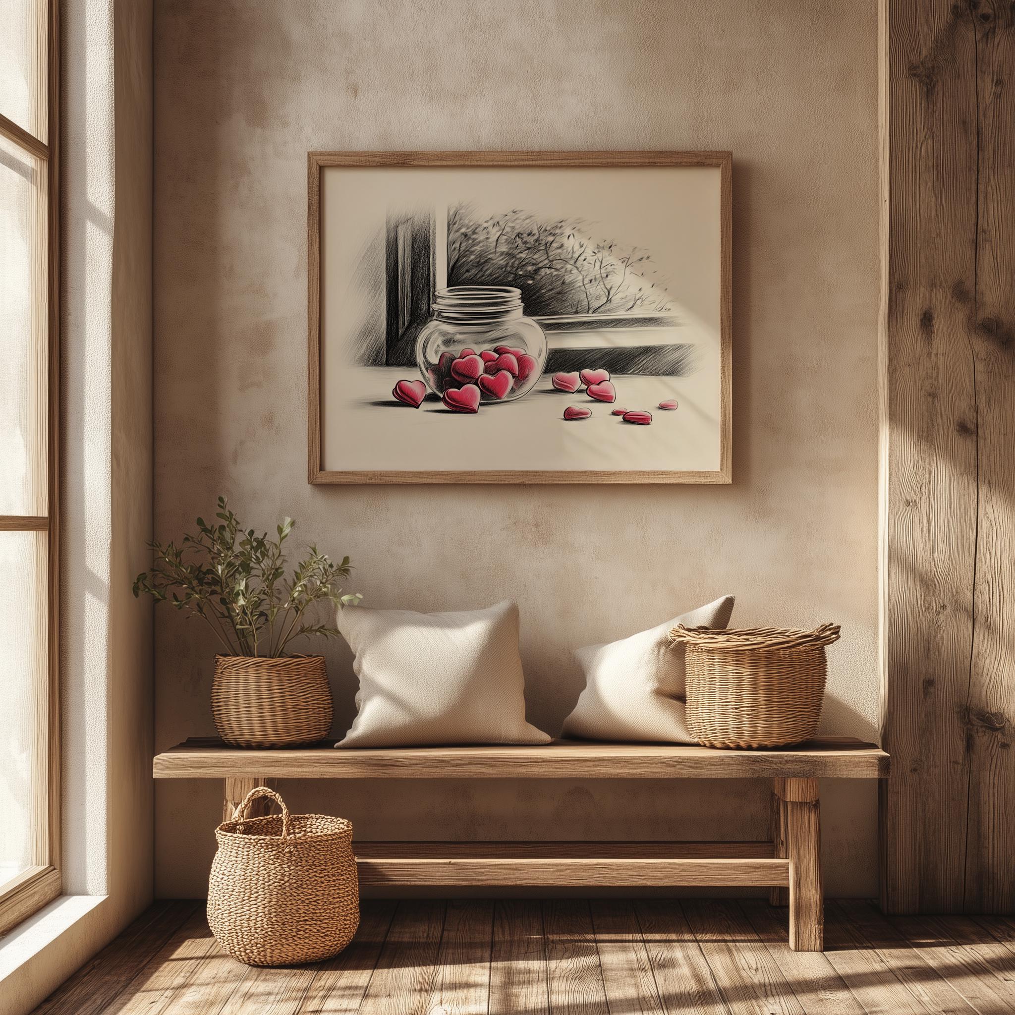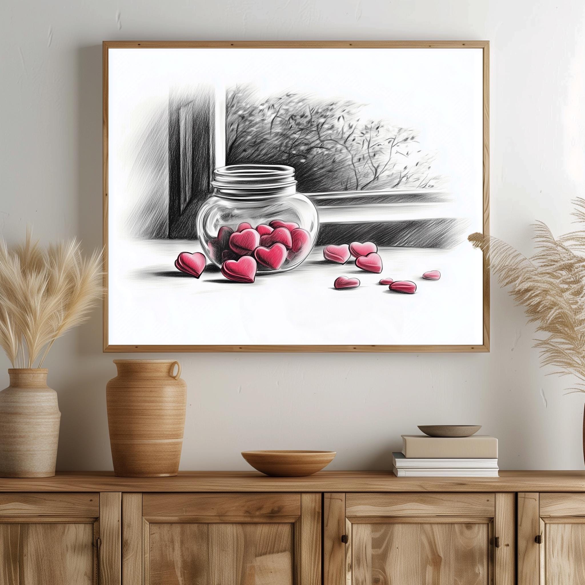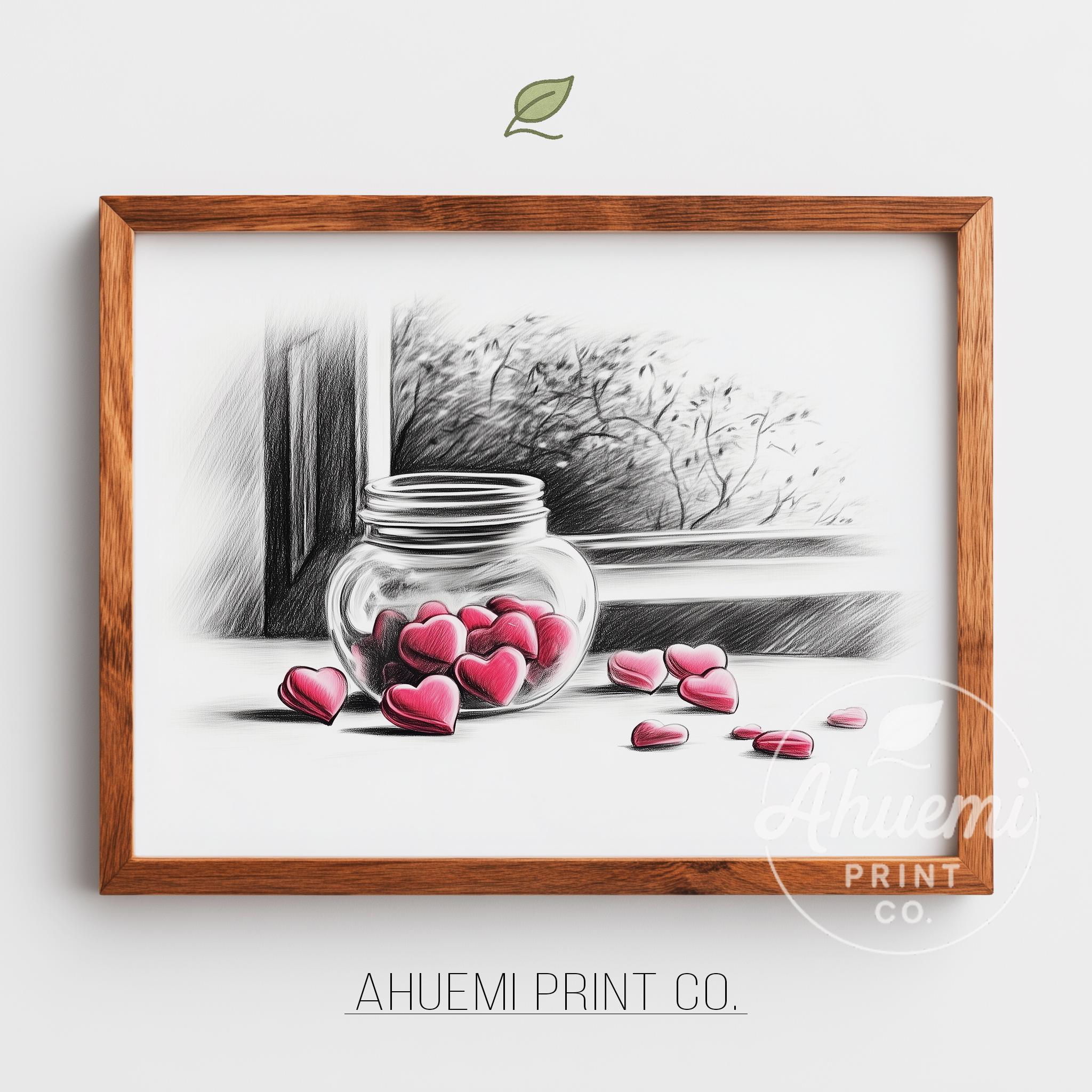 Immerse yourself in the charm with this rustic painting of a delightful jar filled with heart-shaped candies. An instantly downloadable print, it's perfect for elevating your decor with budget-friendly charm. This gives you the flexibility to customize the size, frame, and material according to your personal taste and space, ensuring a perfect fit for your walls.