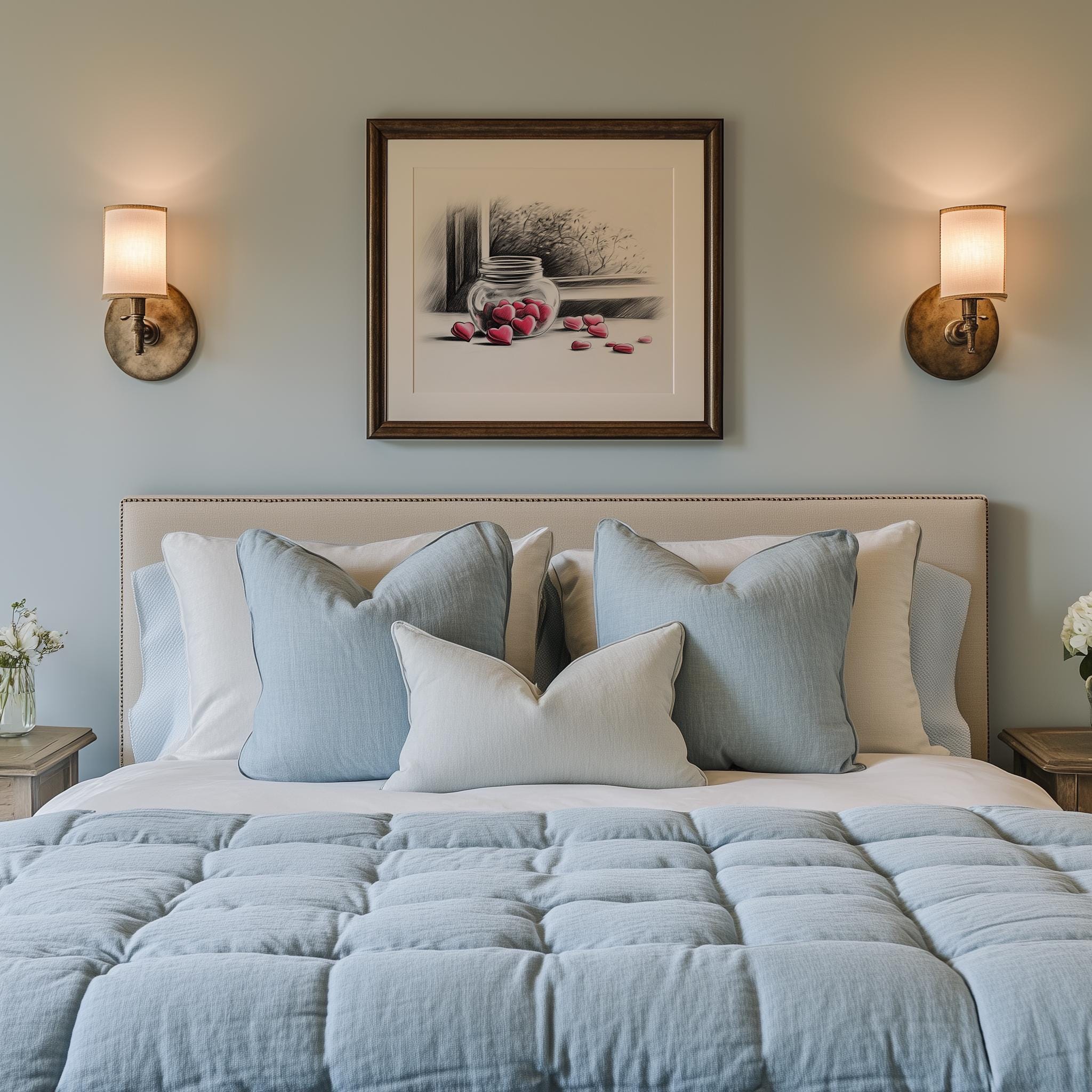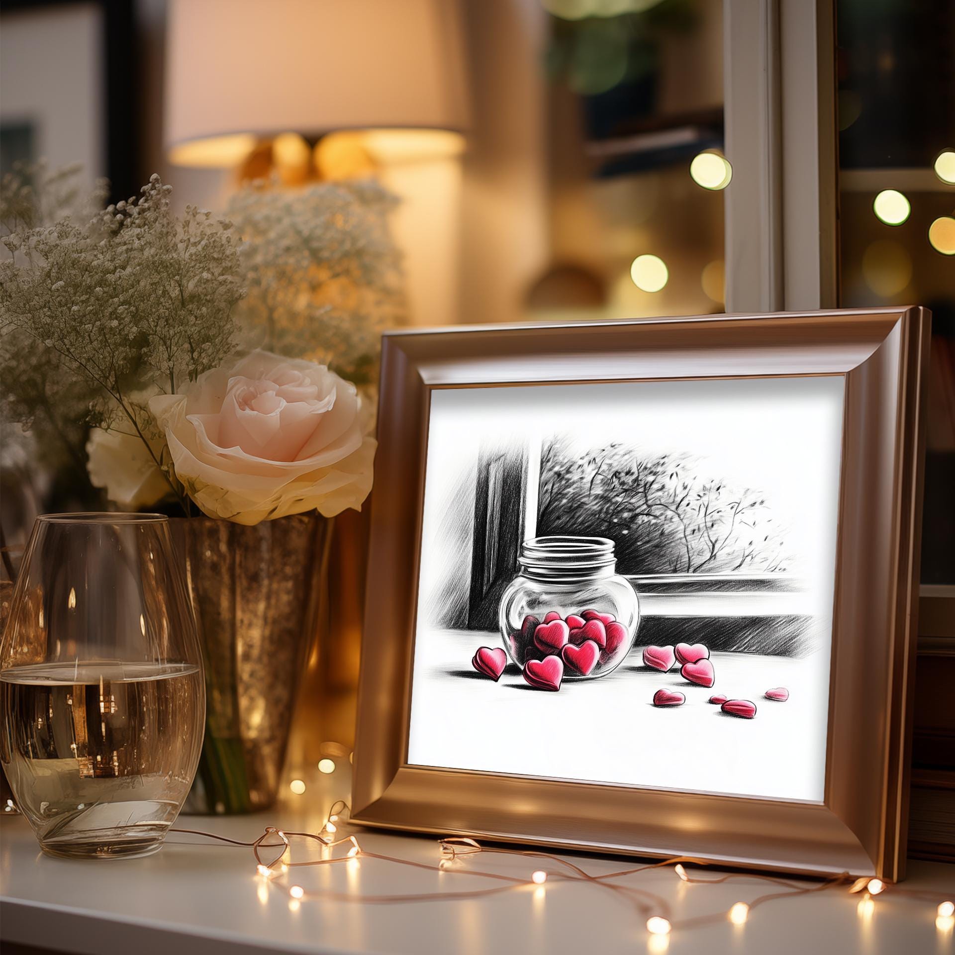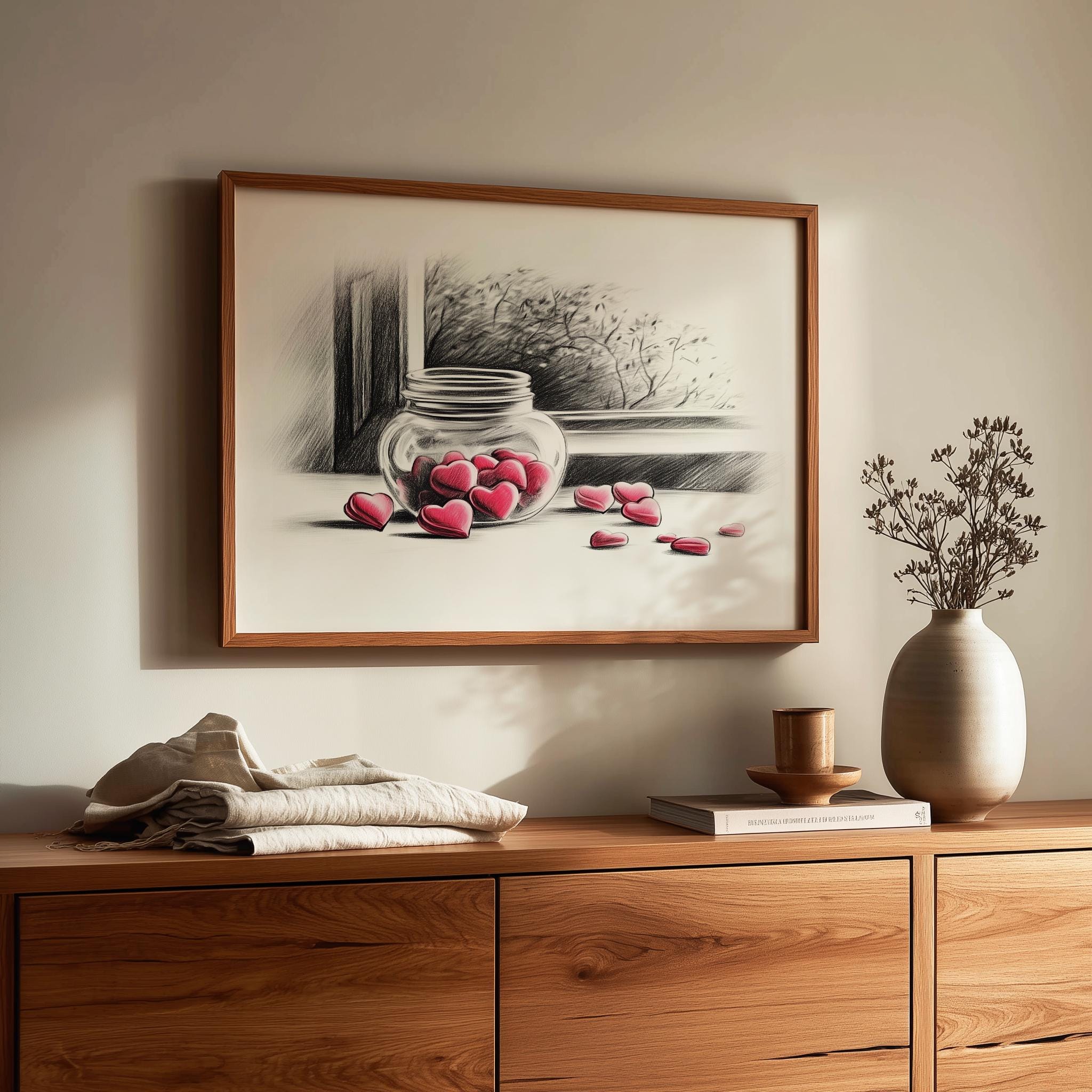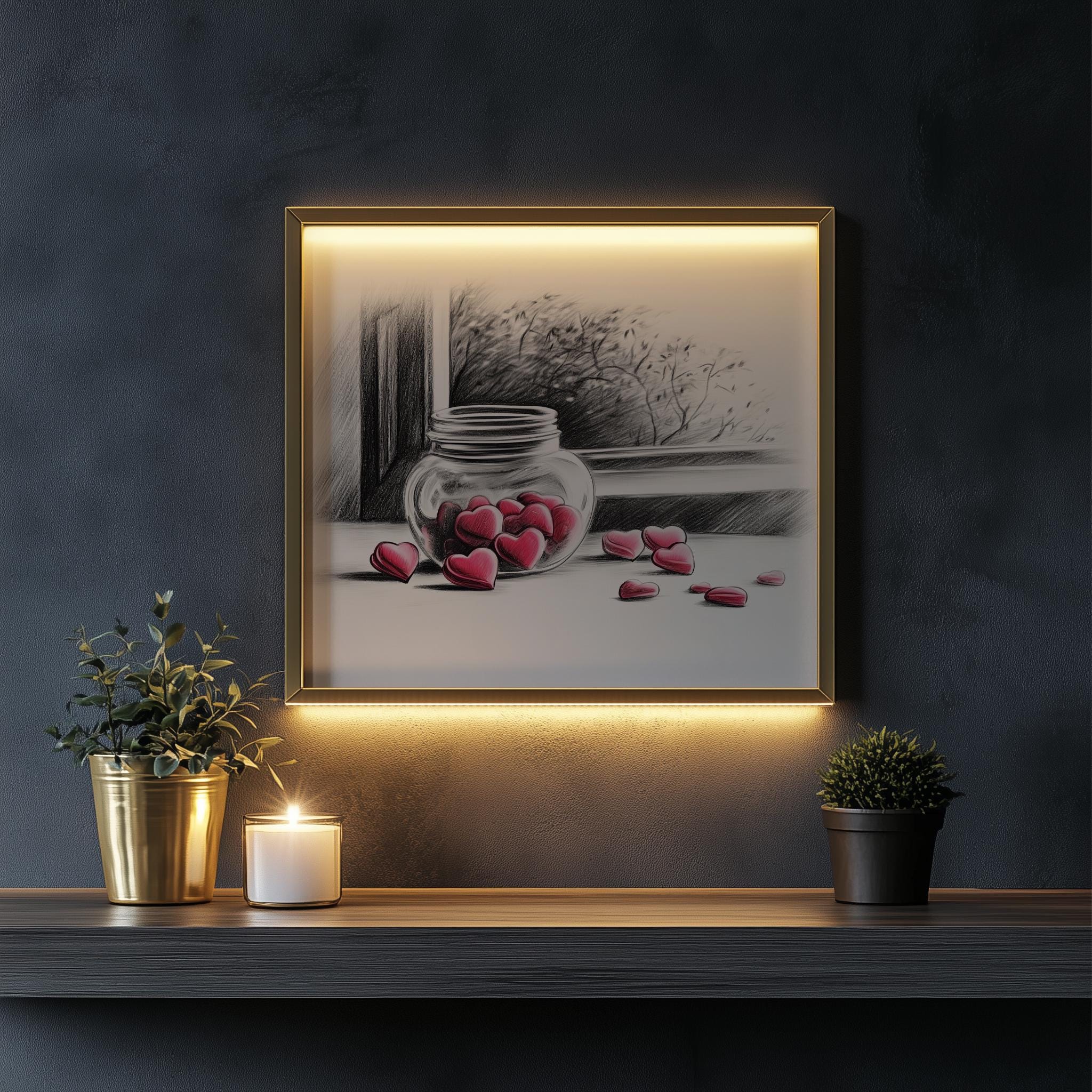 Immerse yourself in the charm with this rustic painting of a delightful jar filled with heart-shaped candies. An instantly downloadable print, it's perfect for elevating your decor with budget-friendly charm. This gives you the flexibility to customize the size, frame, and material according to your personal taste and space, ensuring a perfect fit for your walls.