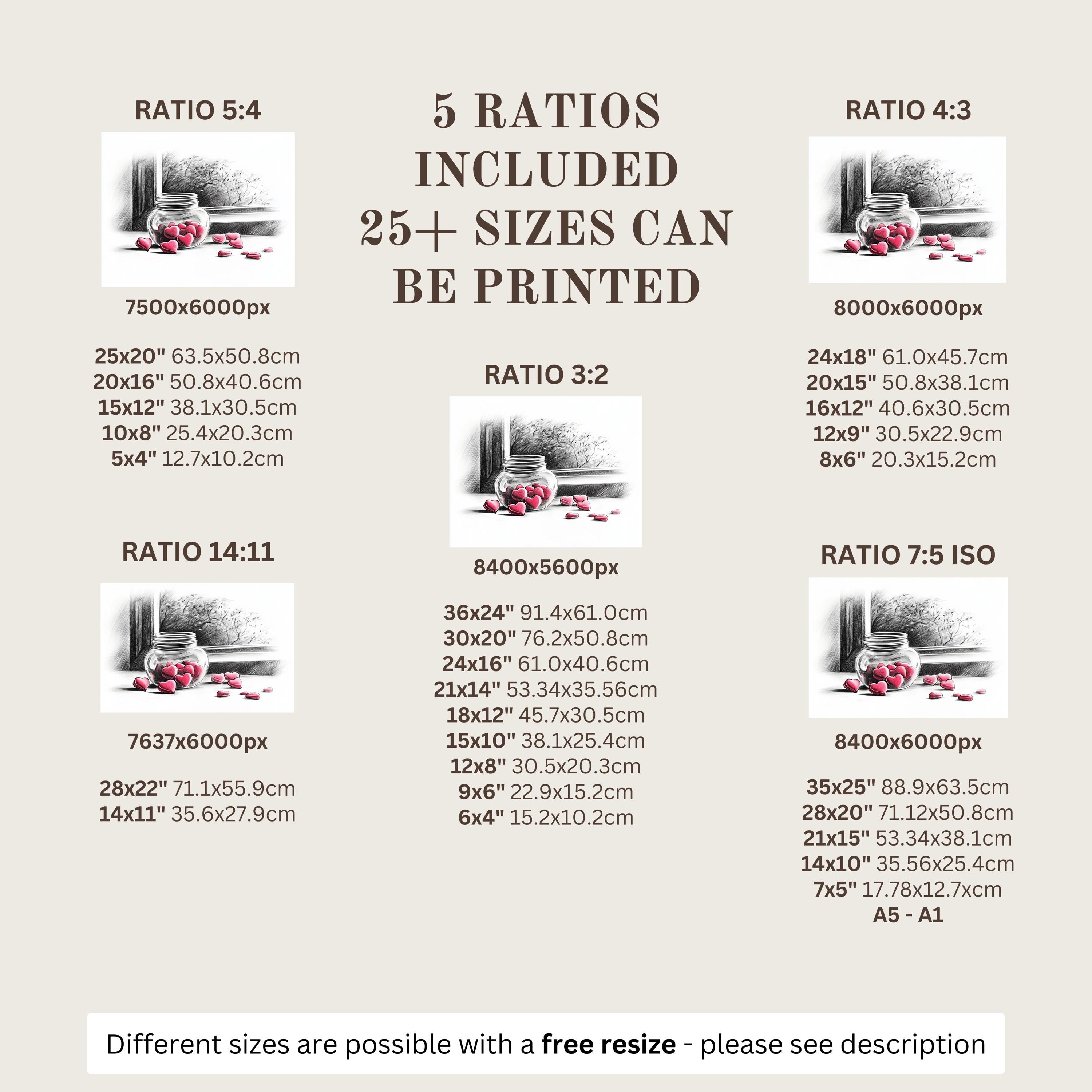 Each artwork includes 5 aspect ratios with 25+ print sizes. Most standard frames are covered. One custom resize per purchase available—message before ordering.