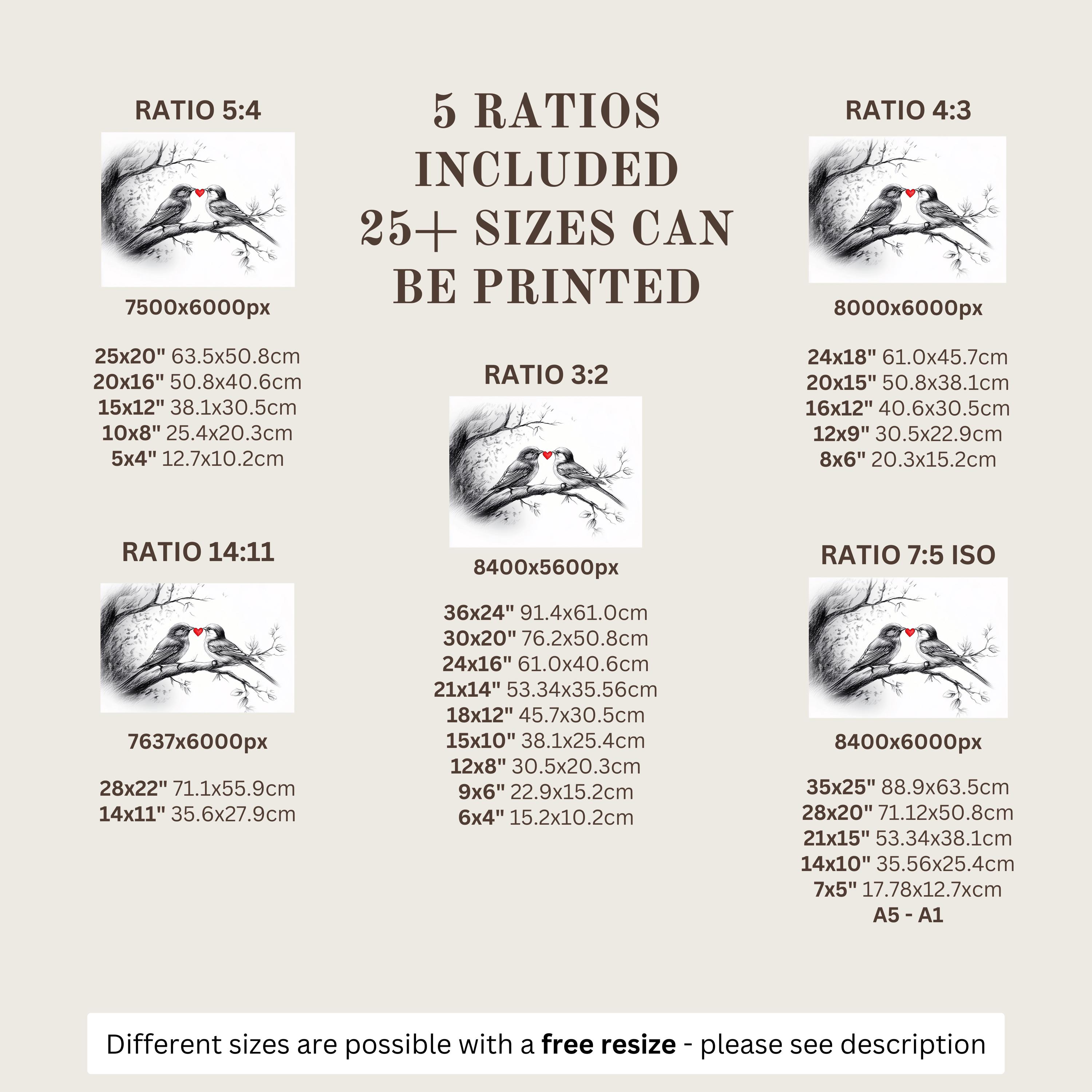 Each artwork includes 5 aspect ratios with 25+ print sizes. Most standard frames are covered. One custom resize per purchase available—message before ordering.