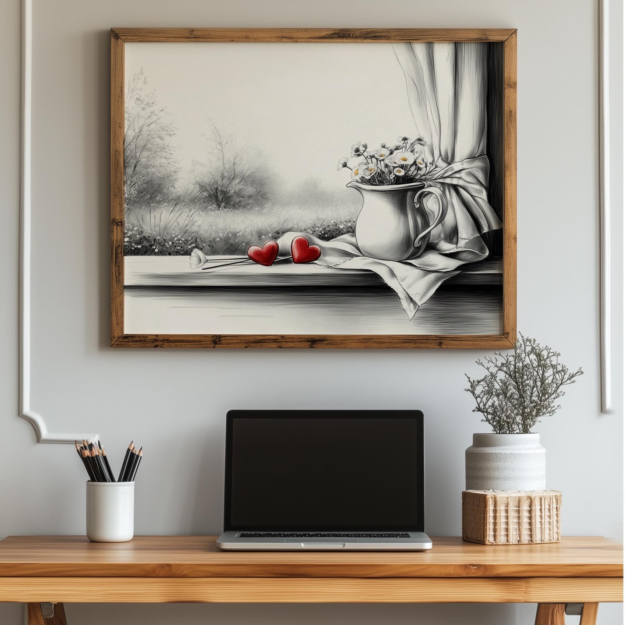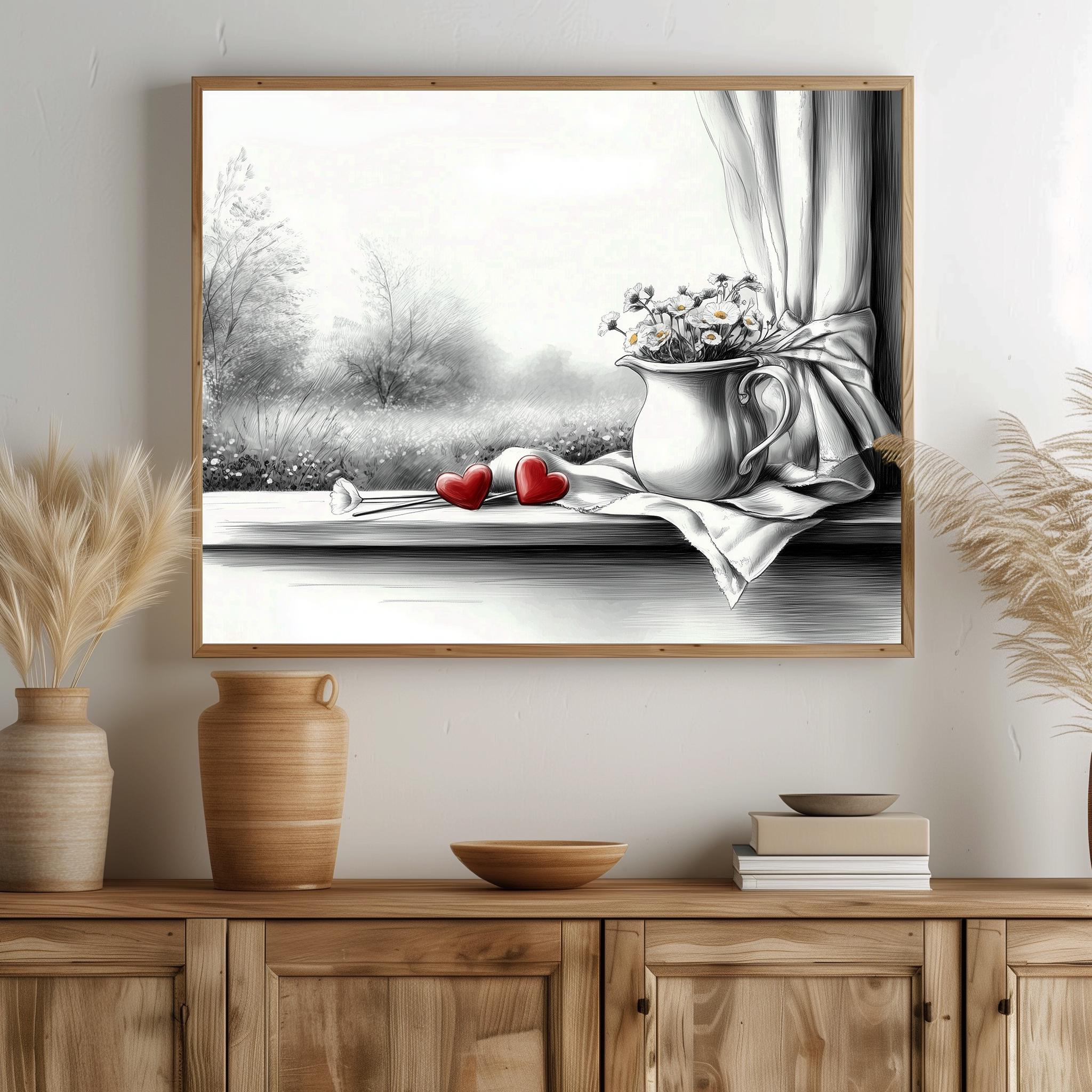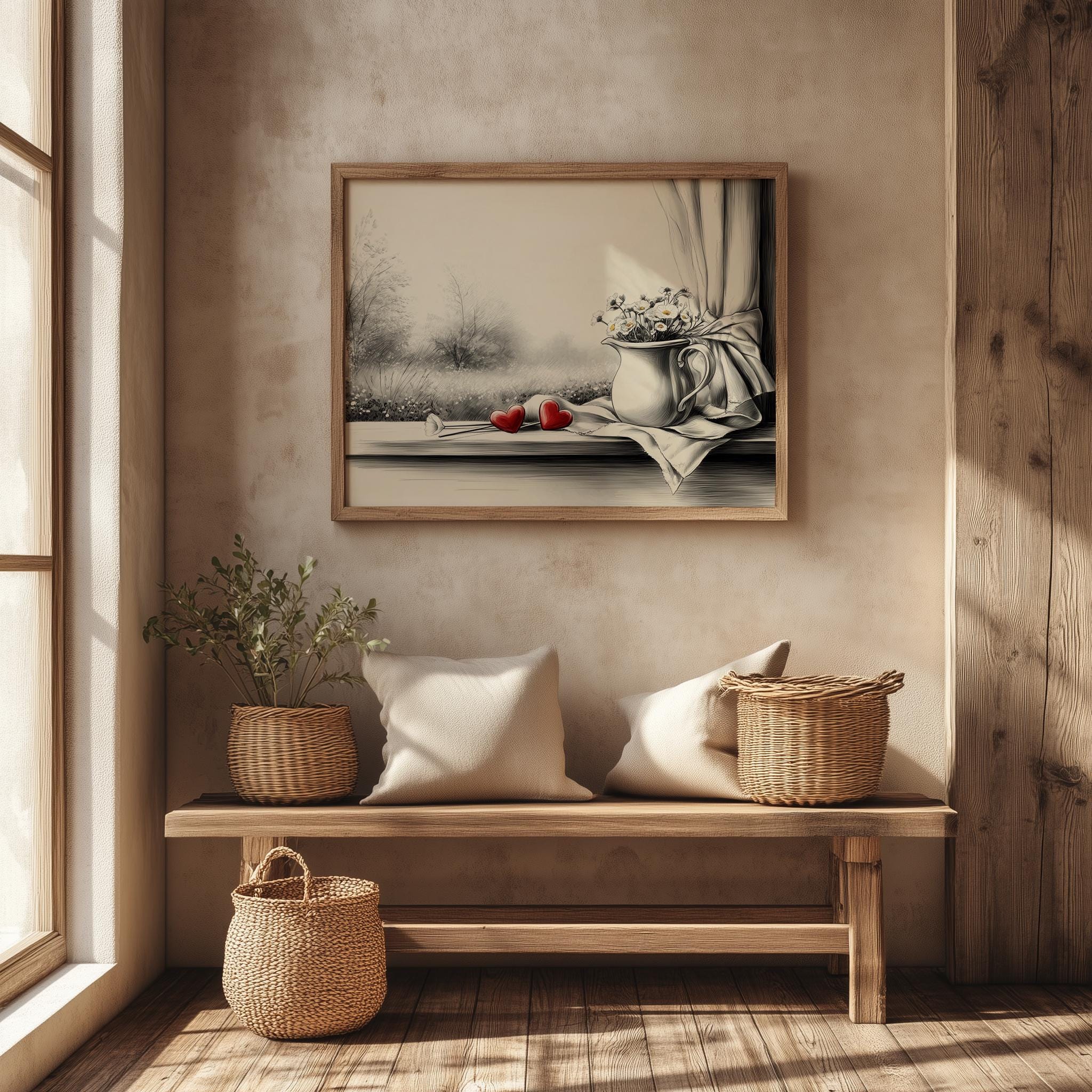 Immerse yourself in the charm with this rustic painting of a cozy white enamel pitcher filled with heart-shaped lollipops. An instantly downloadable print, it's perfect for elevating your decor with budget-friendly charm. This gives you the flexibility to customize the size, frame, and material according to your personal taste and space, ensuring a perfect fit for your walls.